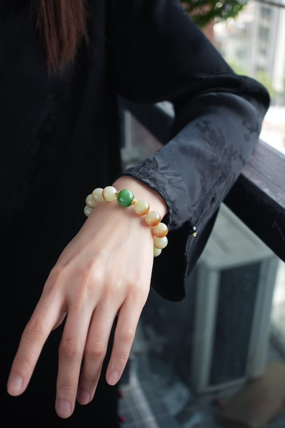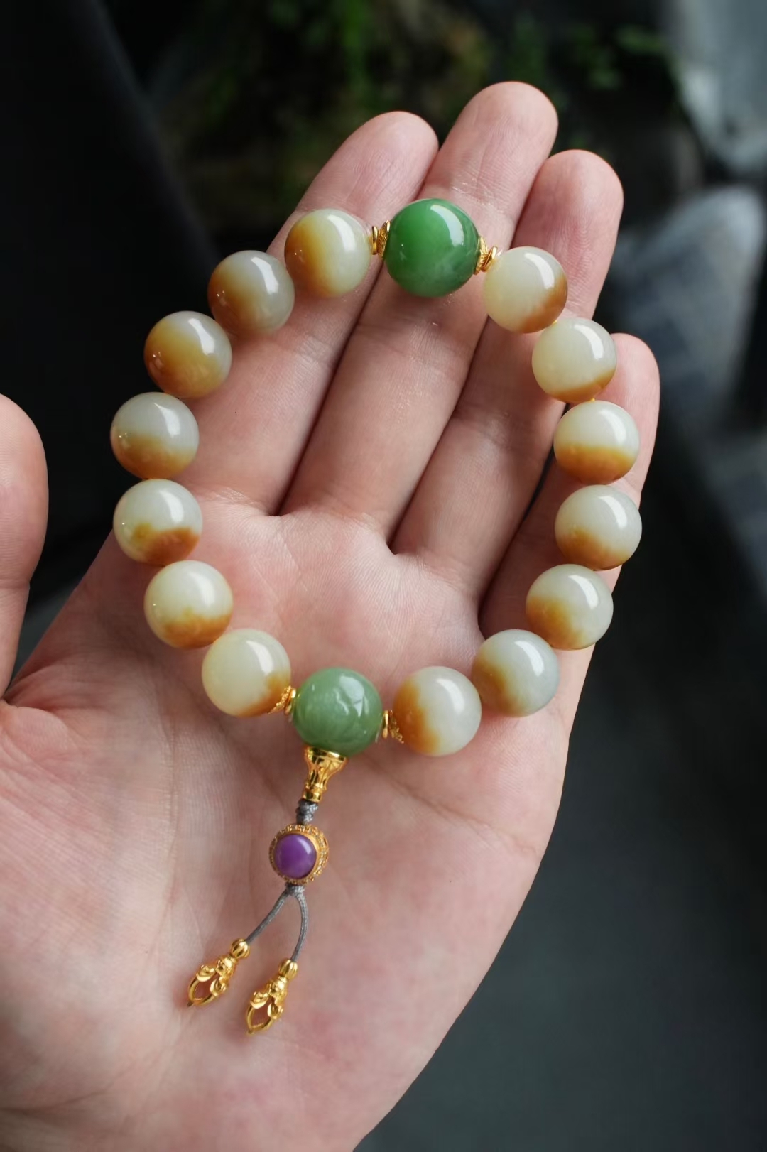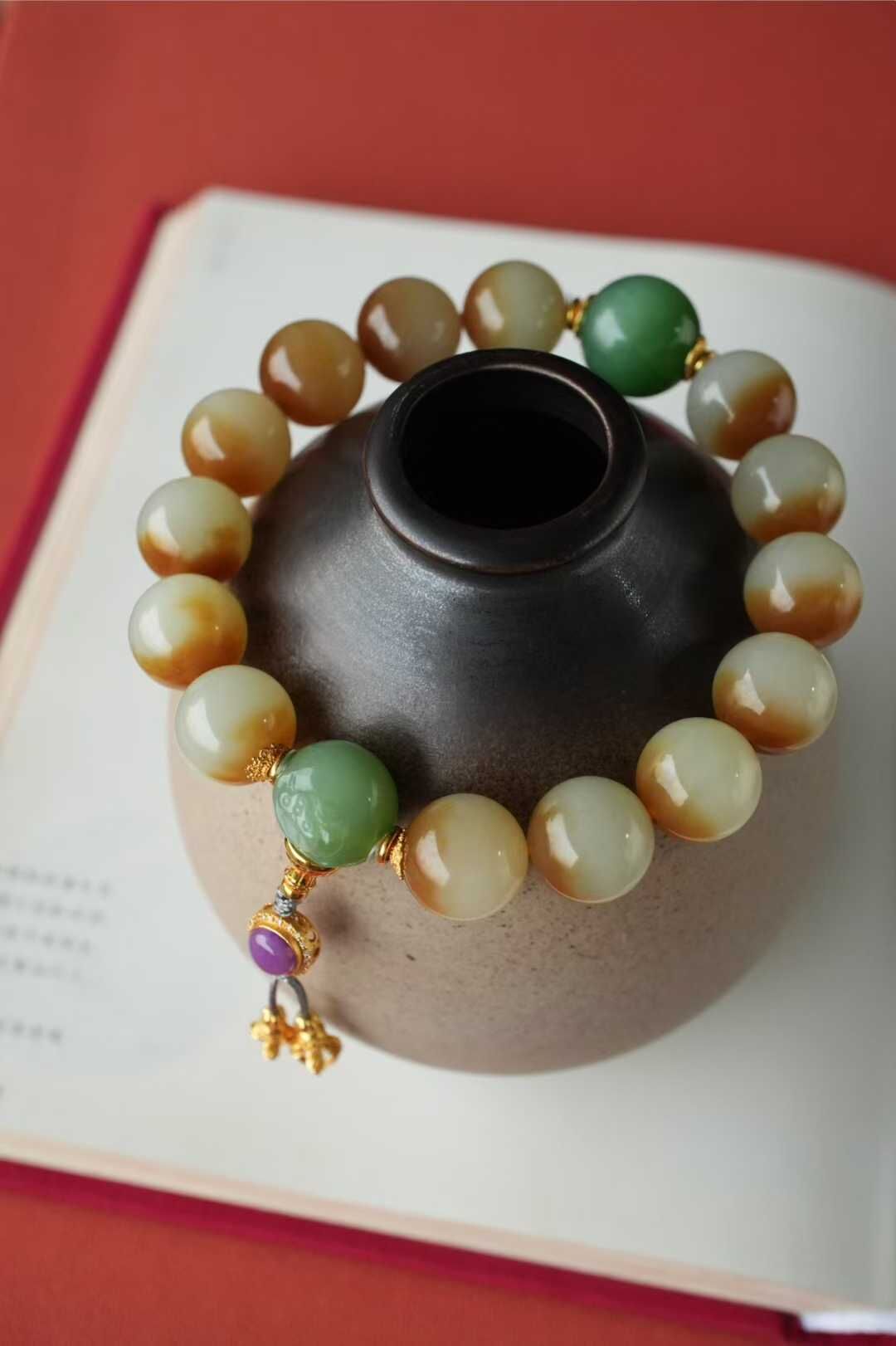 • 和田玉且末糖白料聚寶盆手串 (12mm直徑),天然和田玉軟玉