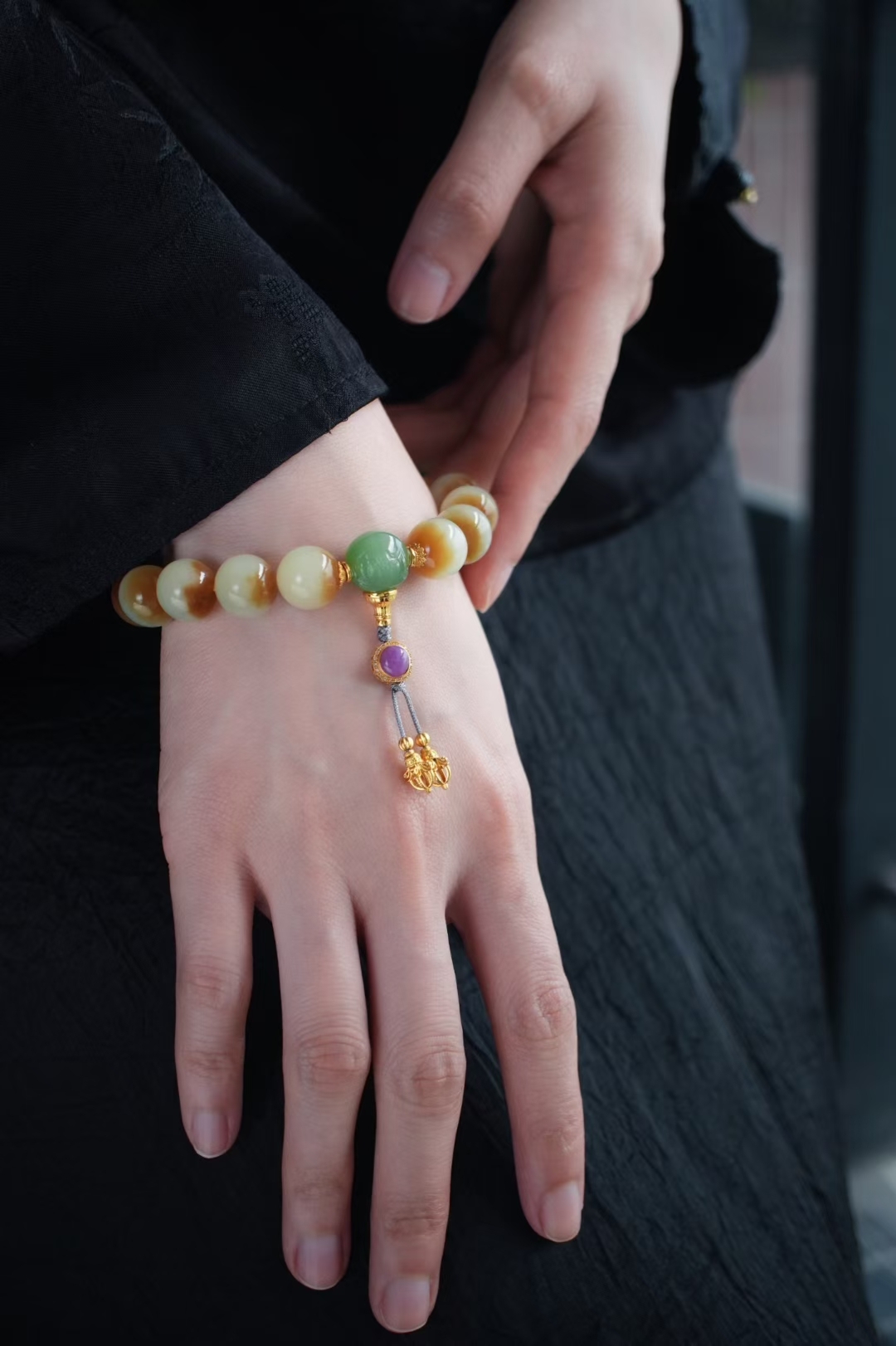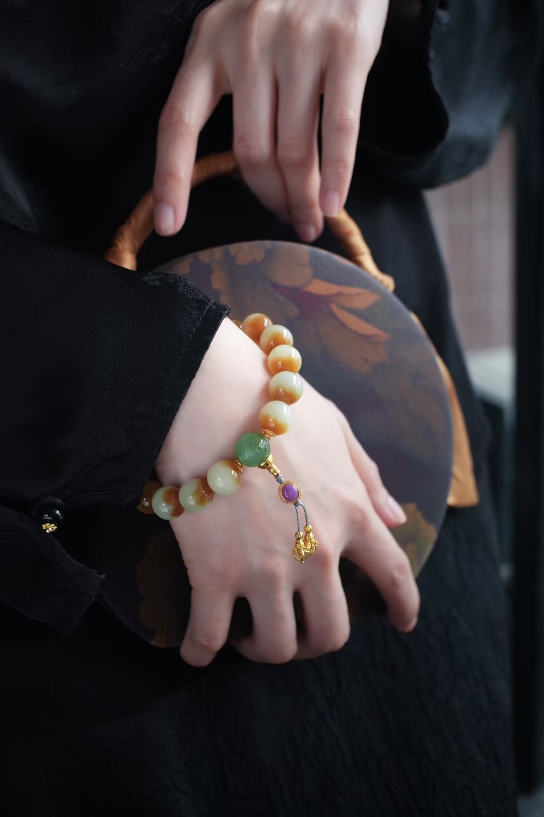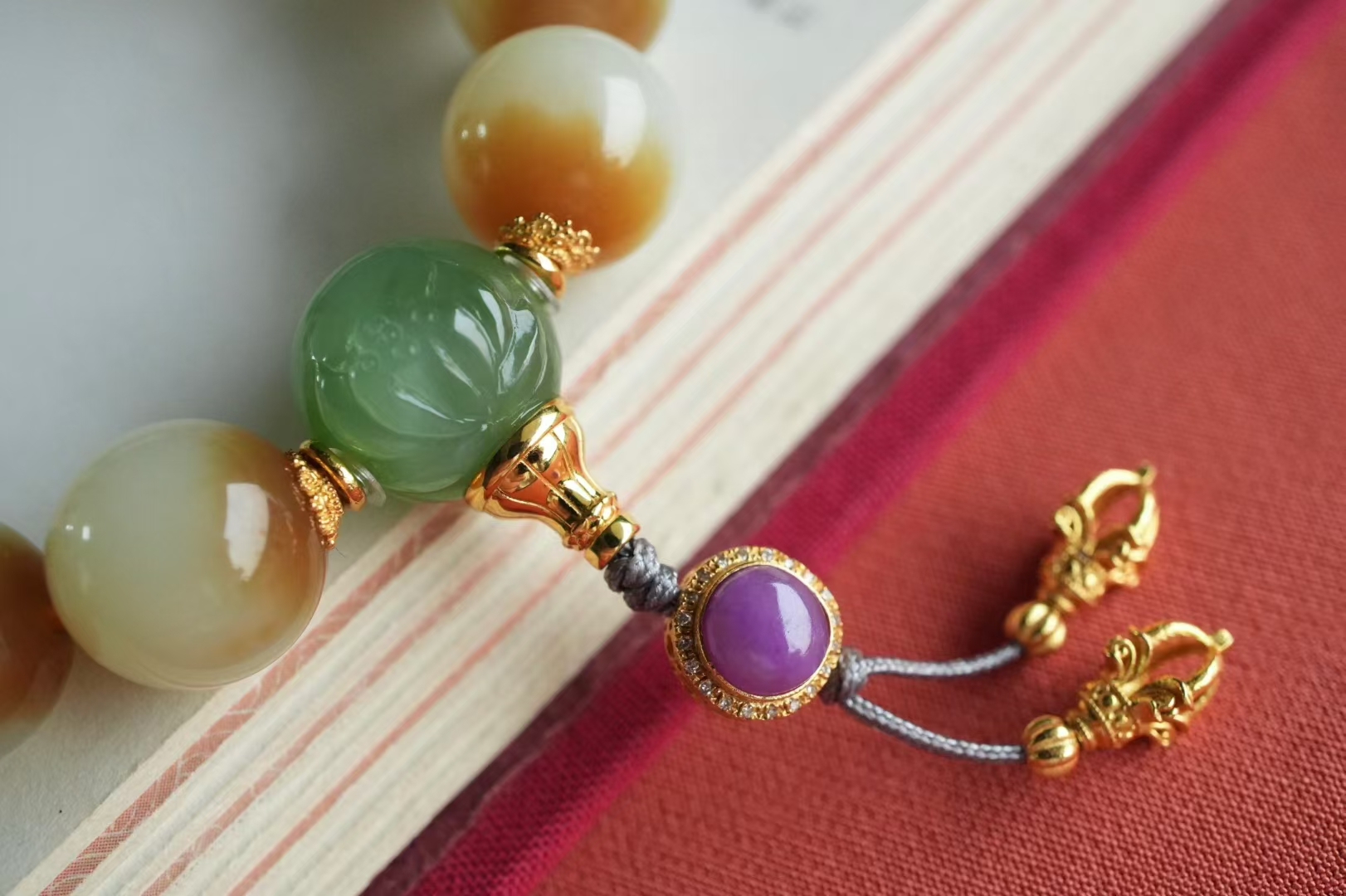 搭配約13.5mm的高品質俄料碧玉圓珠,雕刻蓮花珠自帶清雅禪意,18K金鑲舒俱來蛋面更添華貴點睛,整套搭配將溫柔與貴氣平衡得恰到好處,聚寶盆寓意招財納福,天然好料自帶高級感,配飾均為18K金。