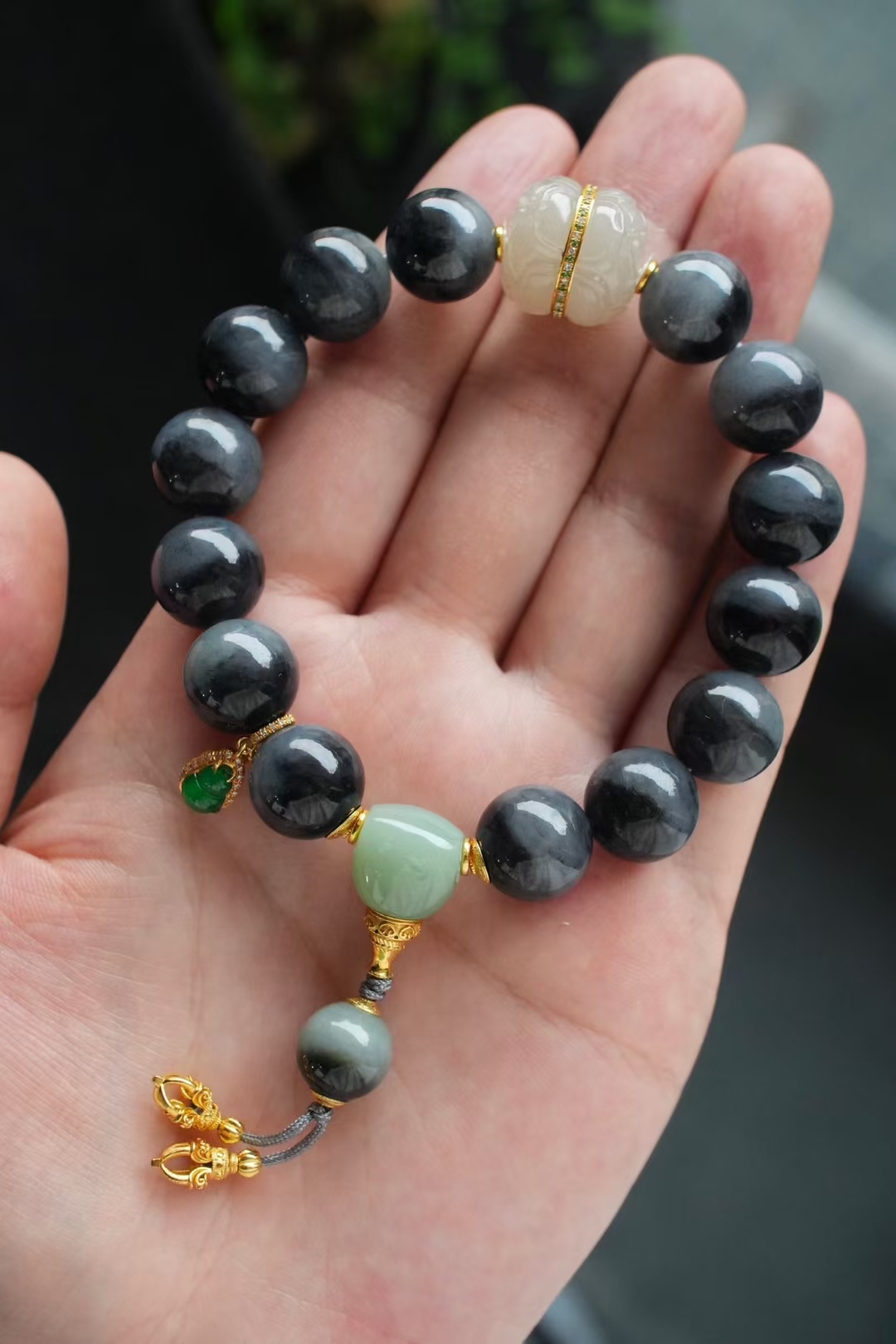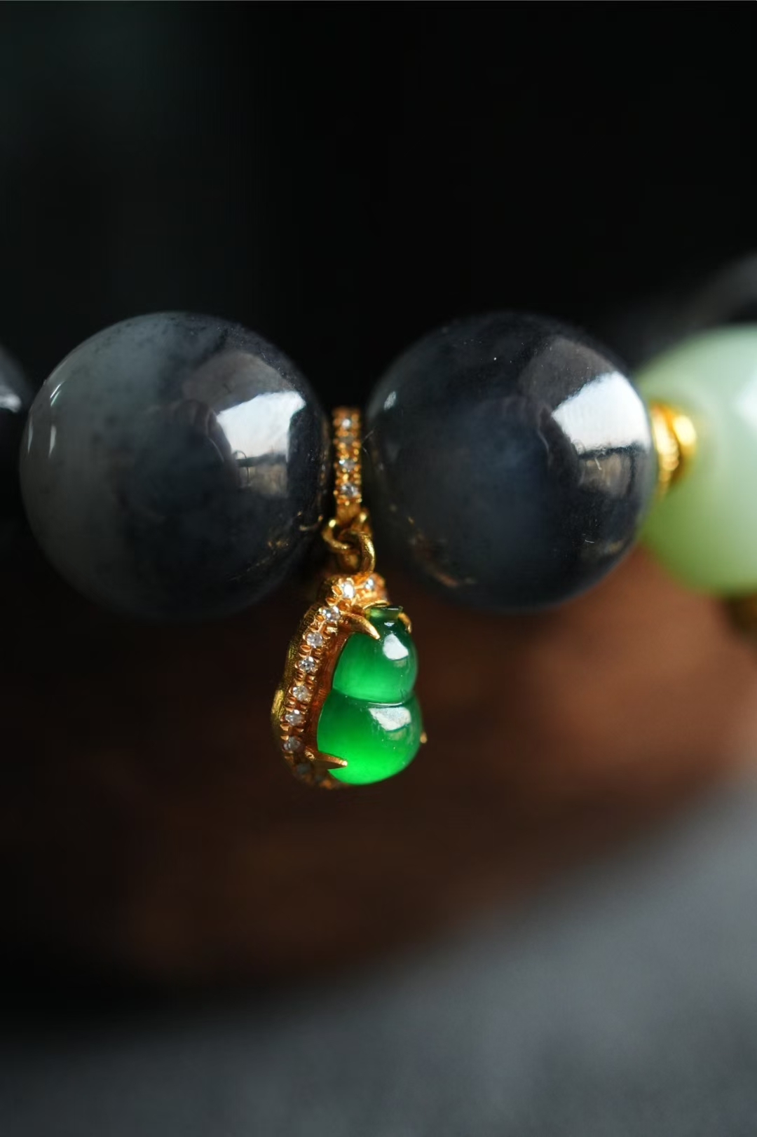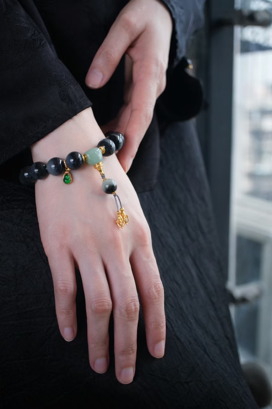 隨著時間的推移,會越盤越油,搭配大顆粒18K金精品藕粉並蒂蓮(約14*14.5mm)和田玉三通18K金翡翠葫蘆等金配飾點睛,濃淡相宜又層次分明,墨色里藏著若隱若現的玉質光澤,抬手時墨白流轉,越品越有韻味。