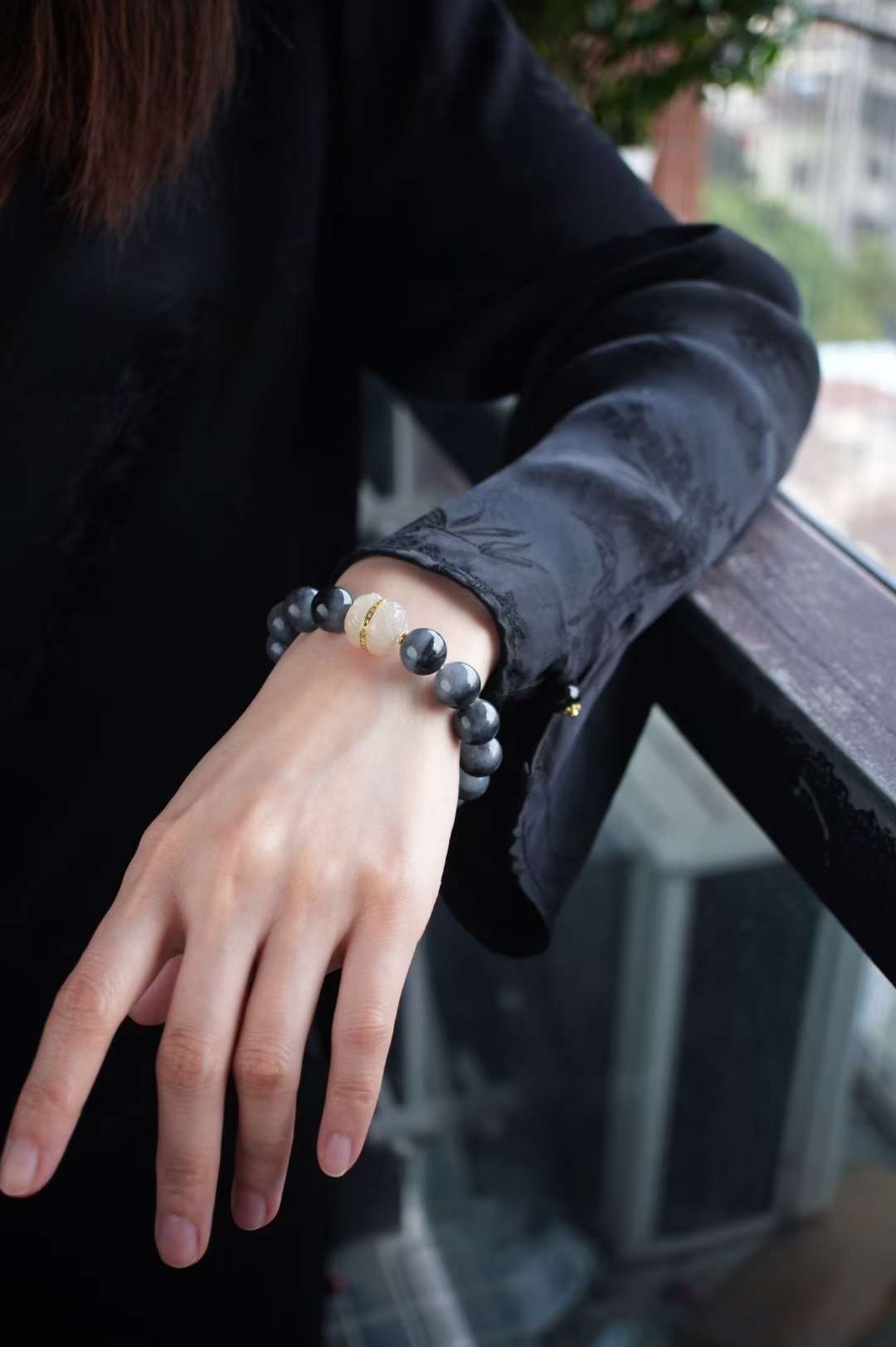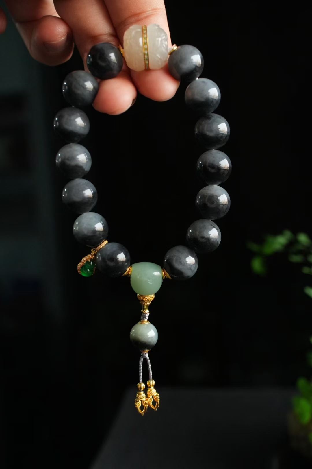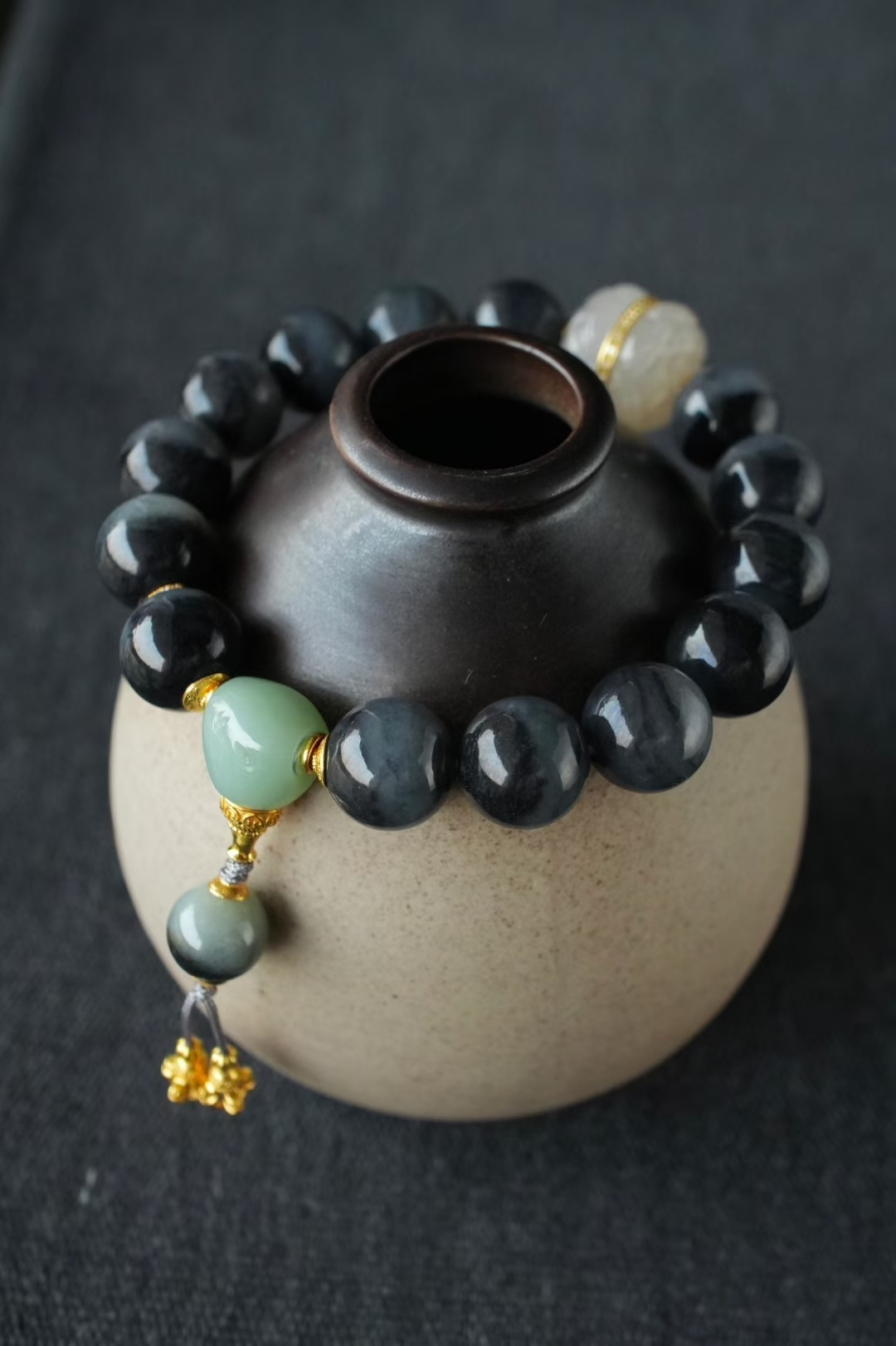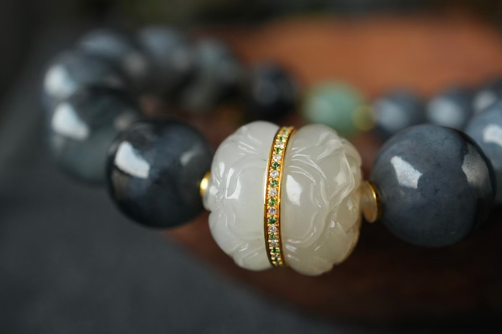 隨著時間的推移,會越盤越油,搭配大顆粒18K金精品藕粉並蒂蓮(約14*14.5mm)和田玉三通18K金翡翠葫蘆等金配飾點睛,濃淡相宜又層次分明,墨色里藏著若隱若現的玉質光澤,抬手時墨白流轉,越品越有韻味。