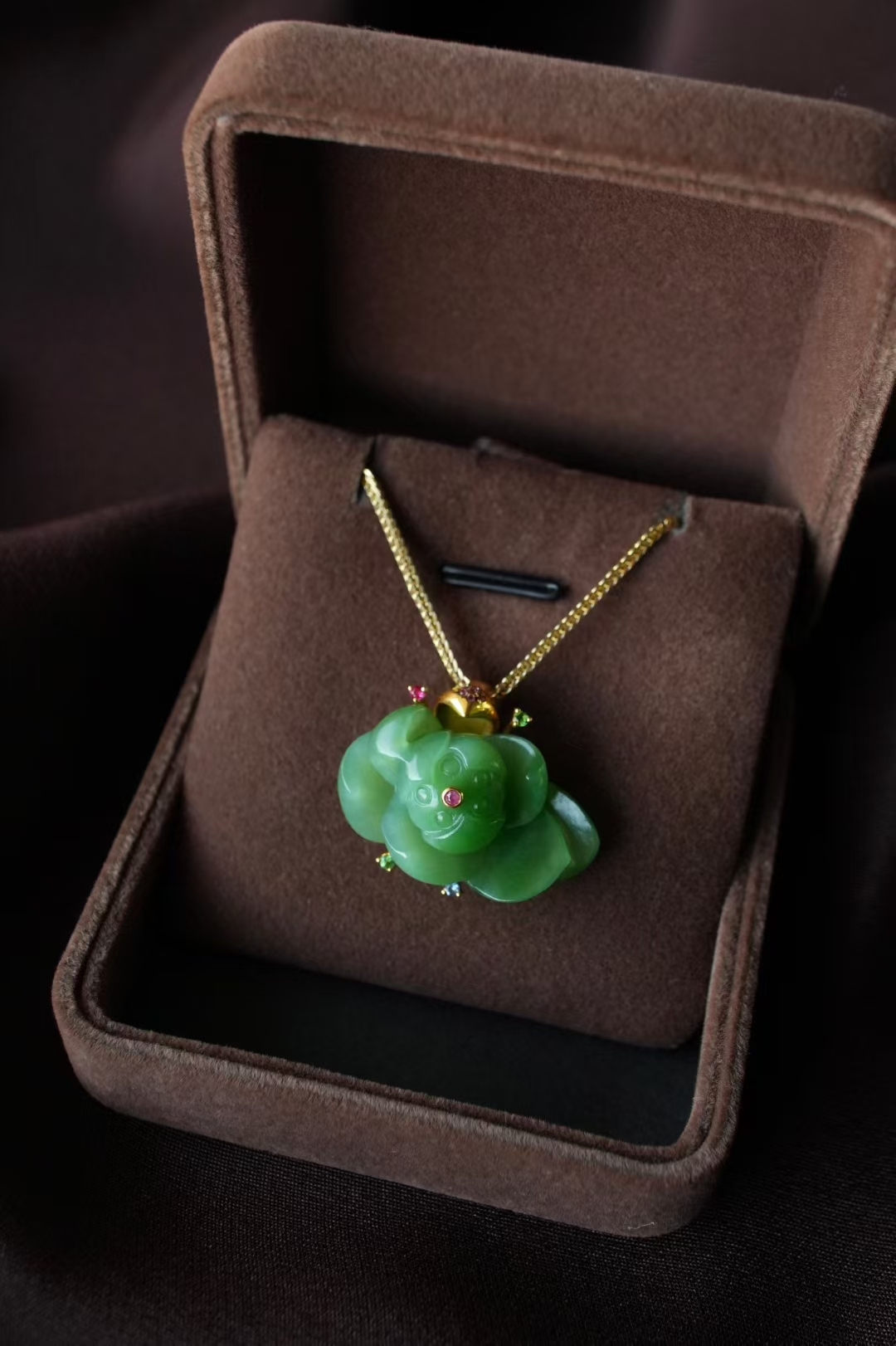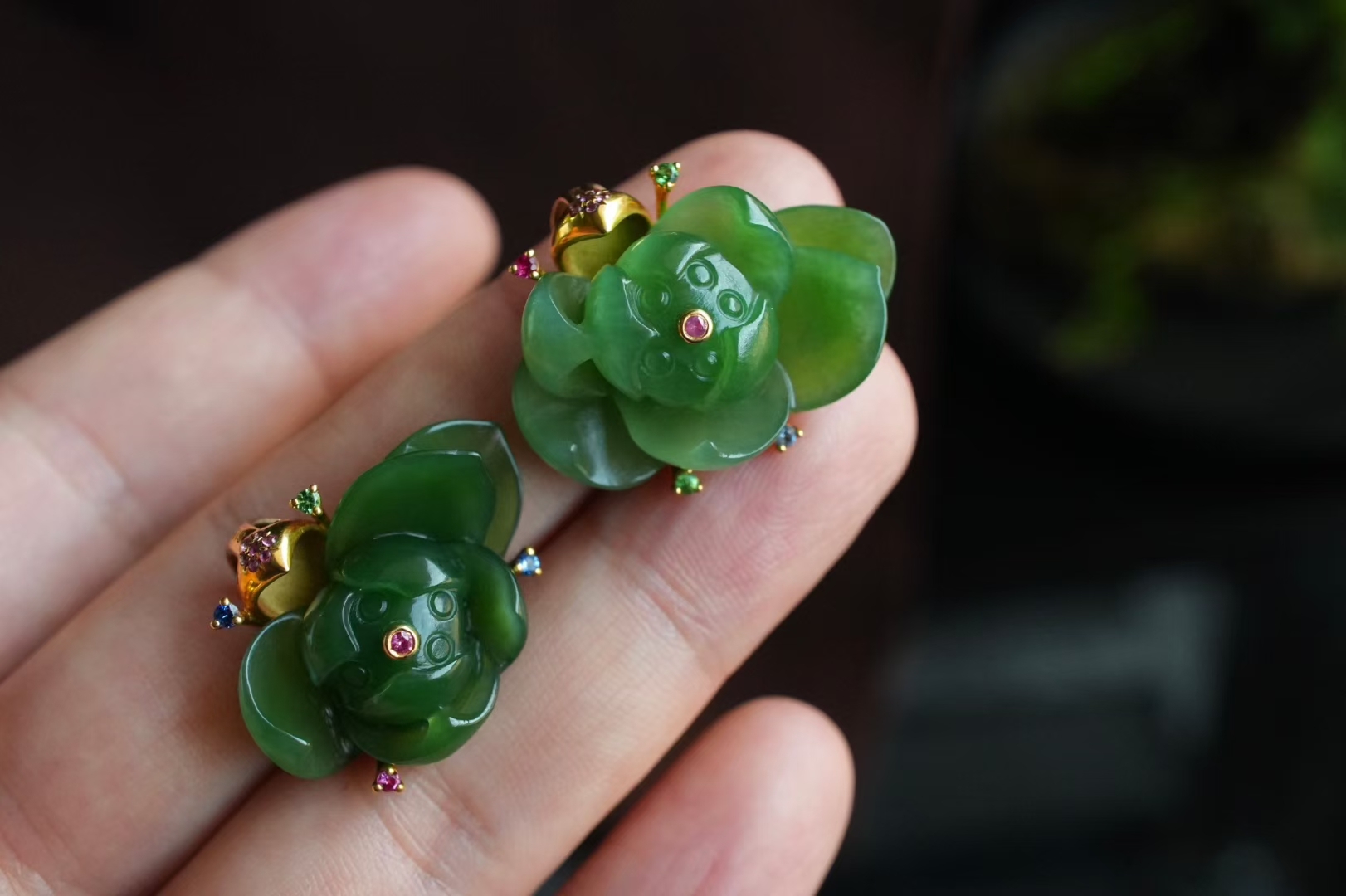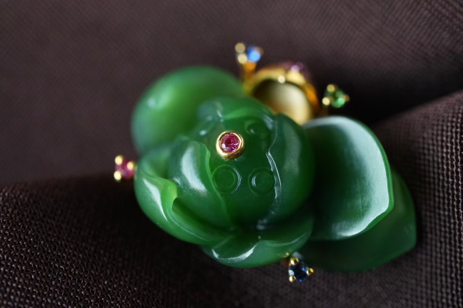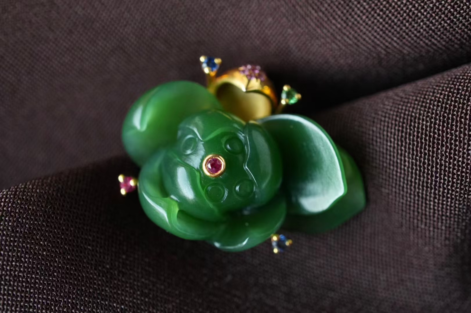 18K厚金鑲嵌荷葉扣頭,瓣尖兒飾以紅寶石,荷花兩側立體金蕊絲設計,紅寶石、沙弗來寶石、藍寶石作花蕊,玉蓮蓬中心鑲嵌紅寶石作為蓮子提亮,細節精緻到位,設計感滿滿。