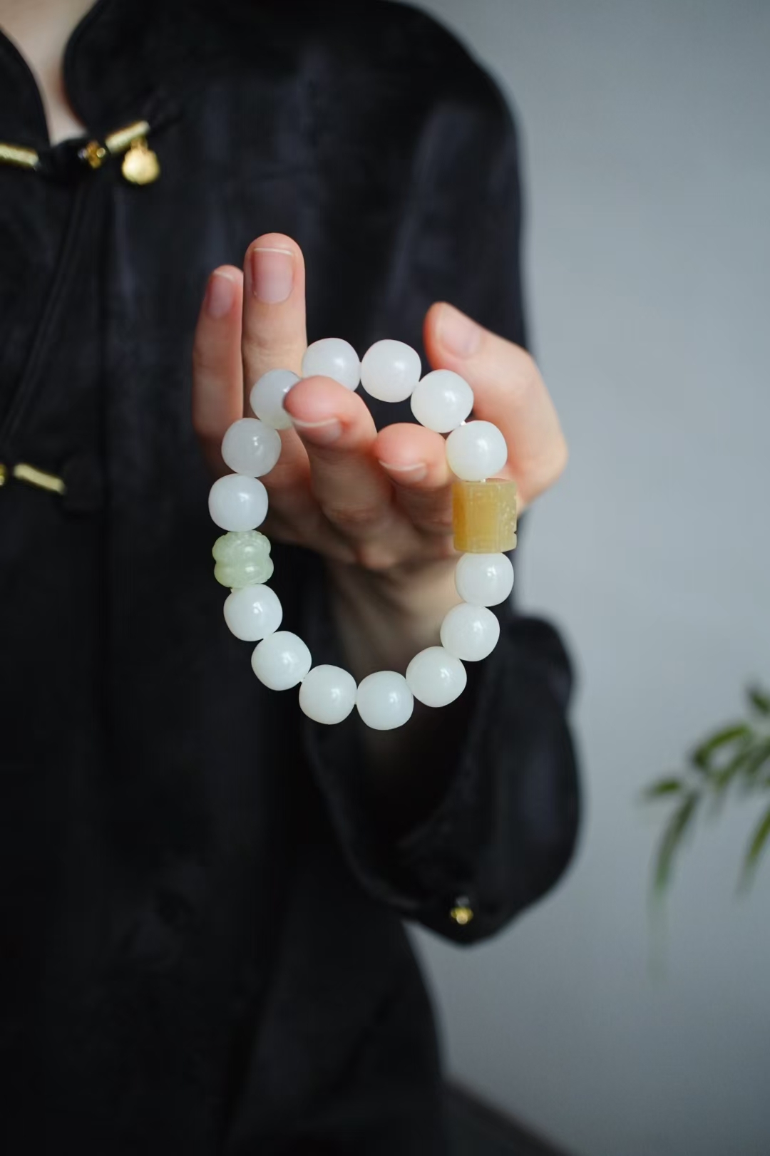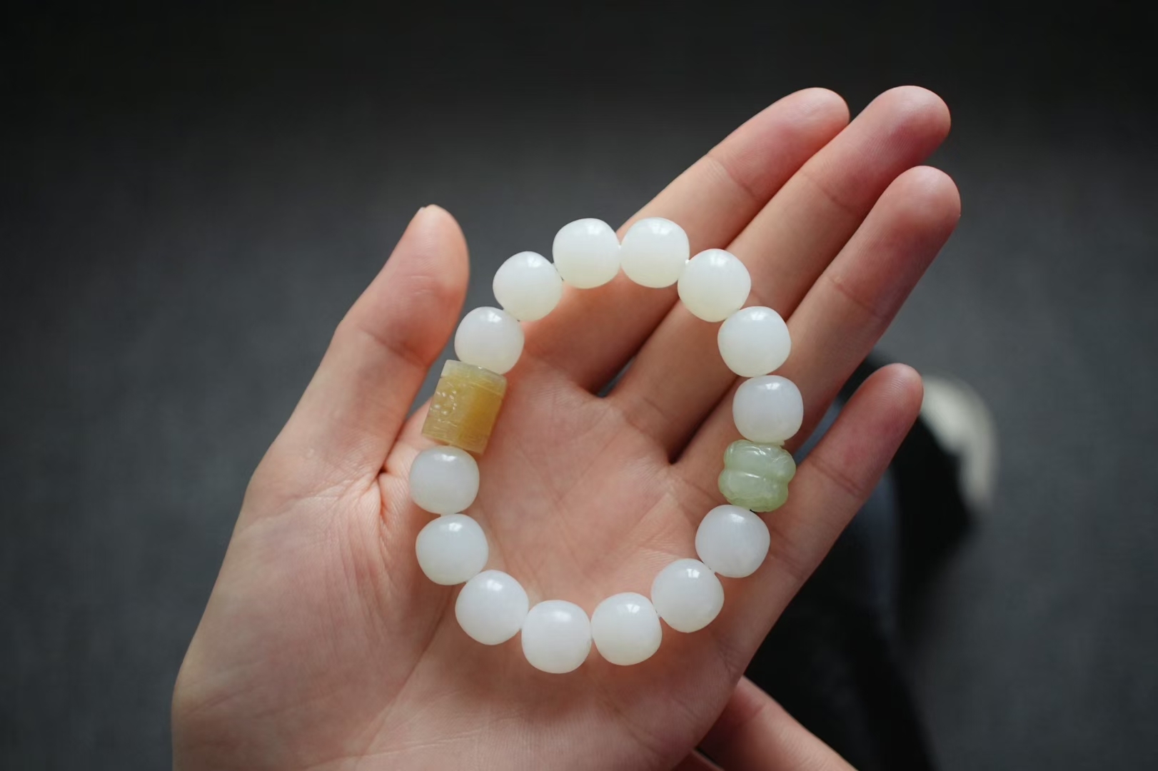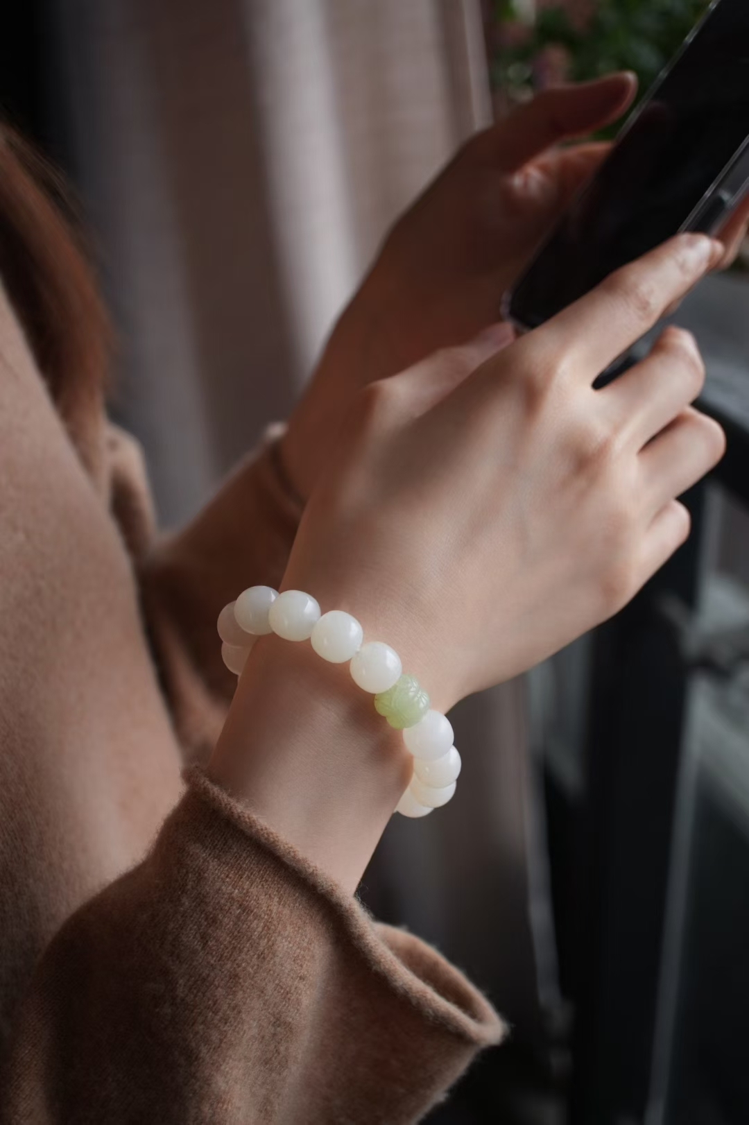 獨家原創設計,搭配大顆粒純糖料手工雕刻桶珠(尺寸約13.3×11mm),和田玉晴水雕刻並蒂蓮點綴,素雅有亮點,顯得格外精緻,上手百搭雅致。