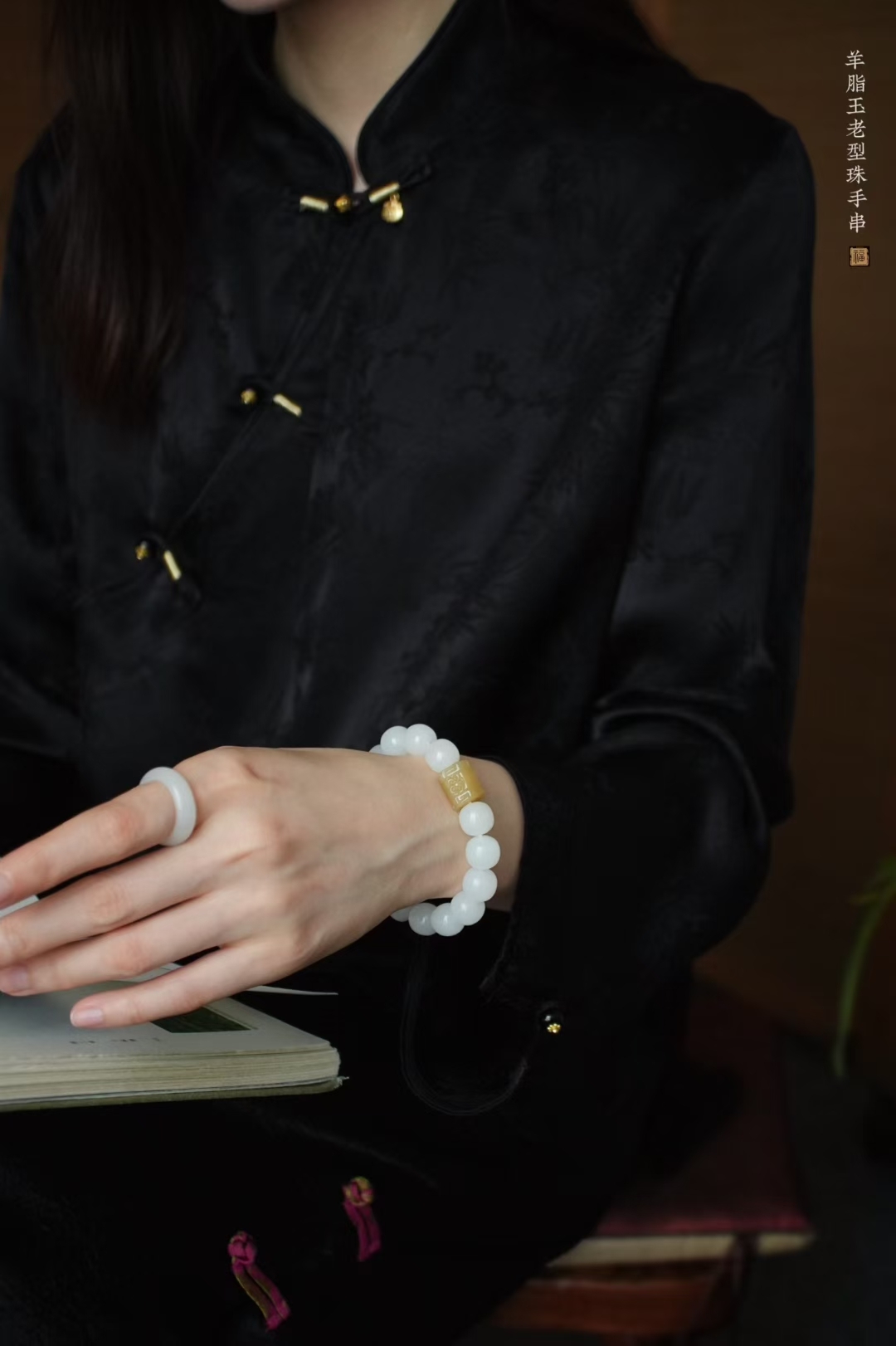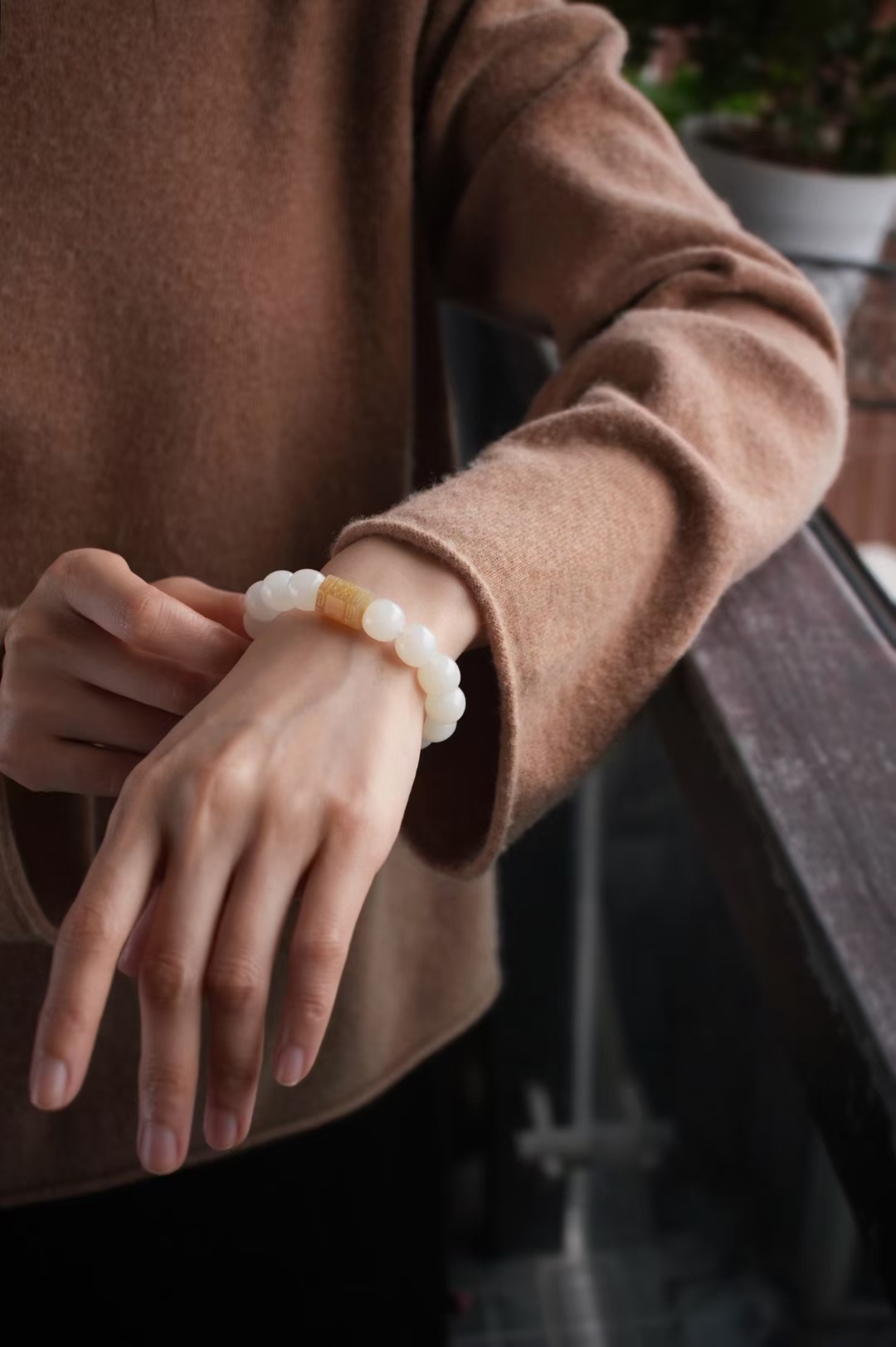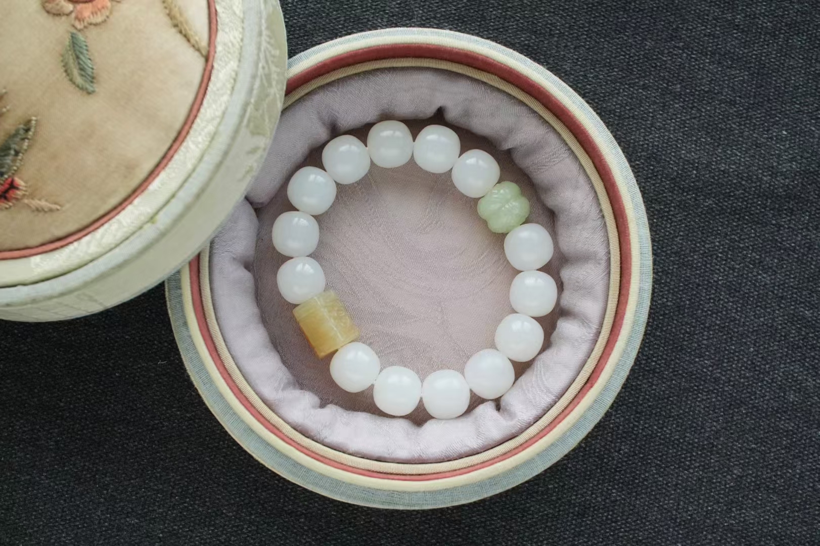 獨家原創設計,搭配大顆粒純糖料手工雕刻桶珠(尺寸約13.3×11mm),和田玉晴水雕刻並蒂蓮點綴,素雅有亮點,顯得格外精緻,上手百搭雅致。