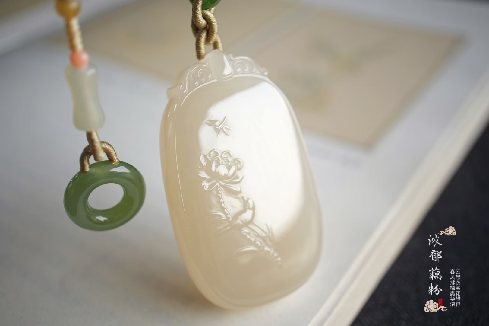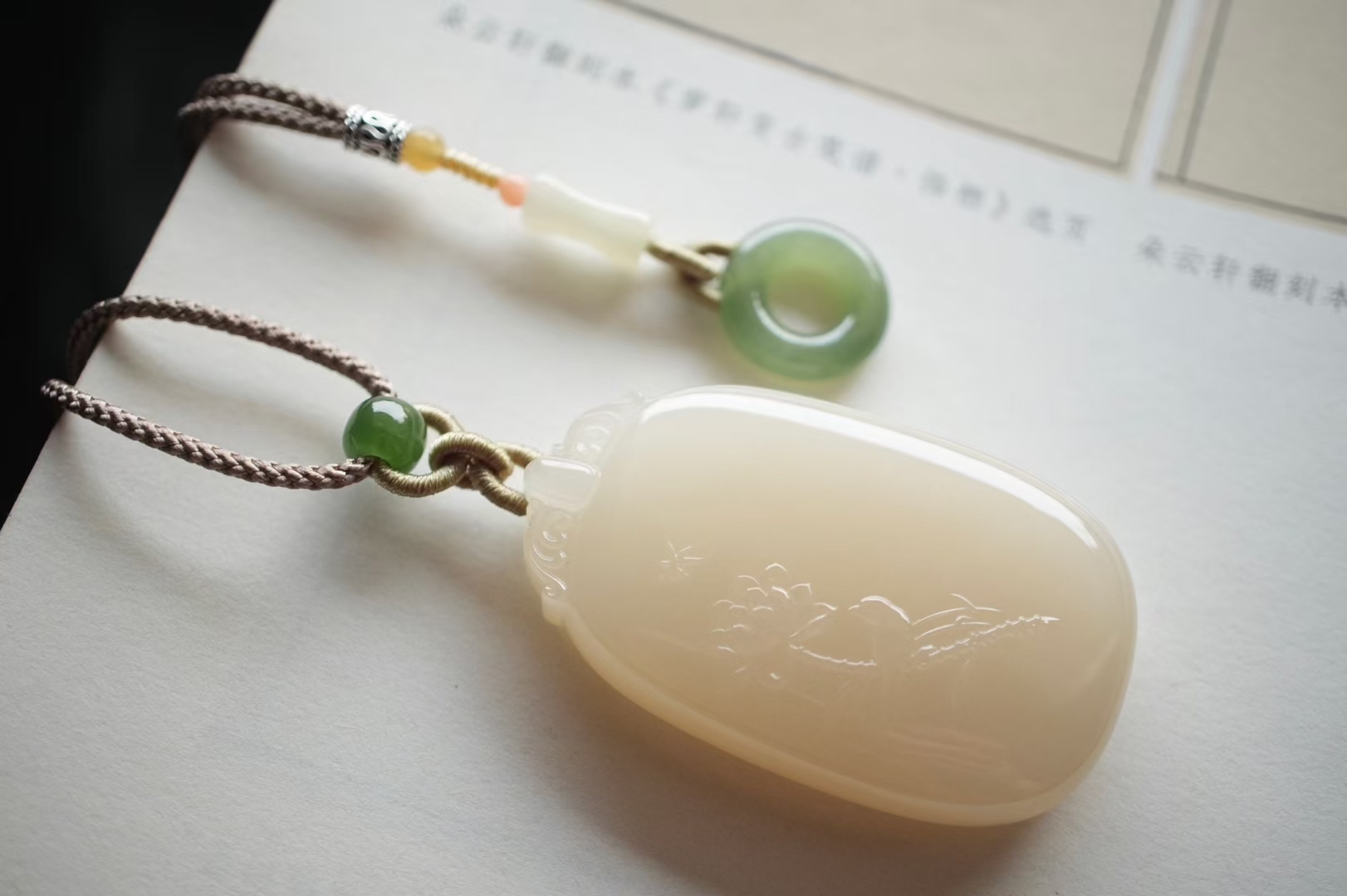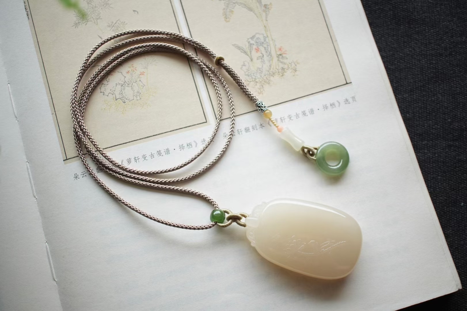 純手工浮雕飽滿柔美荷花,喜鵲登枝,生動形象,整體留白設計也很到位。喜鵲與蓮花寓意喜報連連,搭配純手工製作進口可調節繩,點綴碧玉路路通、和田玉甜甜圈、白玉小蠻腰、莫莫珊瑚等配飾,上身柔美雅致。