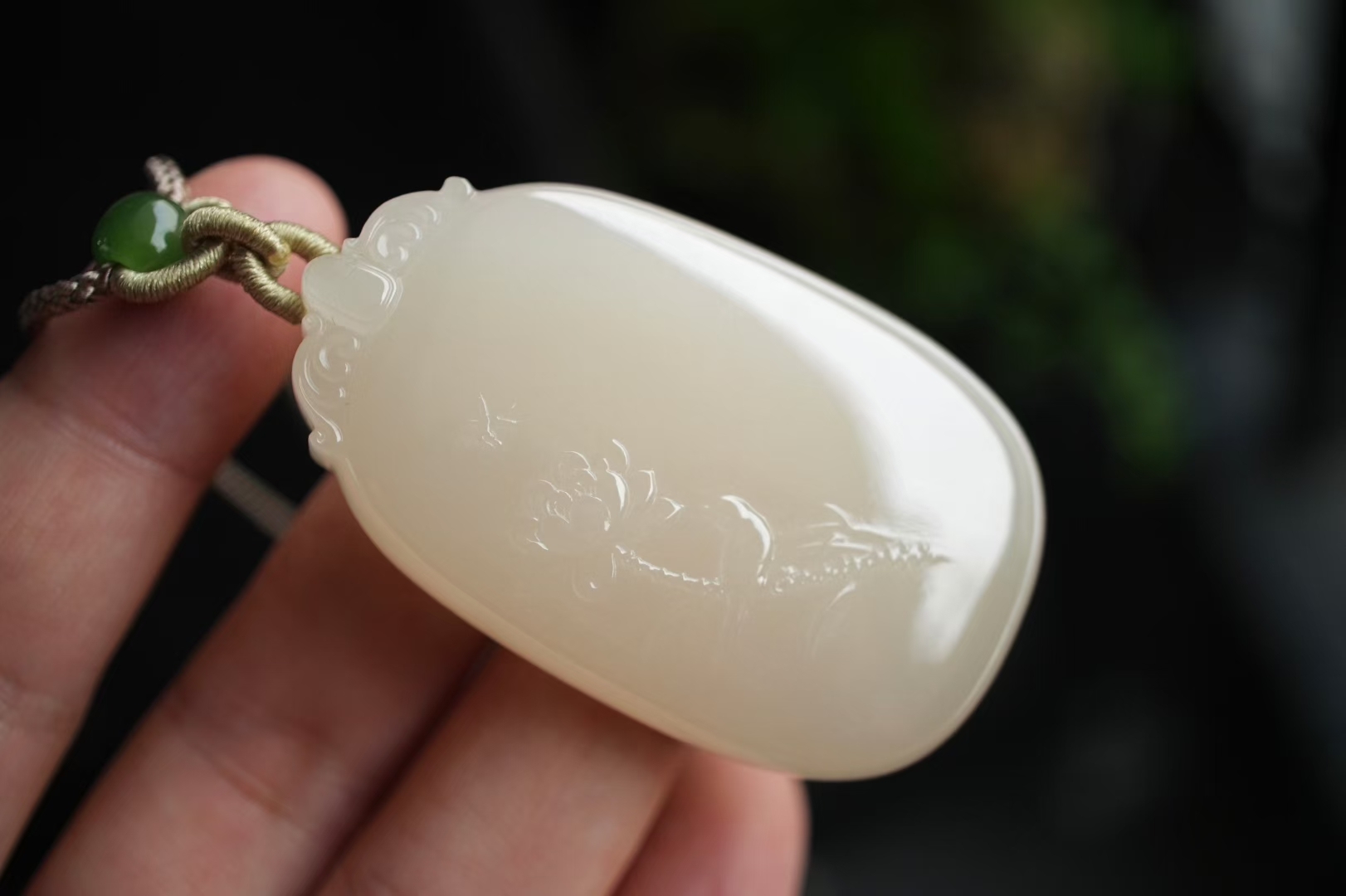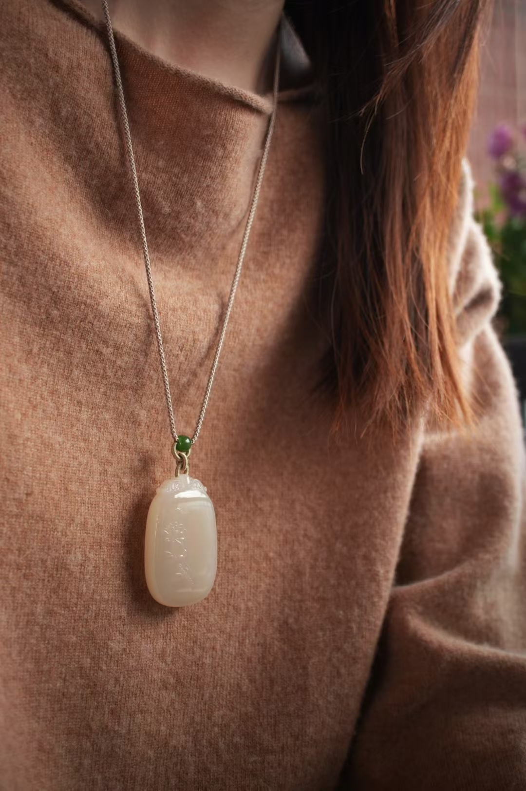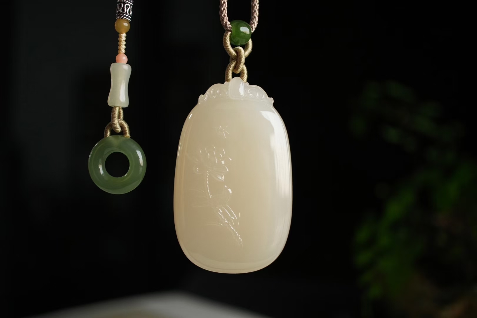 純手工浮雕飽滿柔美荷花,喜鵲登枝,生動形象,整體留白設計也很到位。喜鵲與蓮花寓意喜報連連,搭配純手工製作進口可調節繩,點綴碧玉路路通、和田玉甜甜圈、白玉小蠻腰、莫莫珊瑚等配飾,上身柔美雅致。