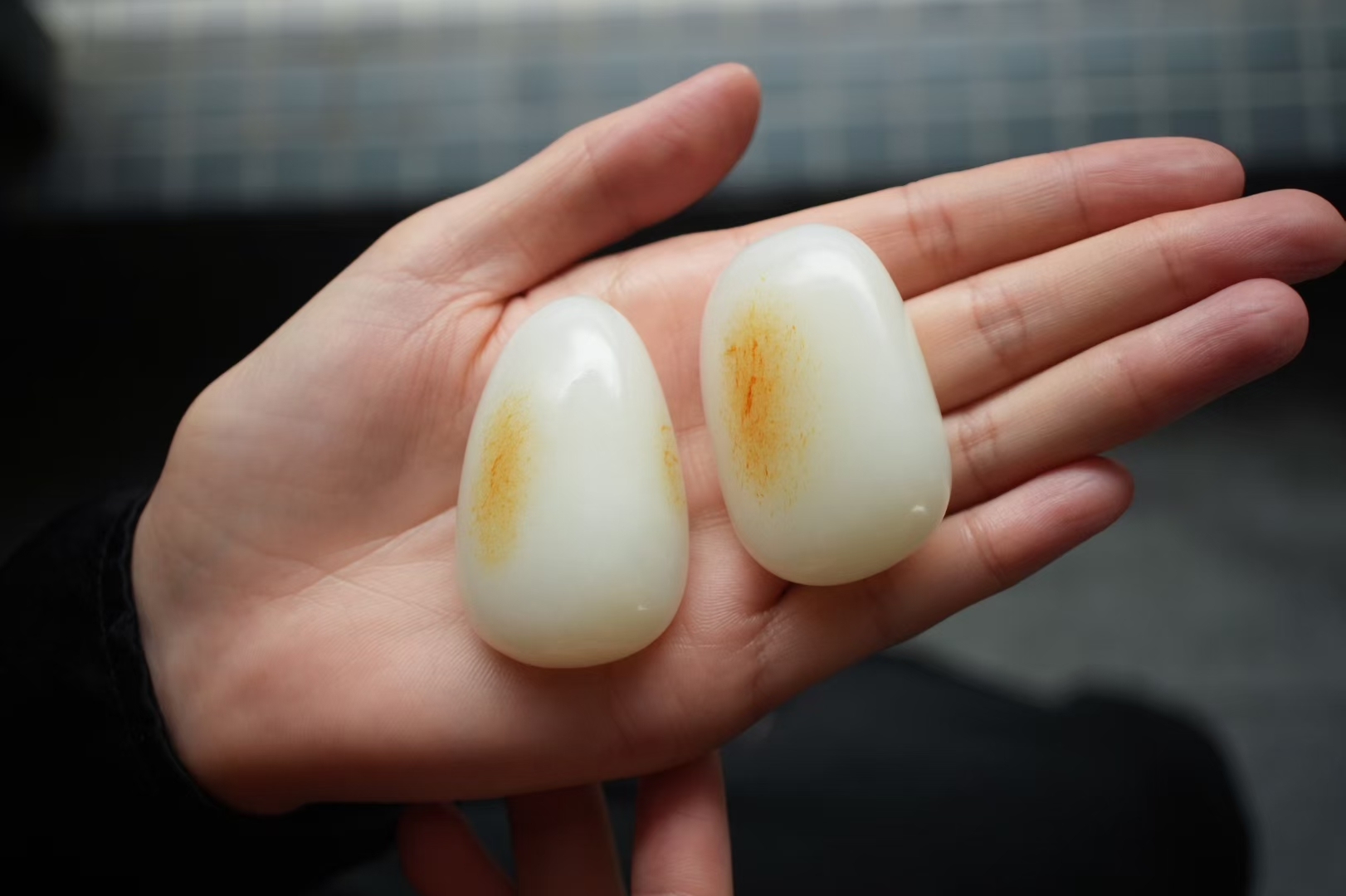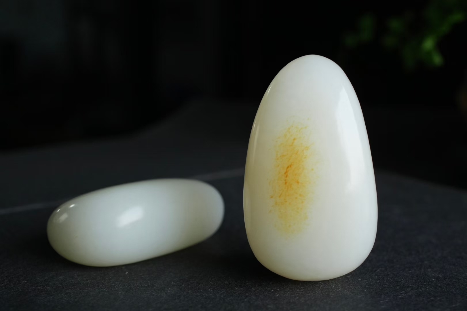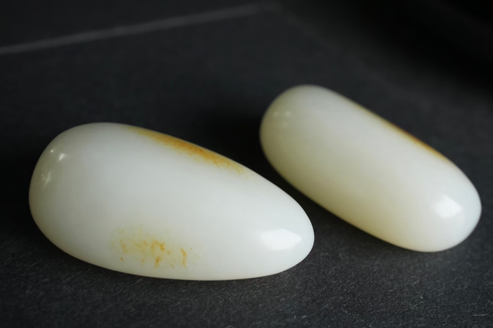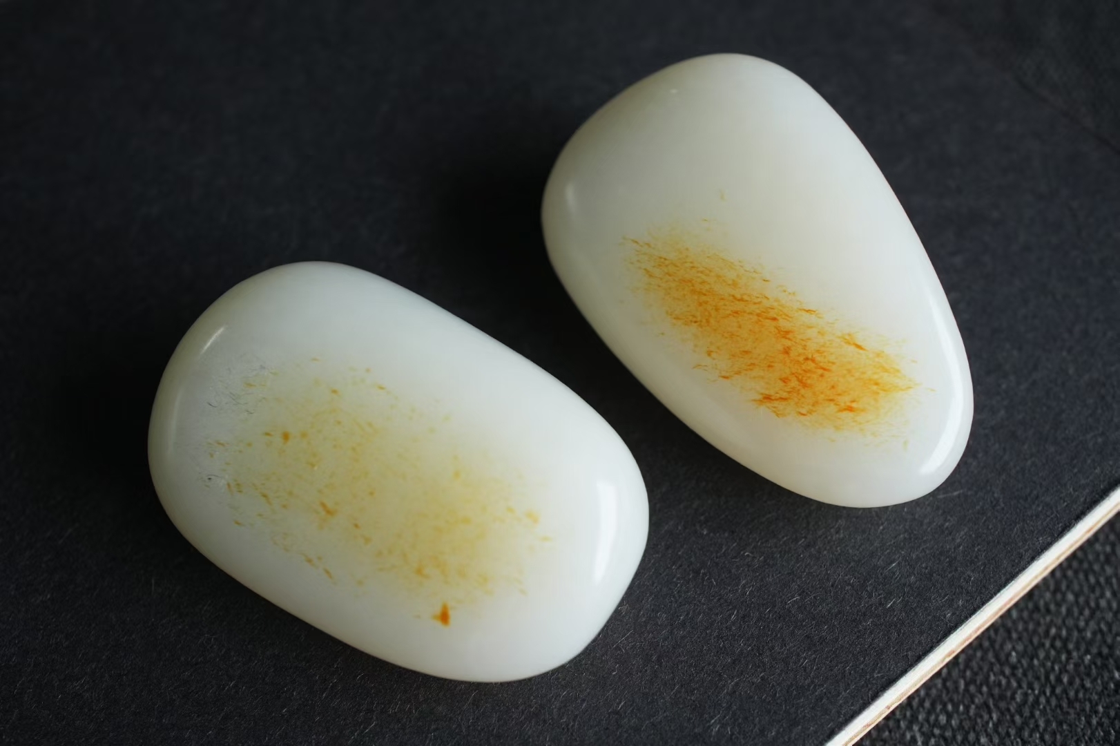天然和田玉,這對同料籽料,是可遇不可求的珍品,白肉凝如羊脂,料子油潤密度高,金黃的皮色在羊脂白的底色上暈染開來如暖陽落雪般有意境,灑金皮不僅是美的點綴,更是籽料身份的防偽標識,每一塊皮色都是獨一無二的自然印記!