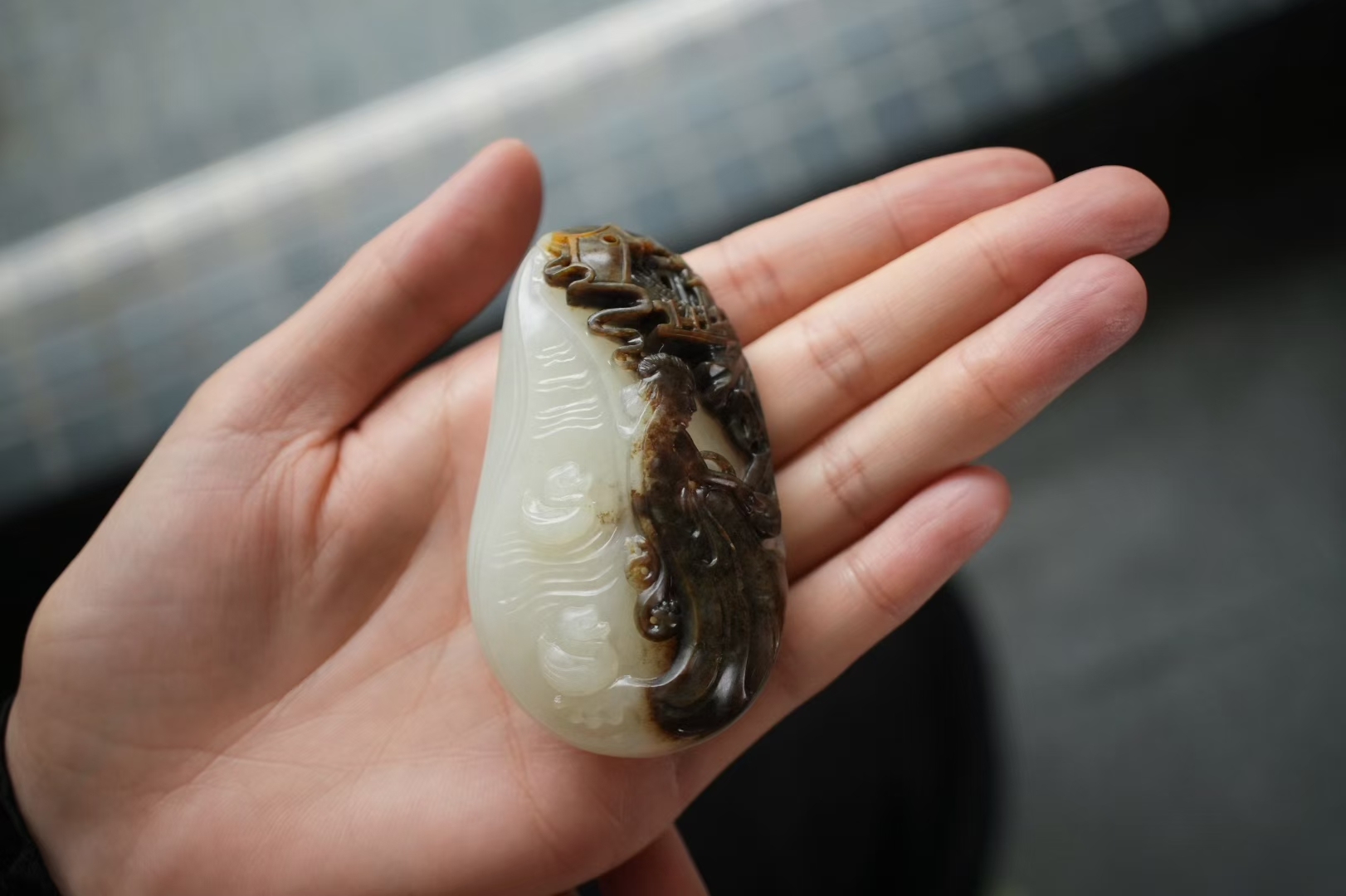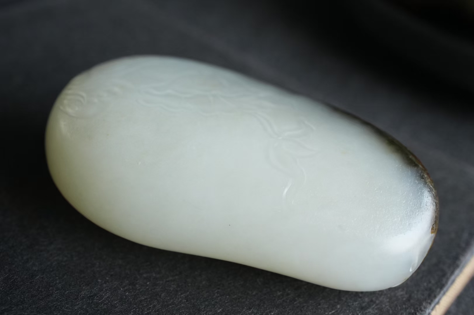 一半凝如羊脂,一半沉如墨玉,這枚好皮+好肉籽料是老熟料的絕佳代表,大件握感扎實舒適,皮色靚麗毛孔清晰,玉料乾淨細膩,觸手溫潤,深沉油潤的黑皮,是歲月沉澱的印記,與羊脂白肉過渡自然形成強烈視覺衝擊,這般雙色共生的料子本就極為難得。