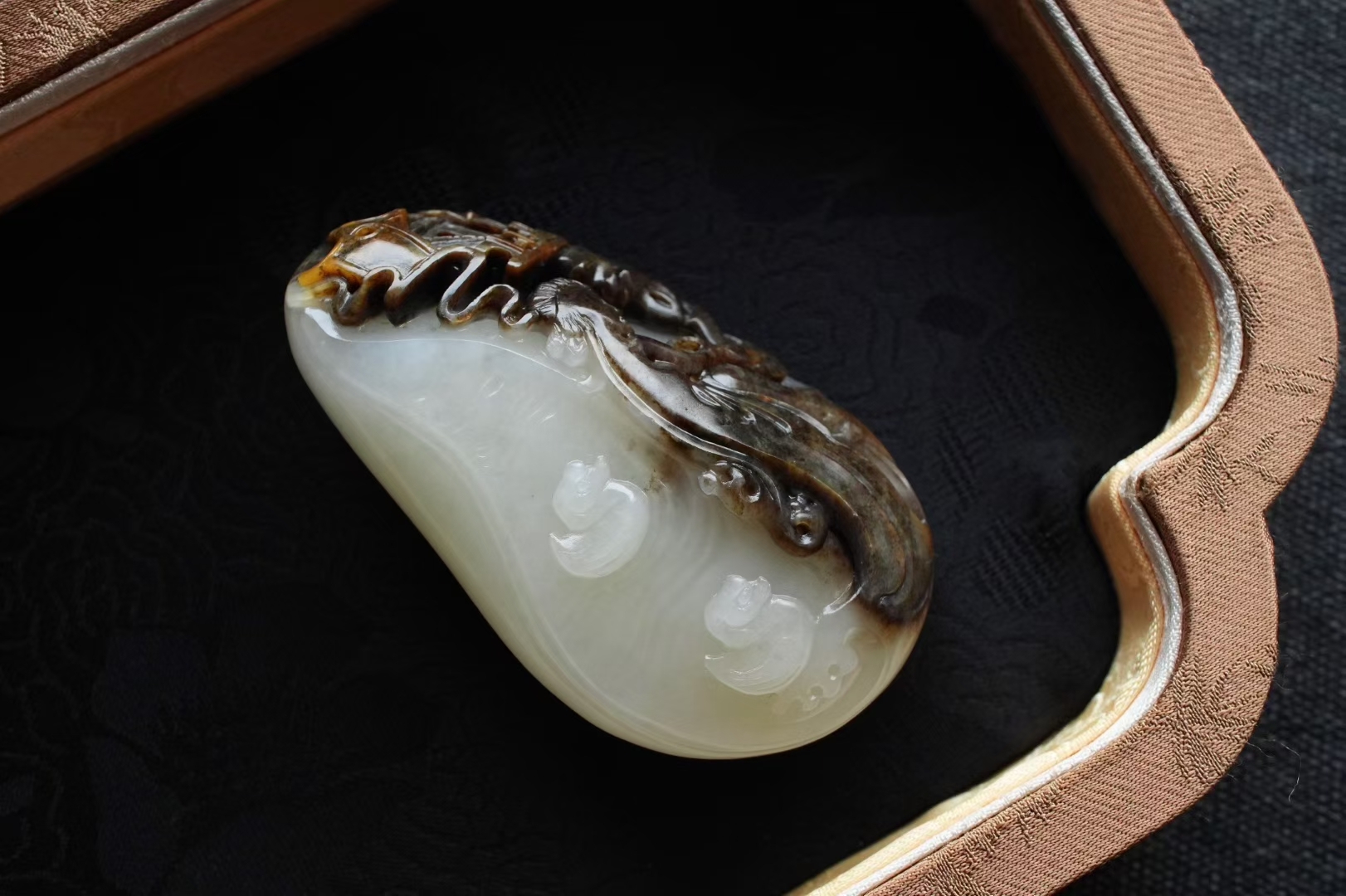 玉雕師隨形施藝,黑皮處雕樓宇仙閣、翩躚仙女,白肉上琢雲間天鵝,背面精雕清蓮,線條婉轉流暢,將“仙女臨凡、天鵝報喜、家宅興旺”的美好寓意凝於方寸之間,盤玩愈顯光澤,既是一件可賞可玩的藝術珍品,也是承載祥瑞的傳家之寶,值得收藏品鑑。