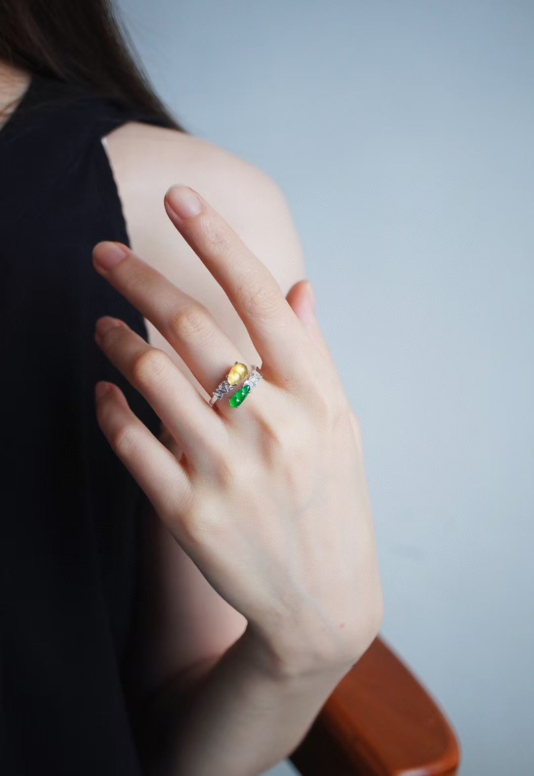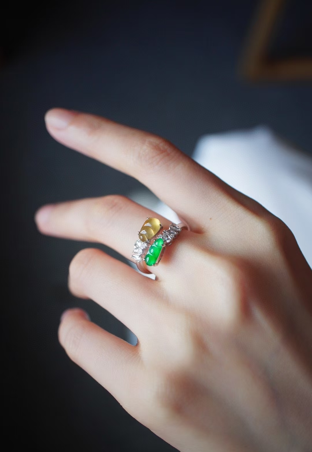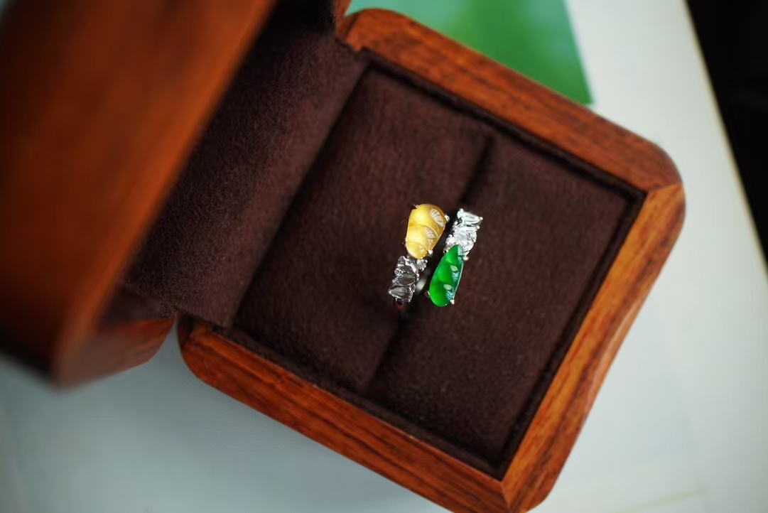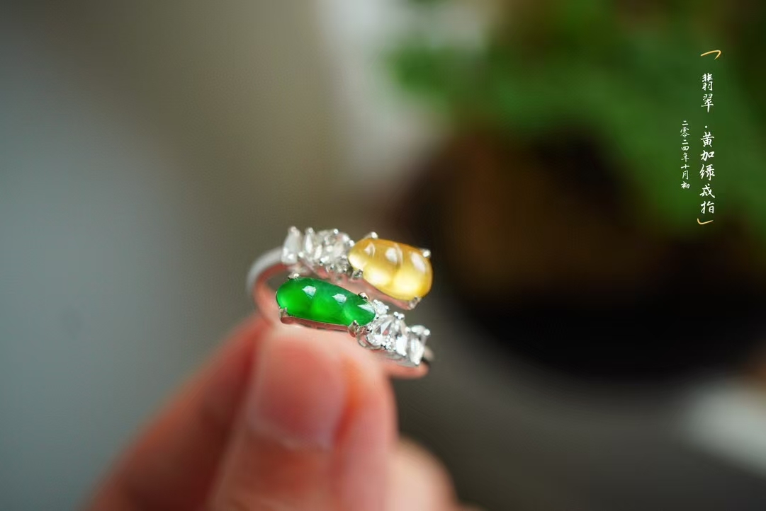 輕奢系列·雙色福豆翡翠戒指,天然翡翠A玉,冰陽綠和金黃翡,這倆搭在一起太貴氣了吧。冰陽綠綠小福豆,搭配冰種起光黃翡小福豆,18K金鑽石豪鑲,高級質感滿滿。