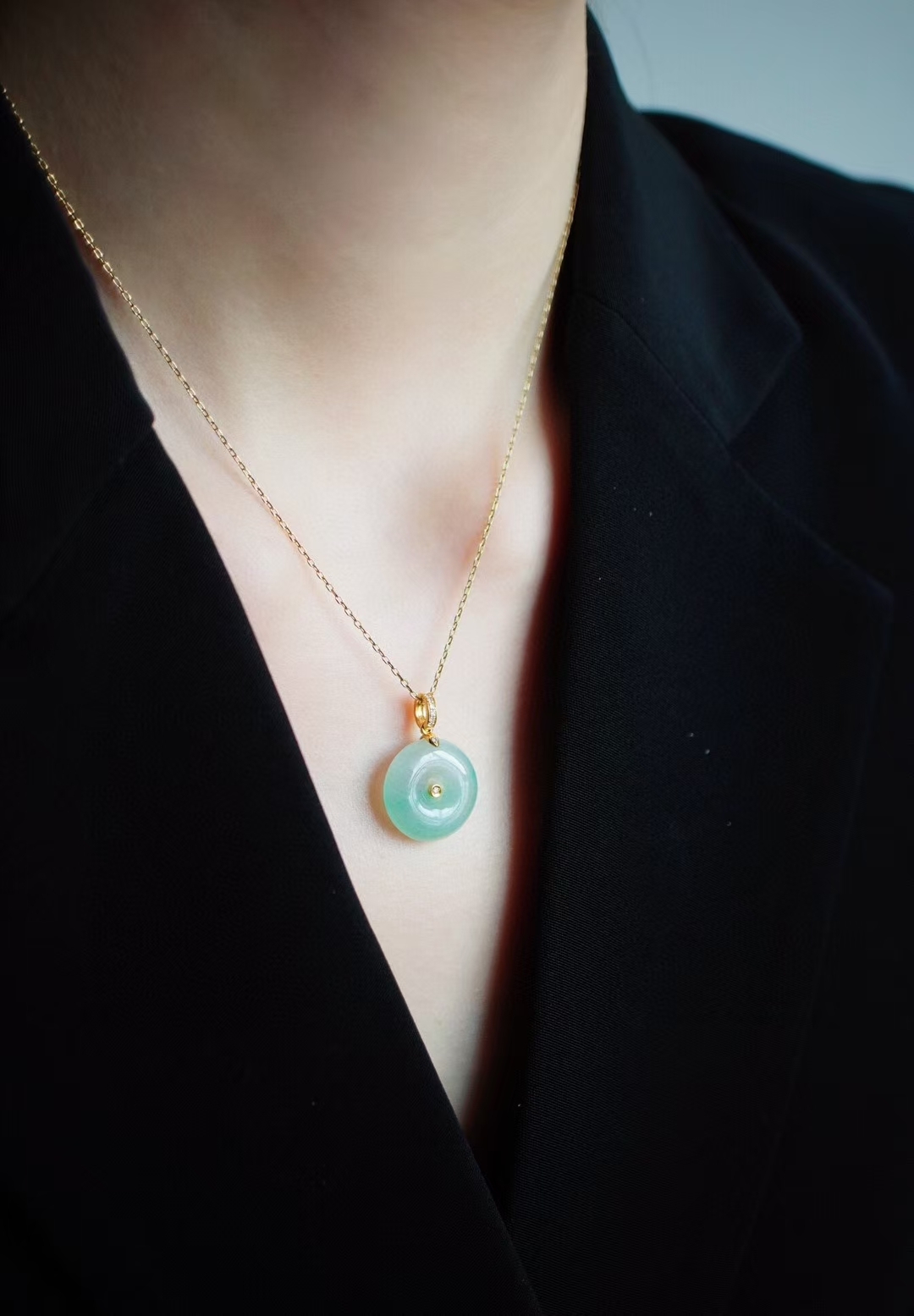 天然翡翠A玉,溫柔清麗的晴綠底色,鮮嫩的不得了,感覺都能掐出水來,小胖扣也太可愛了,厚嘟嘟的,上身很好看,18K金鑽石鑲嵌。