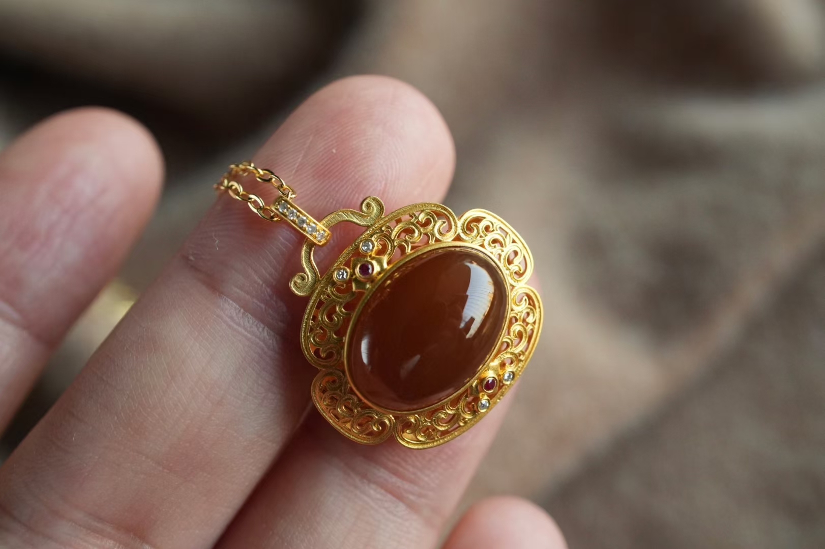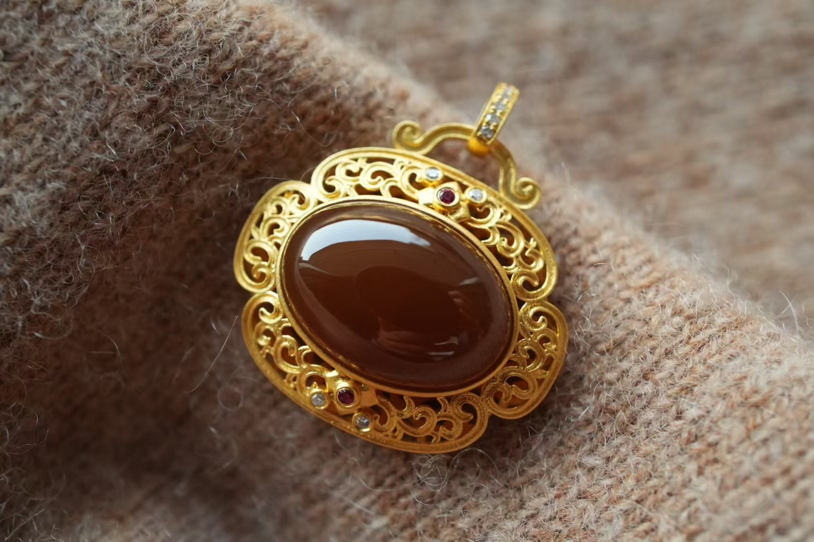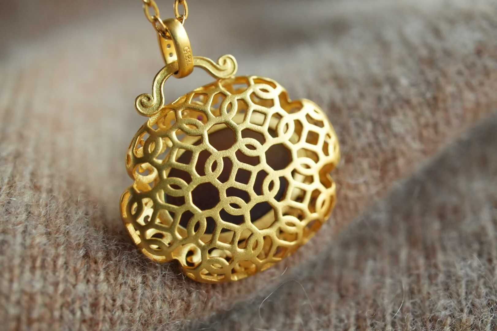 平安鎖造型精緻可愛,18K厚金鏤空卷草紋包邊鑲嵌,紅寶石/鑽石點綴,背面鏤空銅錢設計,寓意平安如意,財源滾滾。