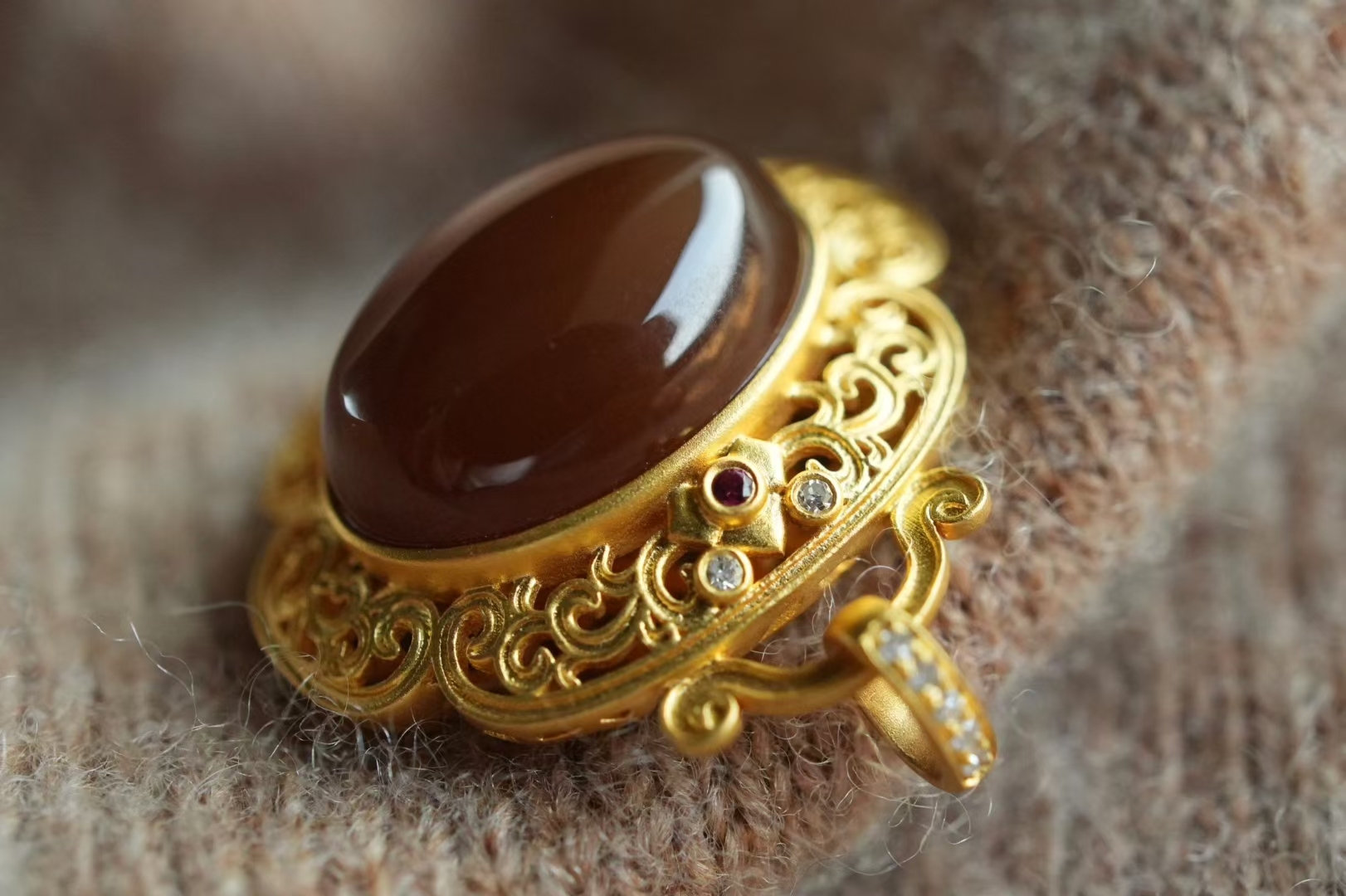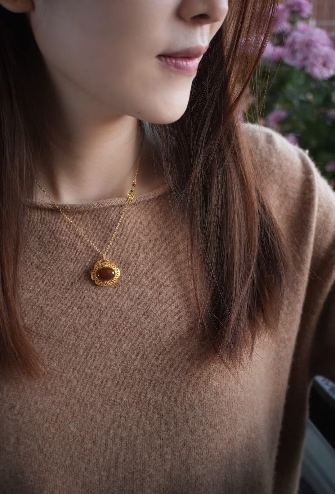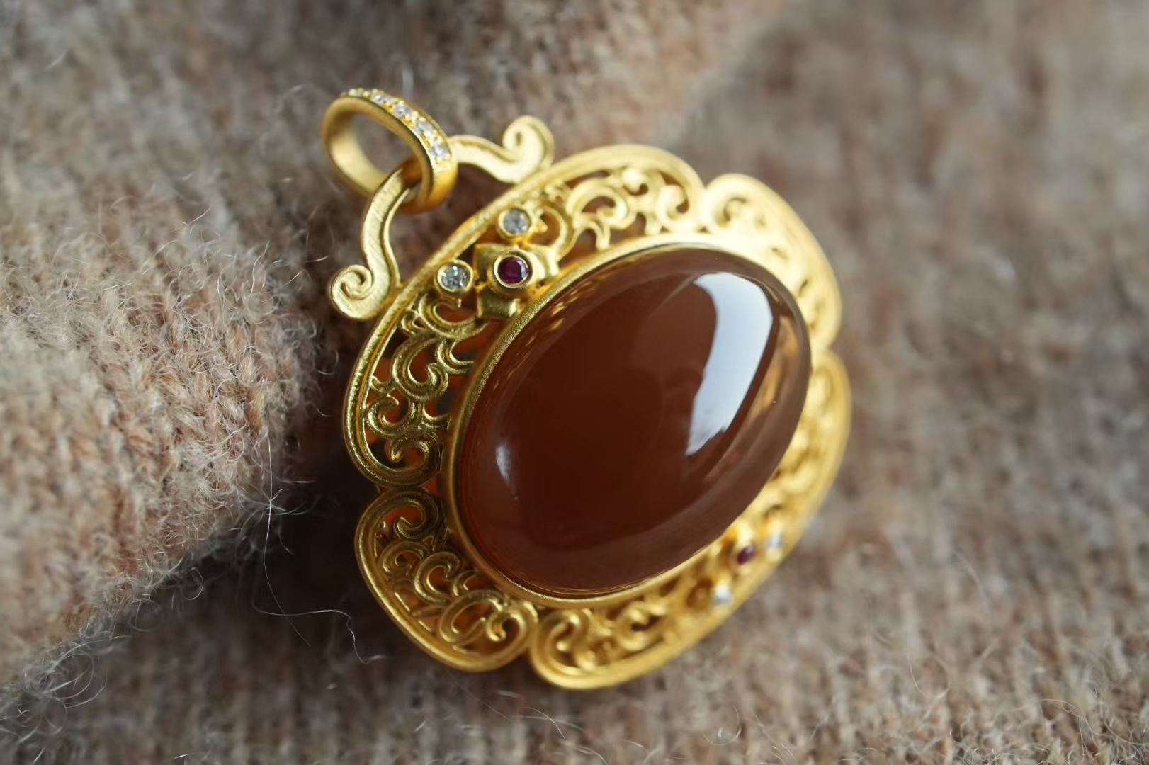 平安鎖造型精緻可愛,18K厚金鏤空卷草紋包邊鑲嵌,紅寶石/鑽石點綴,背面鏤空銅錢設計,寓意平安如意,財源滾滾。