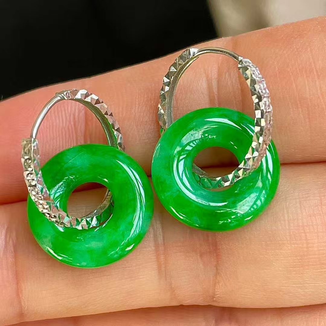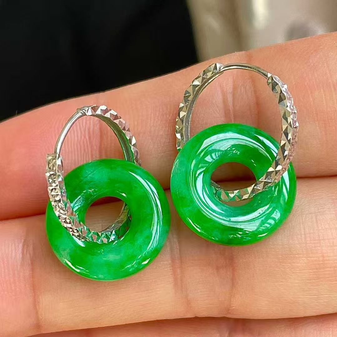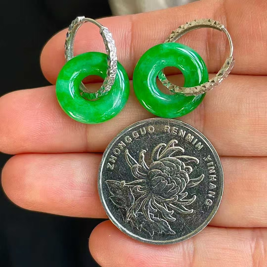 • 翡翠冰陽綠平安扣耳墜 (14.8mm直徑),天然翡翠A玉, 緬甸玉, Jade, Jadeite