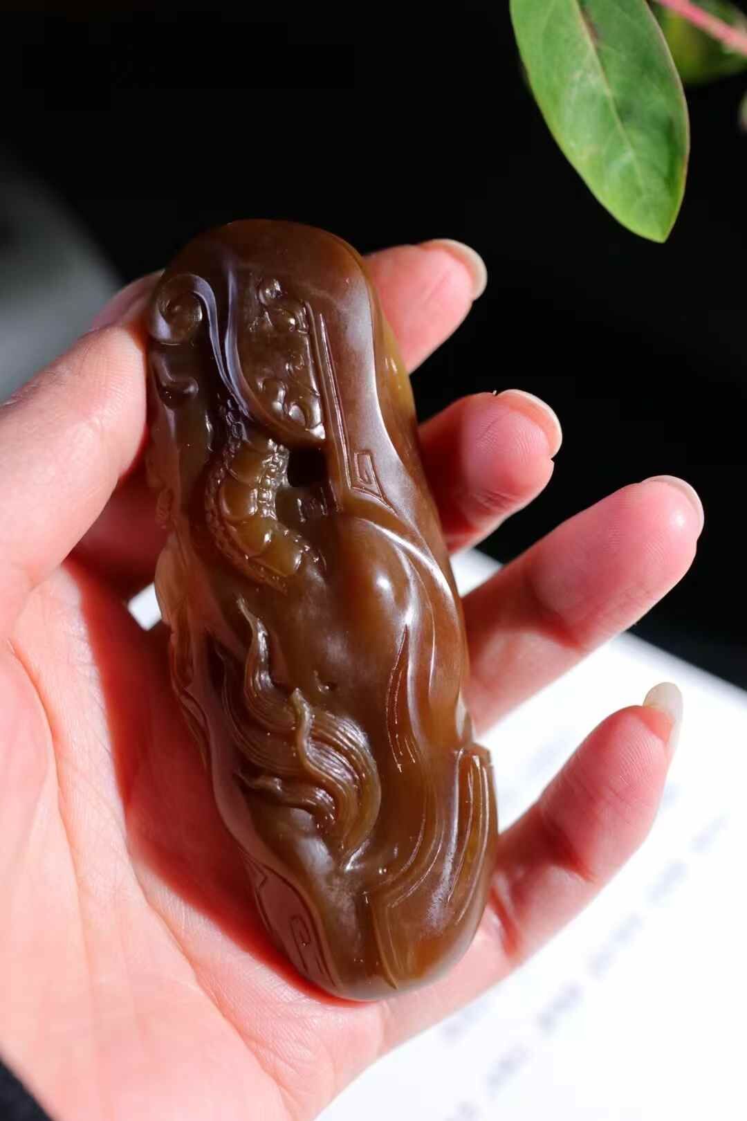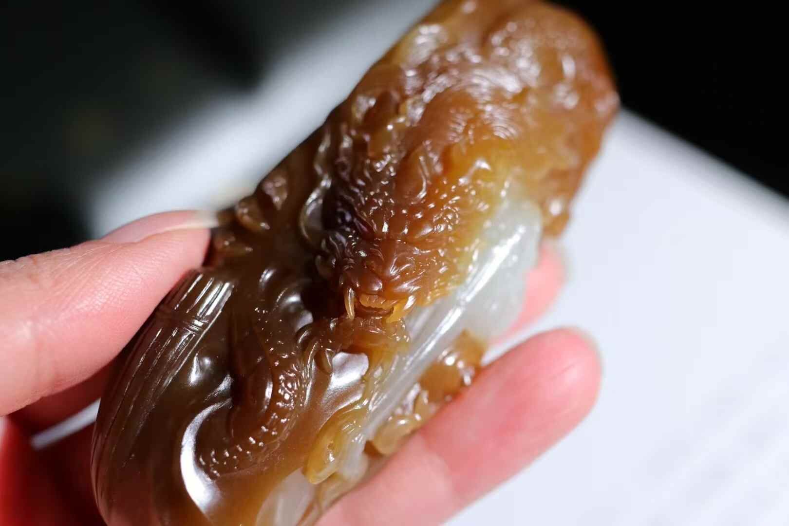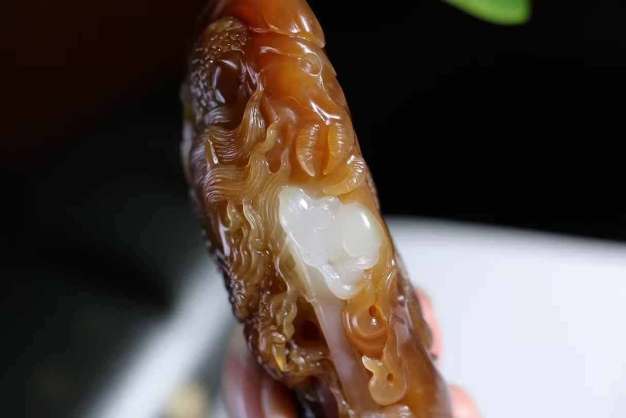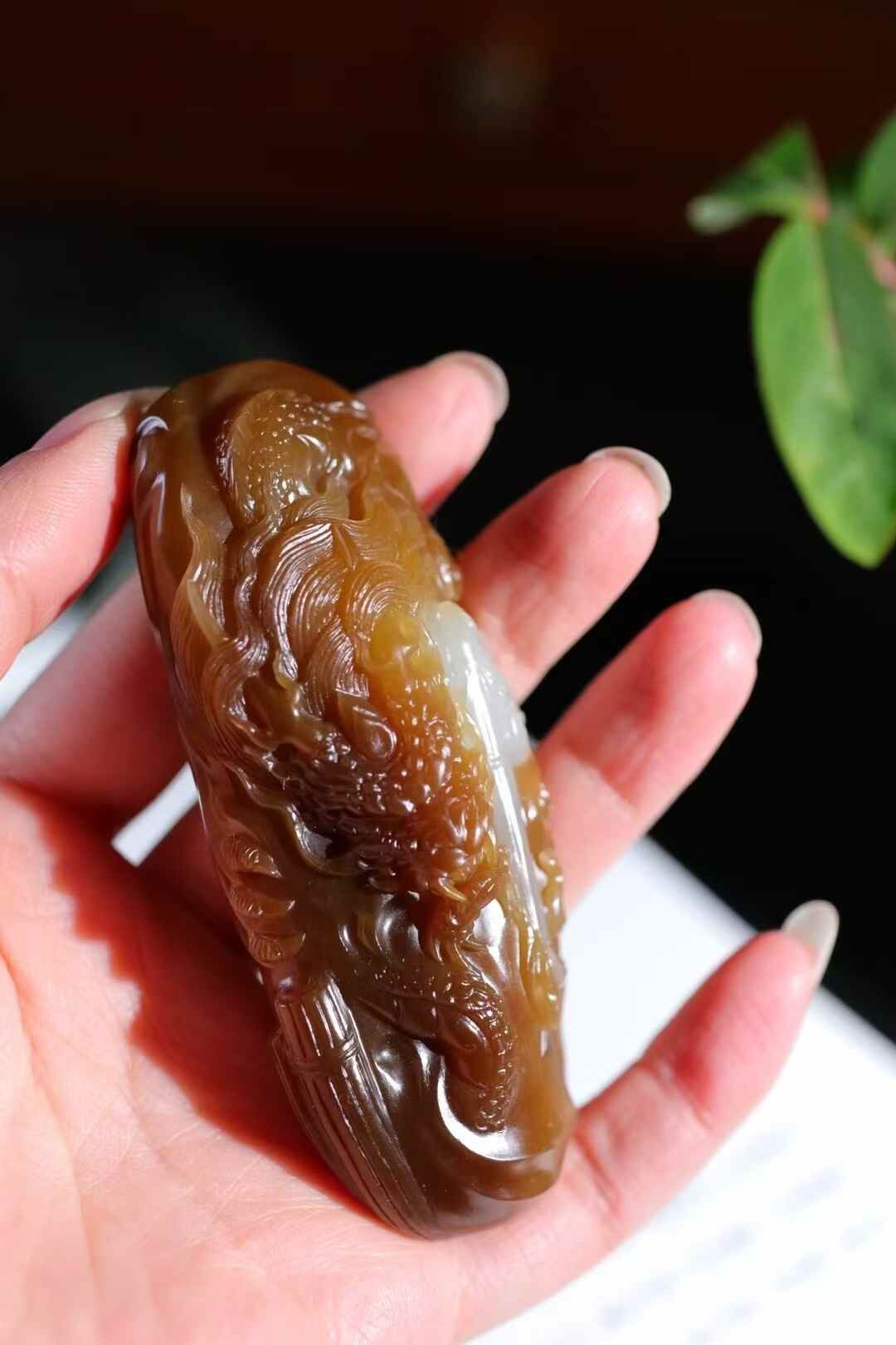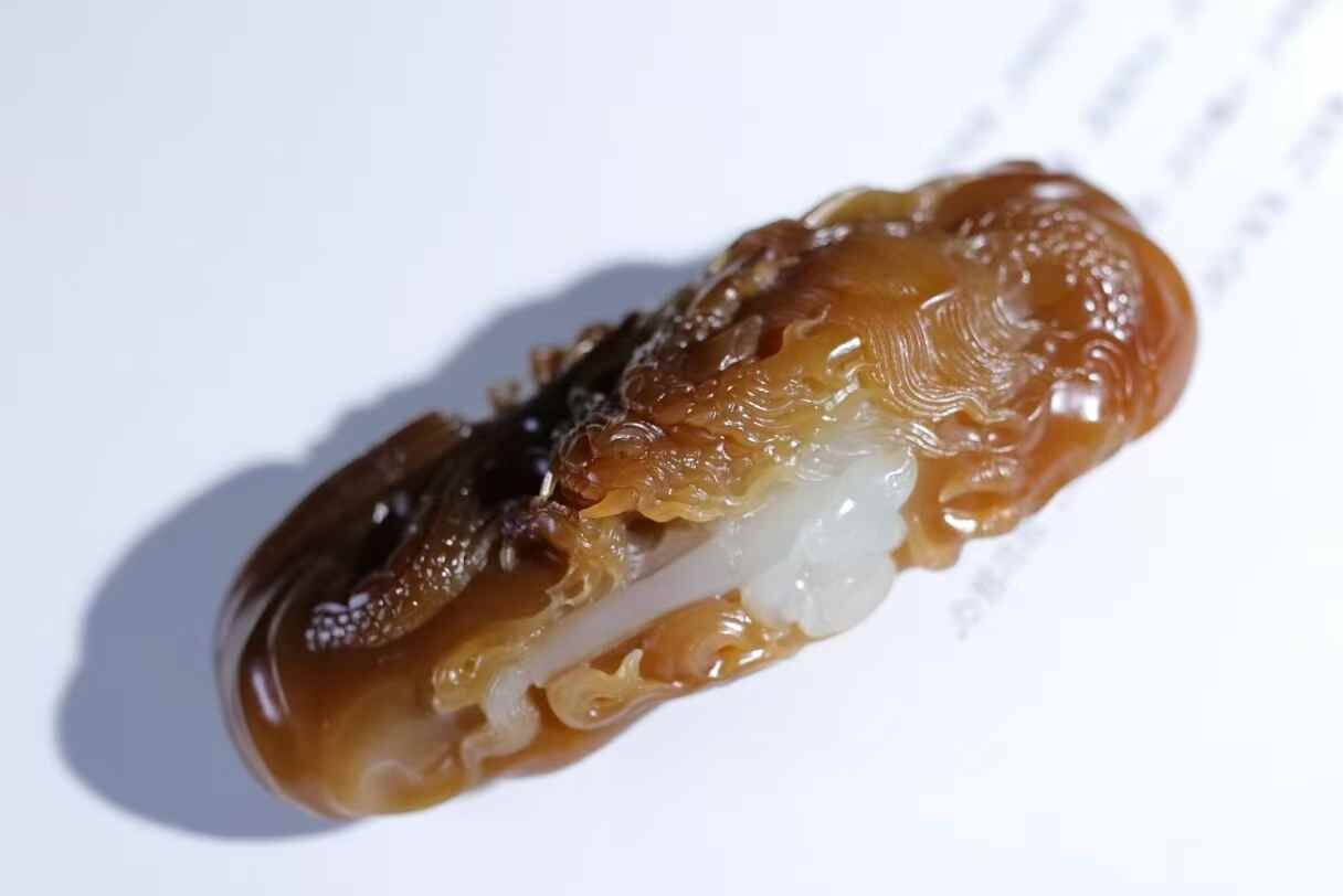 天然和田玉,新疆且末糖白玉,肉質油潤細膩,糖色濃聚鮮艷,由大師設計制作,糖色巧雕神龍,威猛霸氣,白肉巧雕子鼠靈動,寓意望子成龍,富貴吉祥,也有龍行天下的雅意。