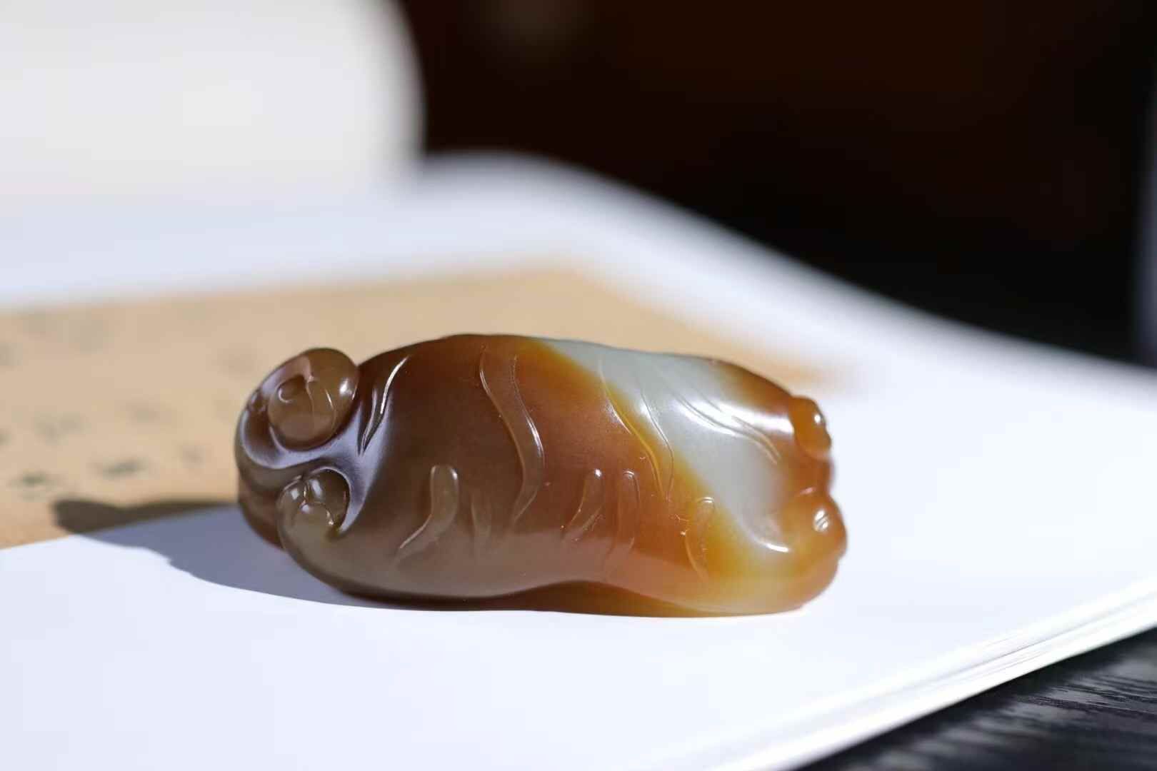 天然和田玉,新疆且末糖白料。虎是百獸之王,代表威嚴、權利、榮耀。中國人自古就喜歡虎。虎是強壯、威武的象徵。蘇工立體圓雕,做掛件把件擺件皆可。