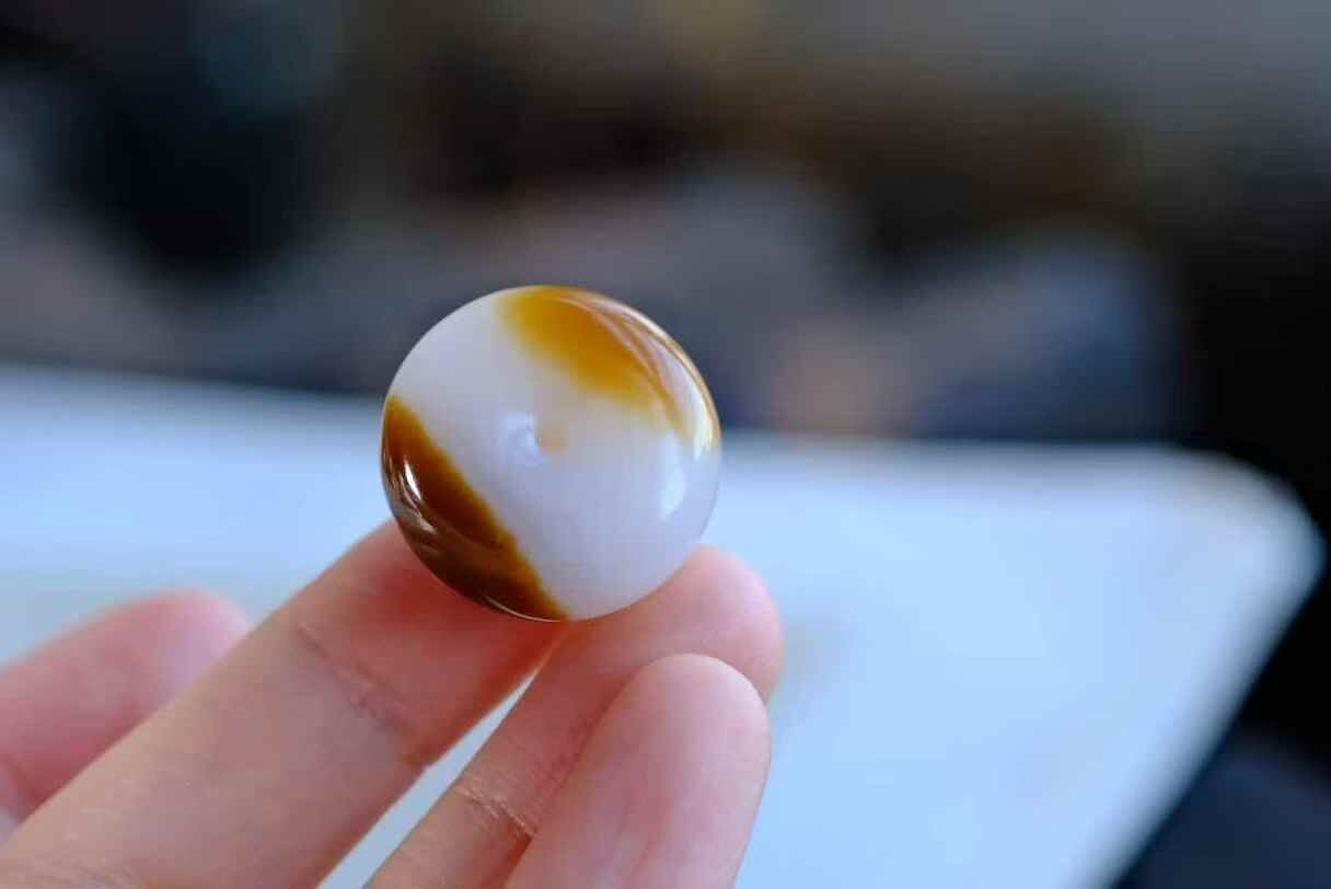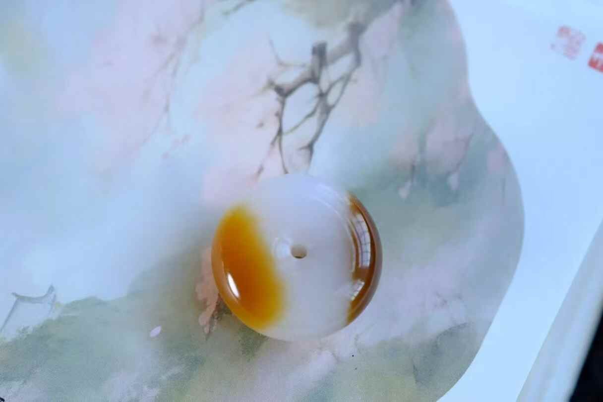 天然和田玉,新疆且末糖白料天地糖平安扣,糖色暈染像焦糖太妃糖。打燈無結構,脂粉感足到像一塊小奶油。
