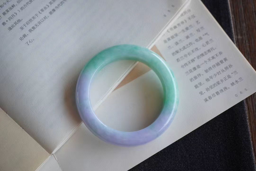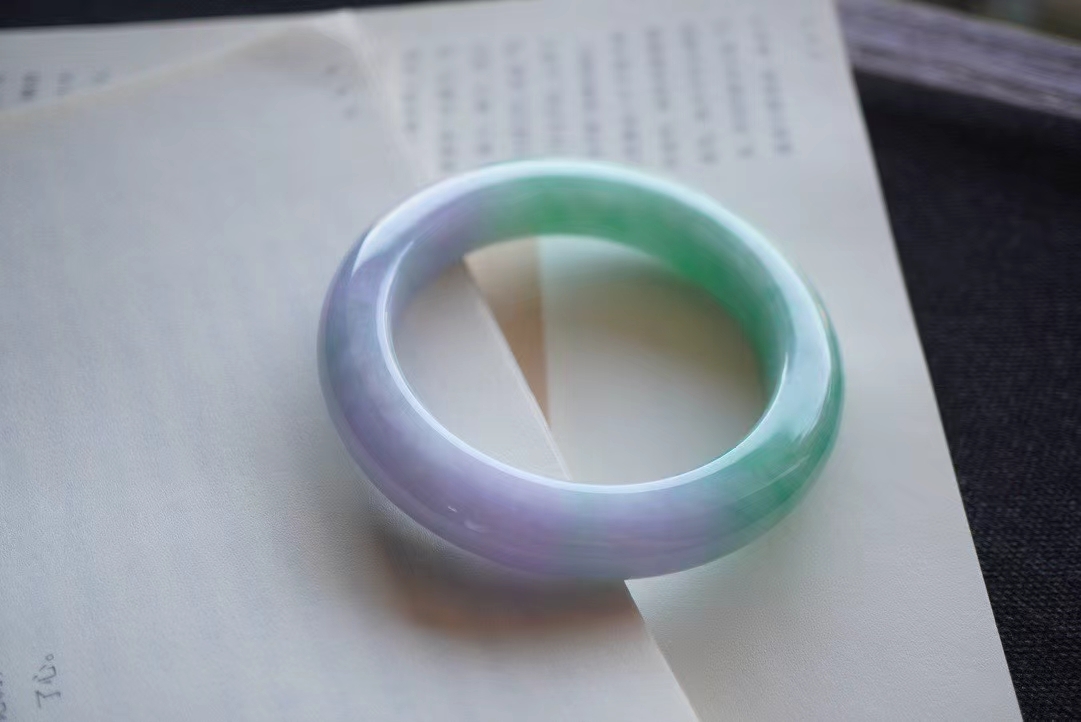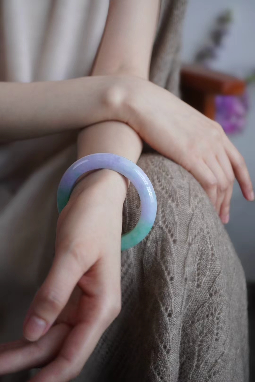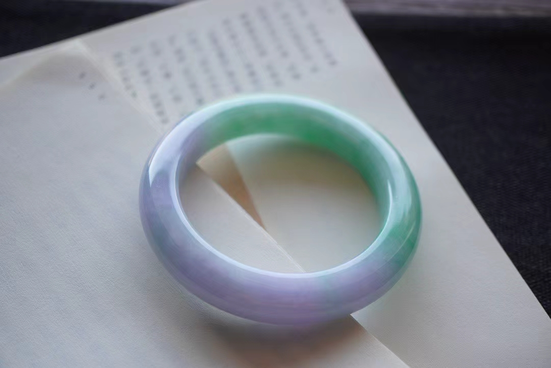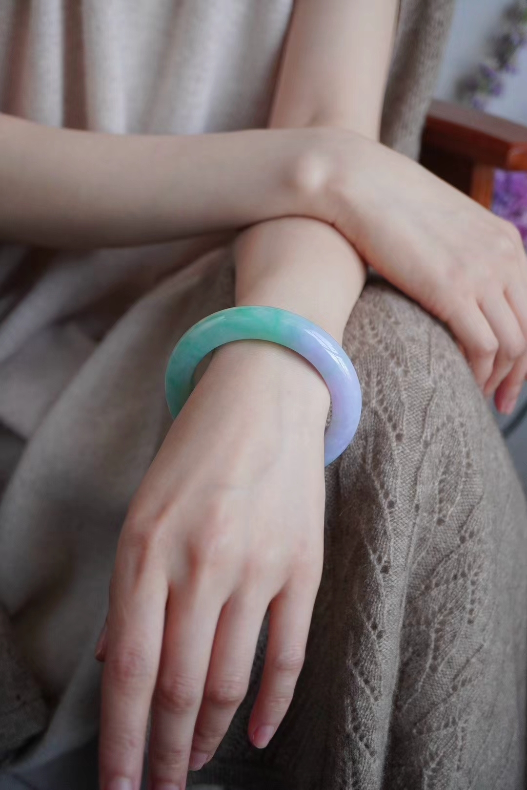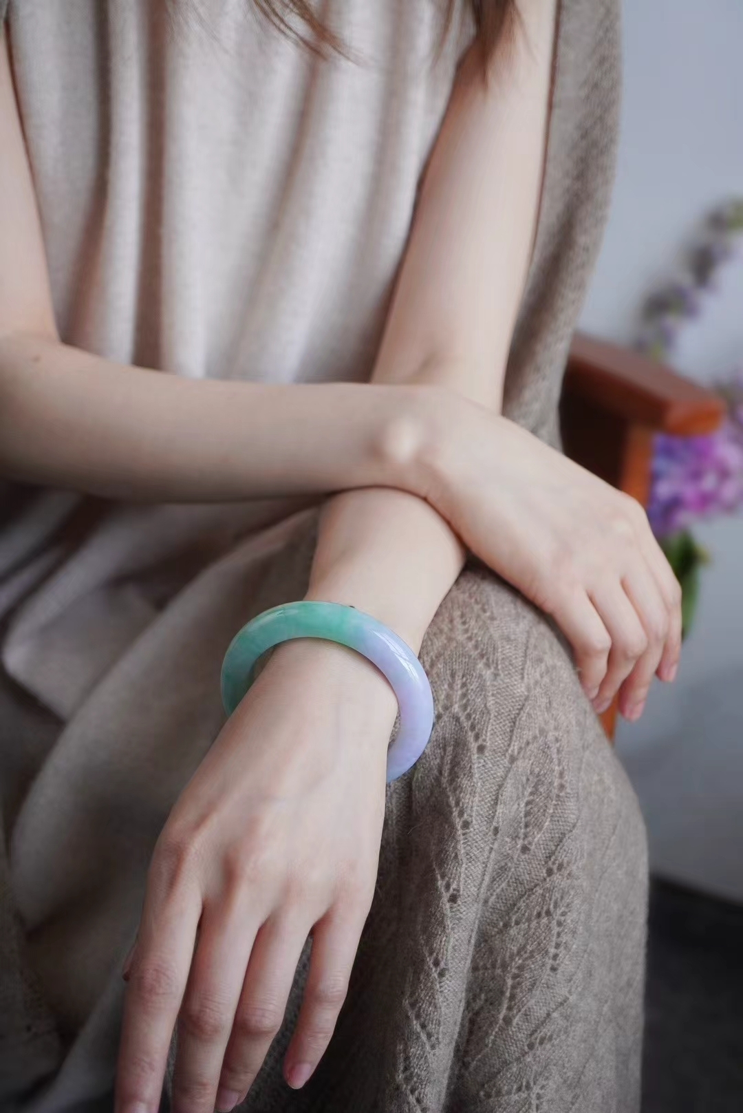 天然翡翠A玉,壓軸收藏美物推薦!60號正圈,本次專場最吸睛的一條春帶彩手鐲,一半綠翠,一半紫羅蘭,自然造物,實在太美好了。