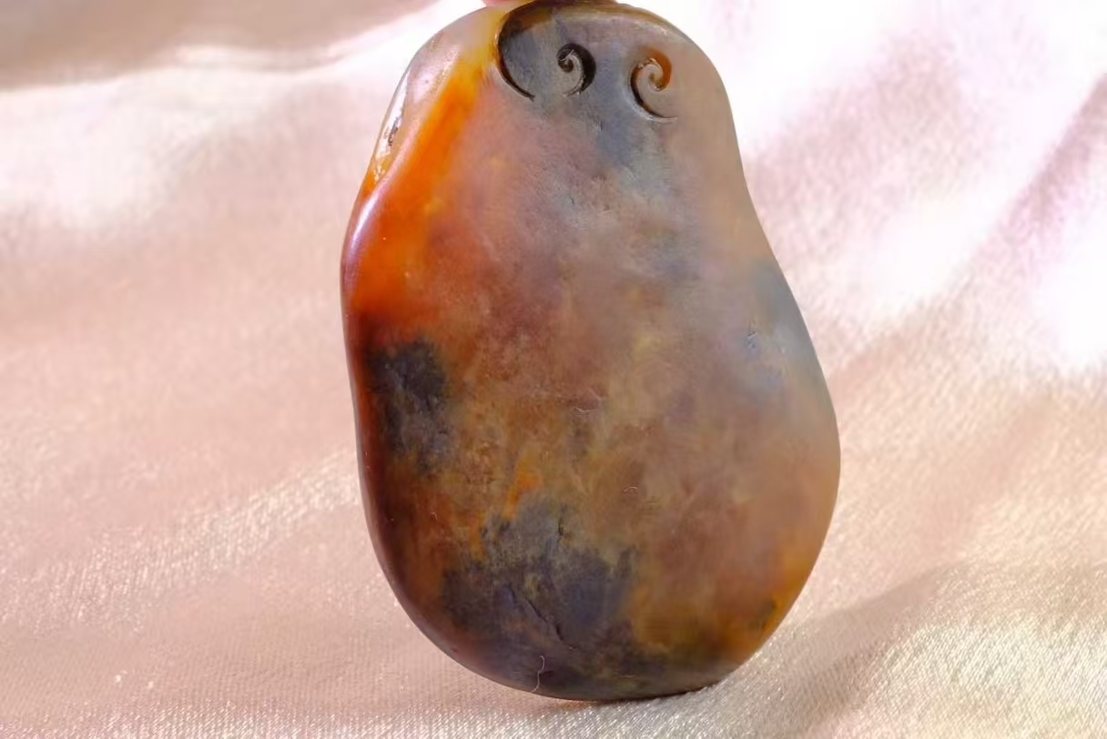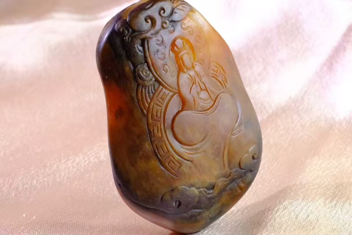 和田玉,新疆黃沁籽料,天然原石隨形,皮色濃郁又自然,從深褐到蜜黃的過渡超有層次感,觀音的線條雕得細膩柔和,神態安詳。