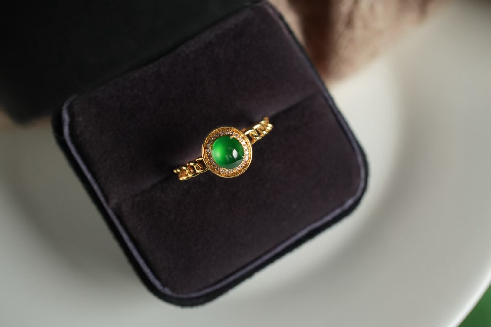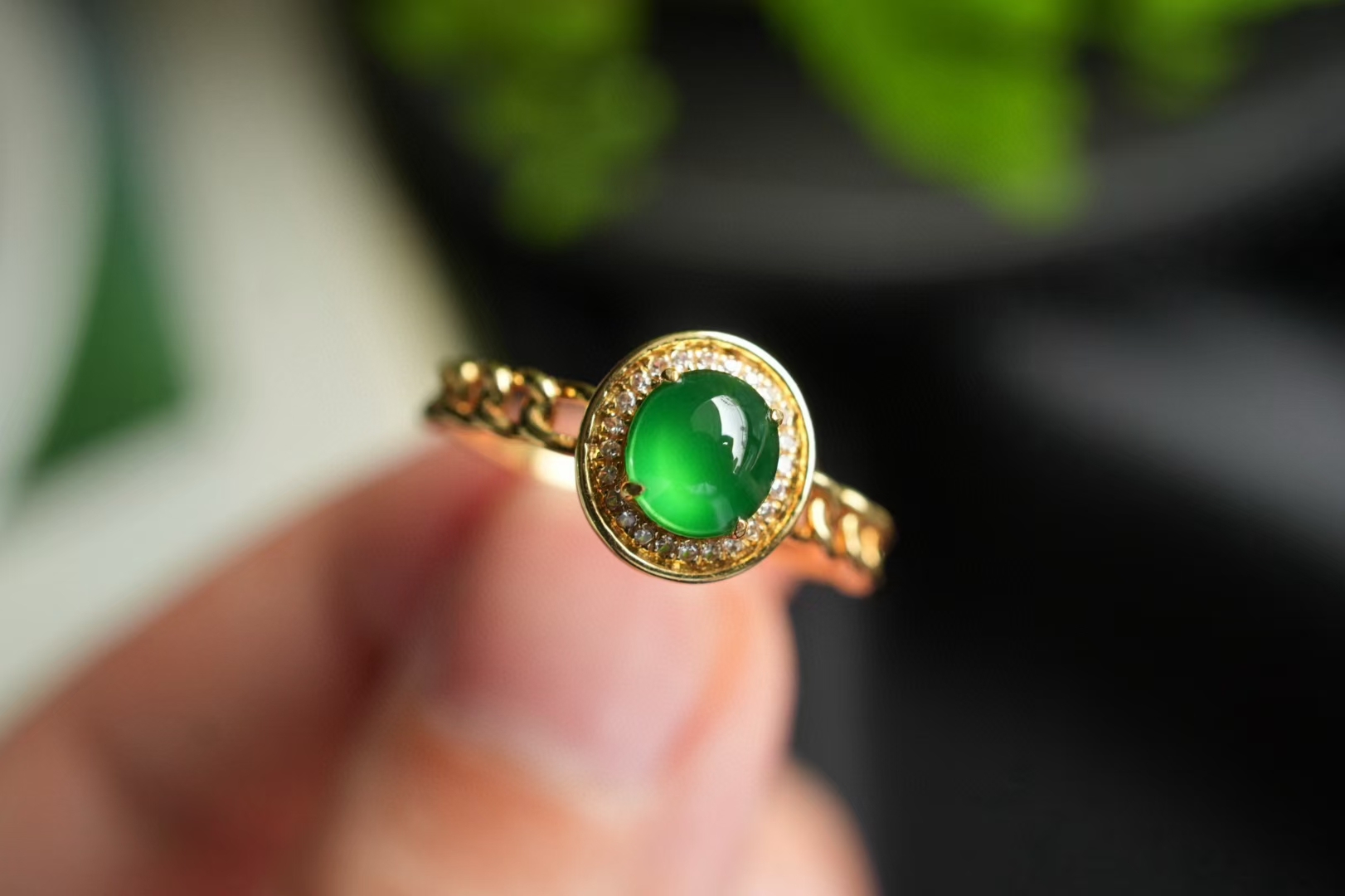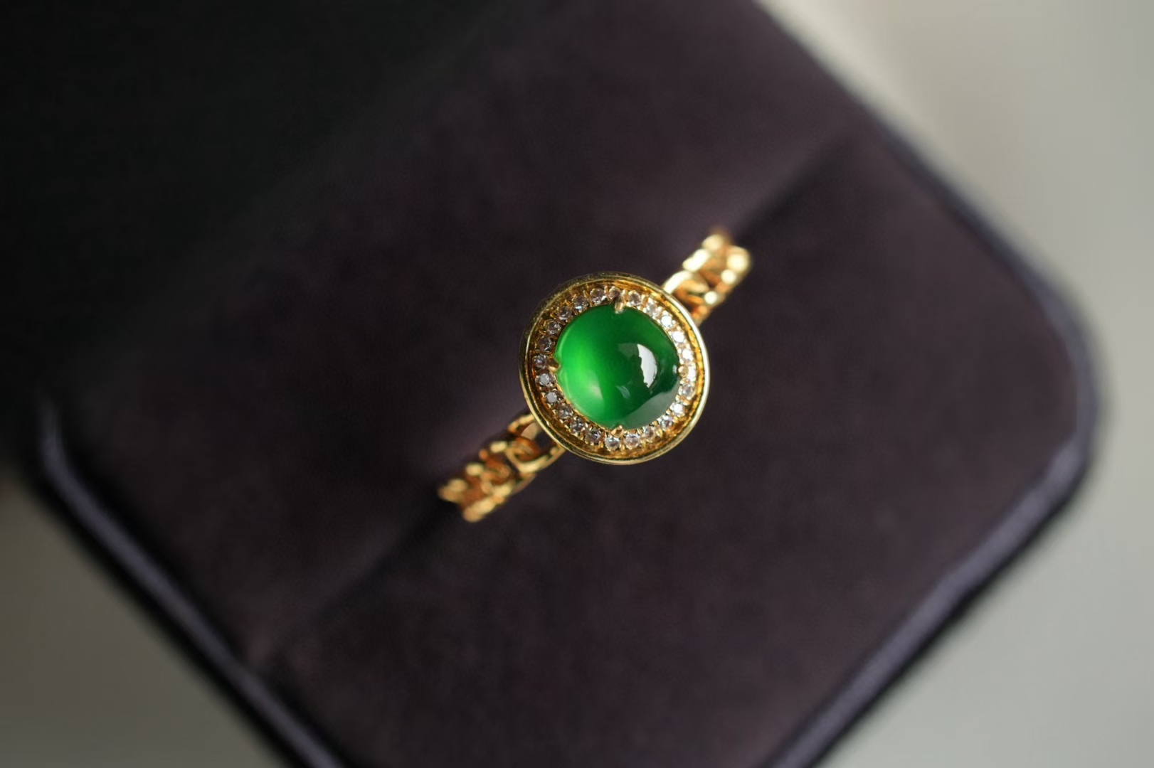 天然翡翠A玉,自帶時髦感的翡翠戒指,18K重金鏈條,飽滿渾圓台面,滿鑲鑽石,高冰種辣陽綠,起光感的綠,時髦迷人。