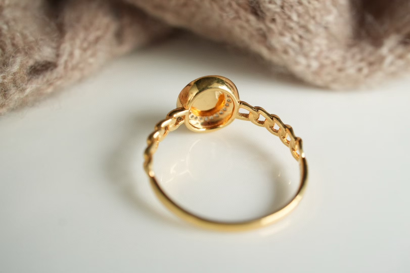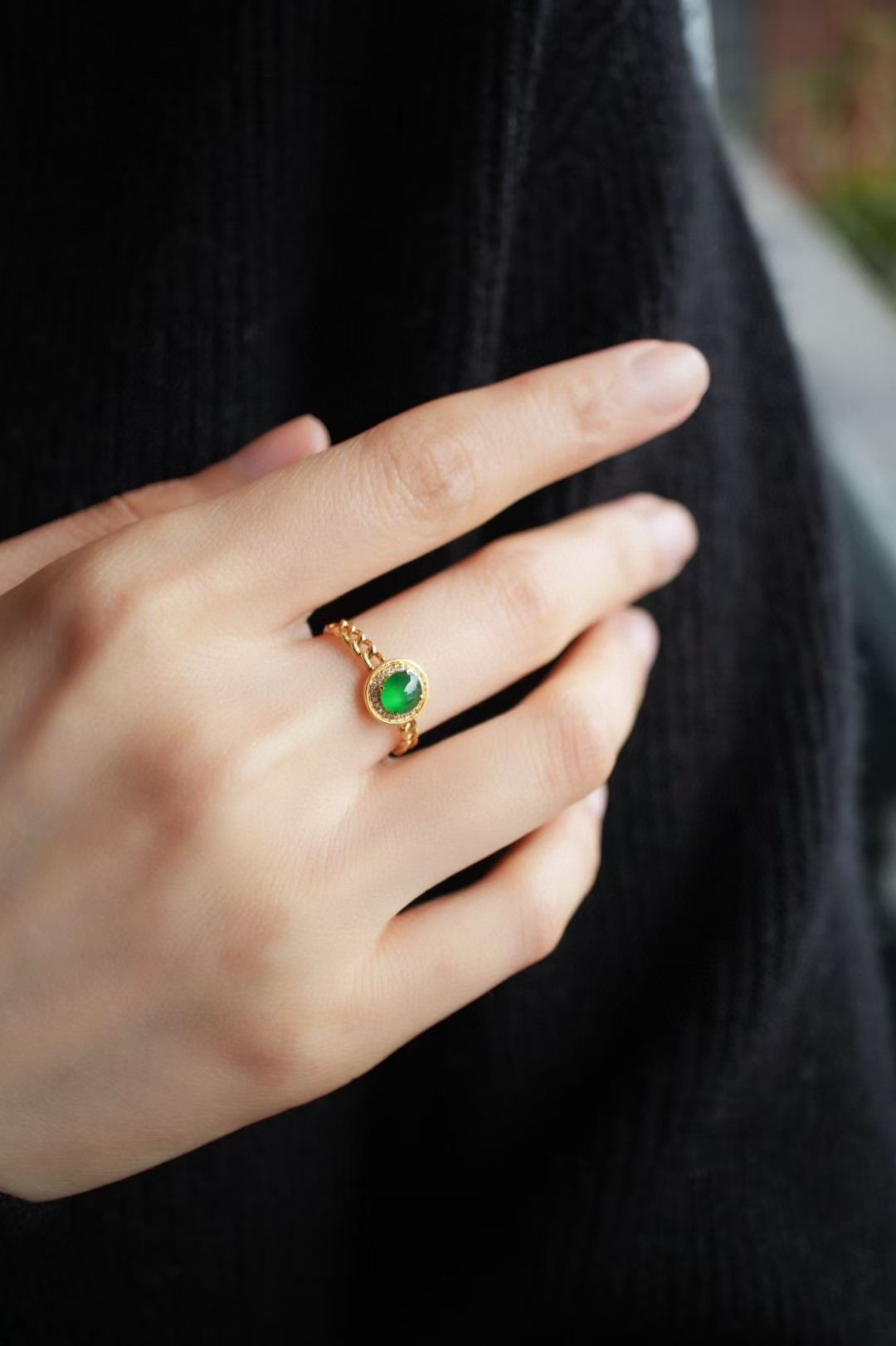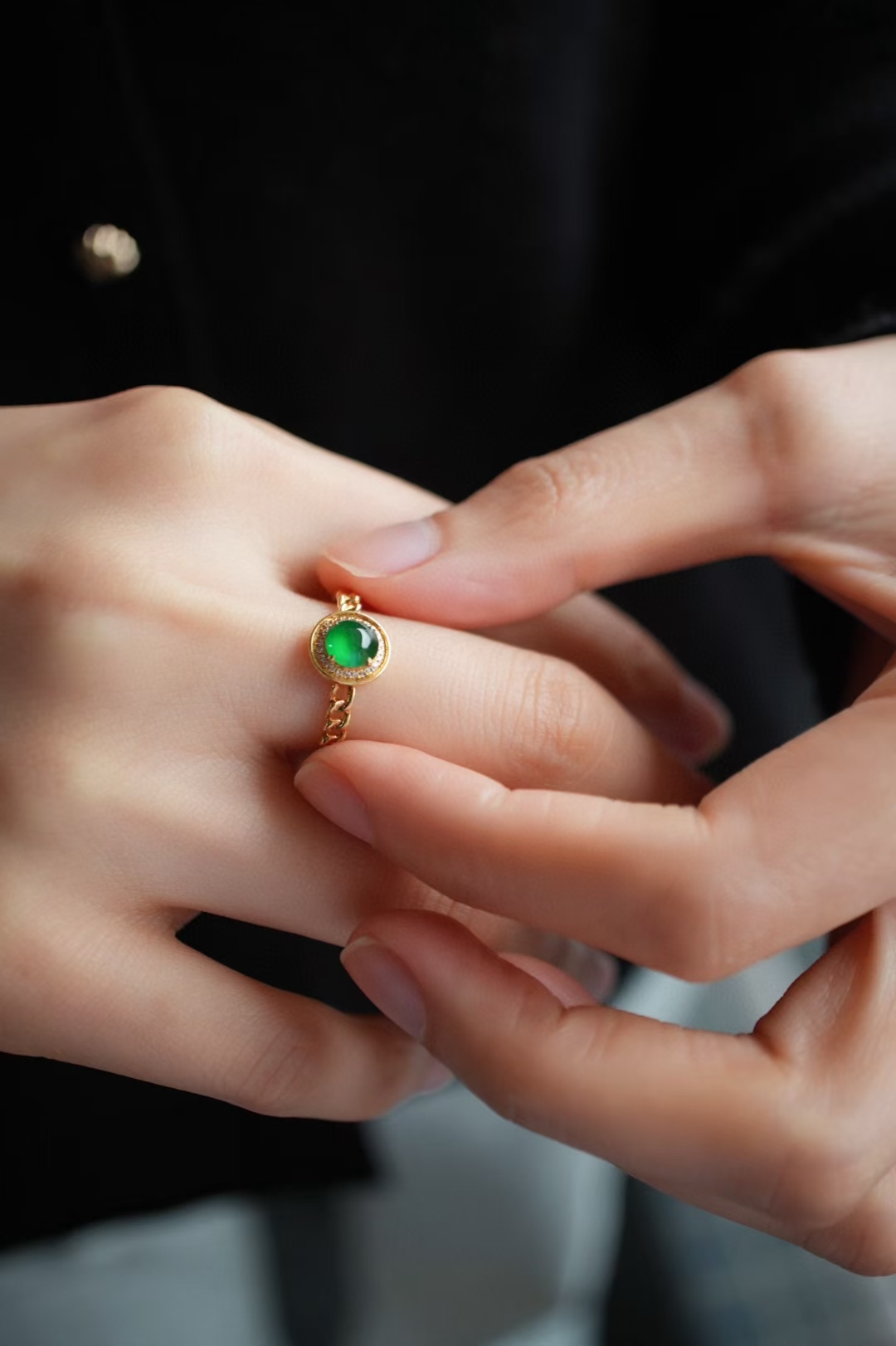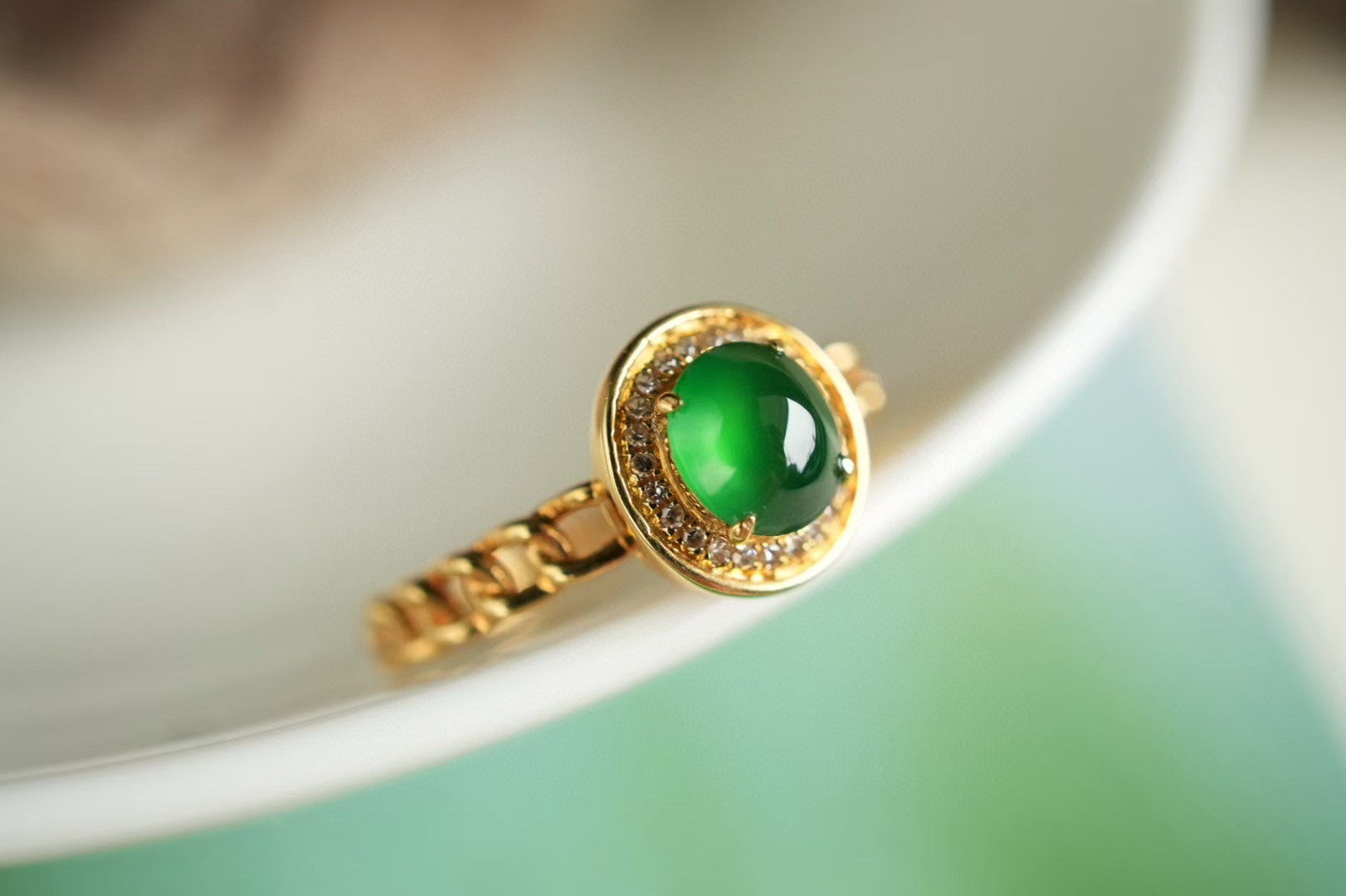天然翡翠A玉,自帶時髦感的翡翠戒指,18K重金鏈條,飽滿渾圓台面,滿鑲鑽石,高冰種辣陽綠,起光感的綠,時髦迷人。