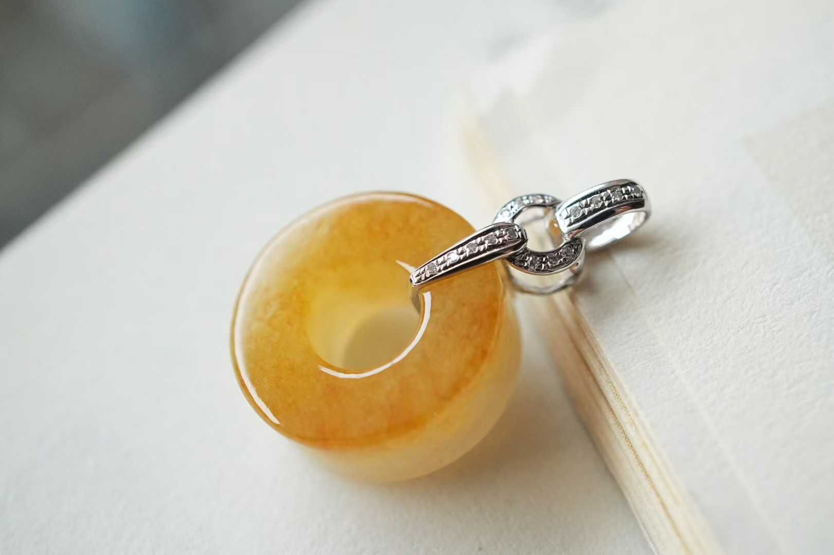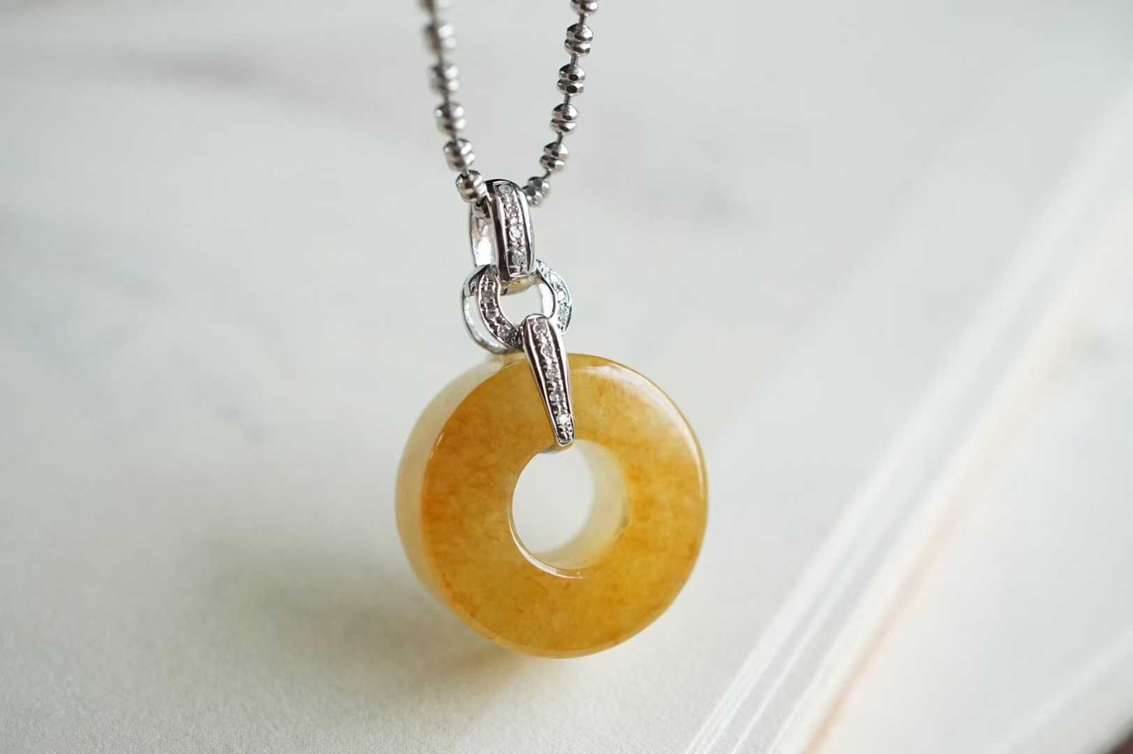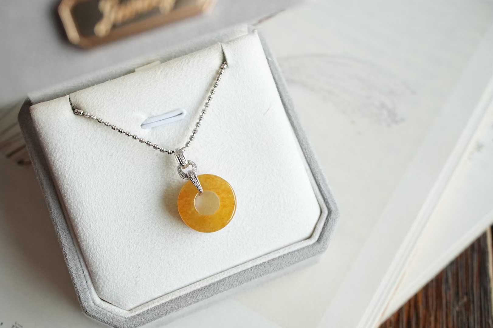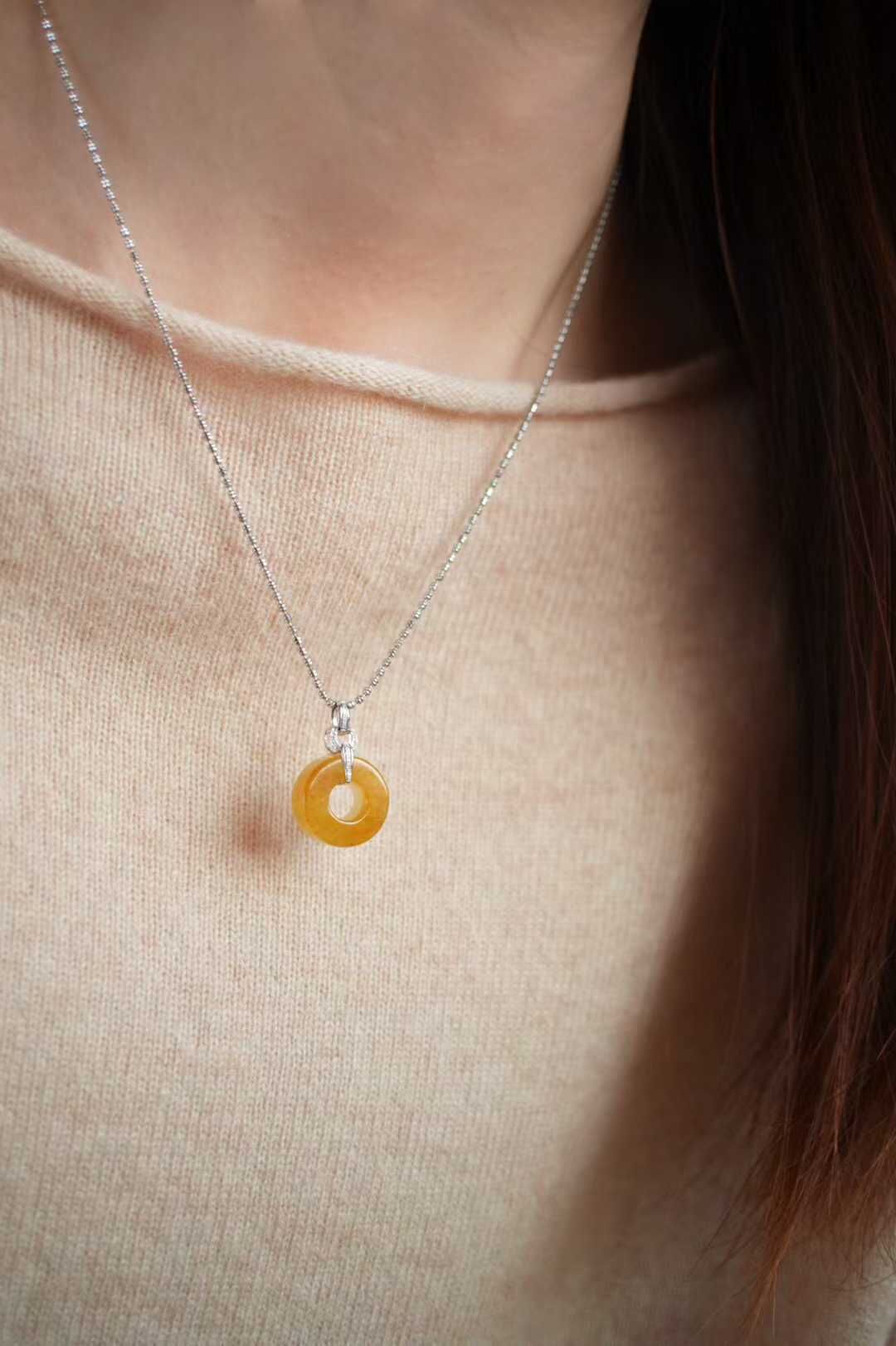 搭配18K白金鑲鑽扣頭,兼具美感與實用性。平安扣象徵圓滿平安,黃翡的暖調色澤代表財富與光明,願這枚吊墜護佑你歲歲平安、財運亨通。