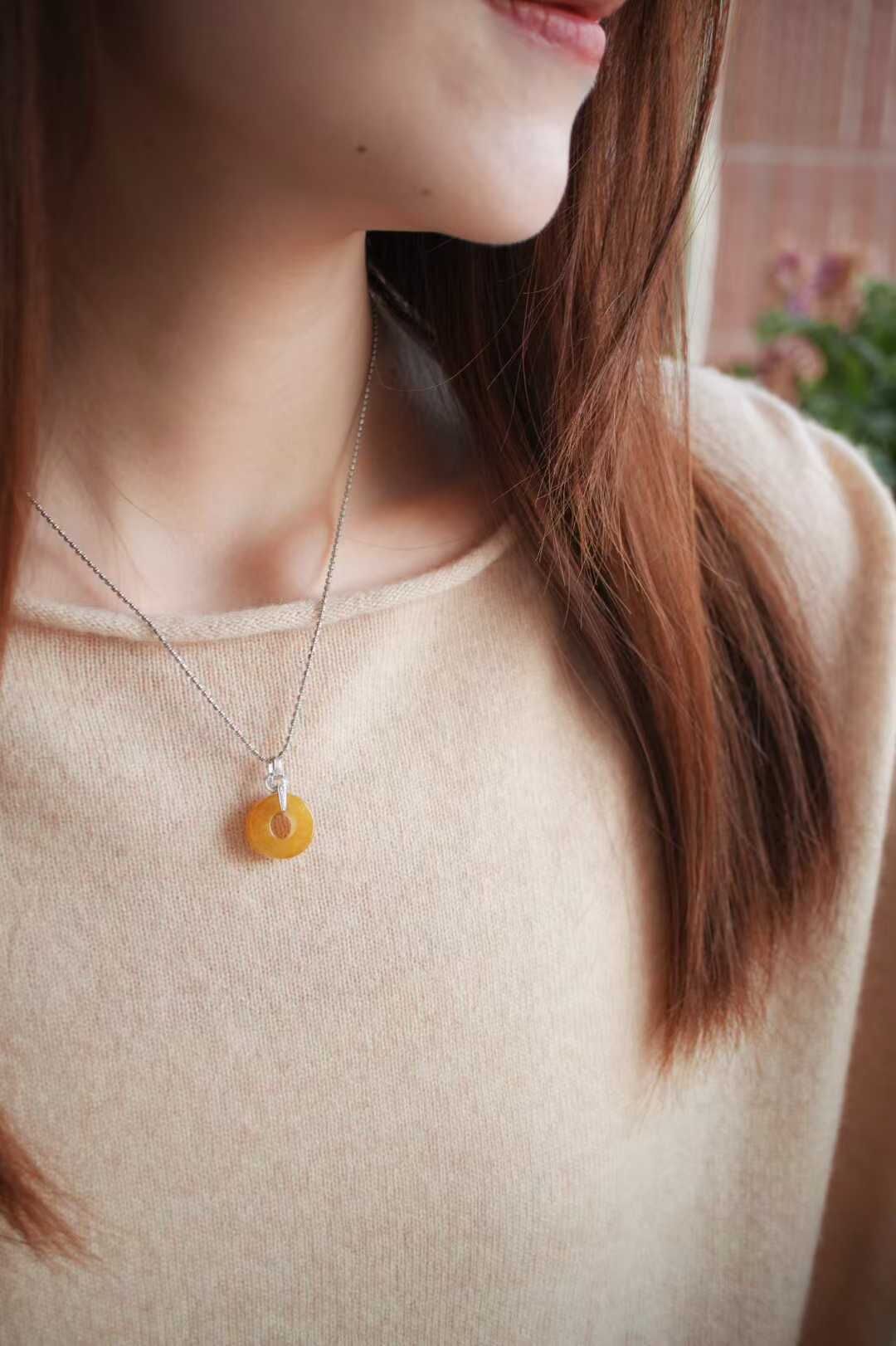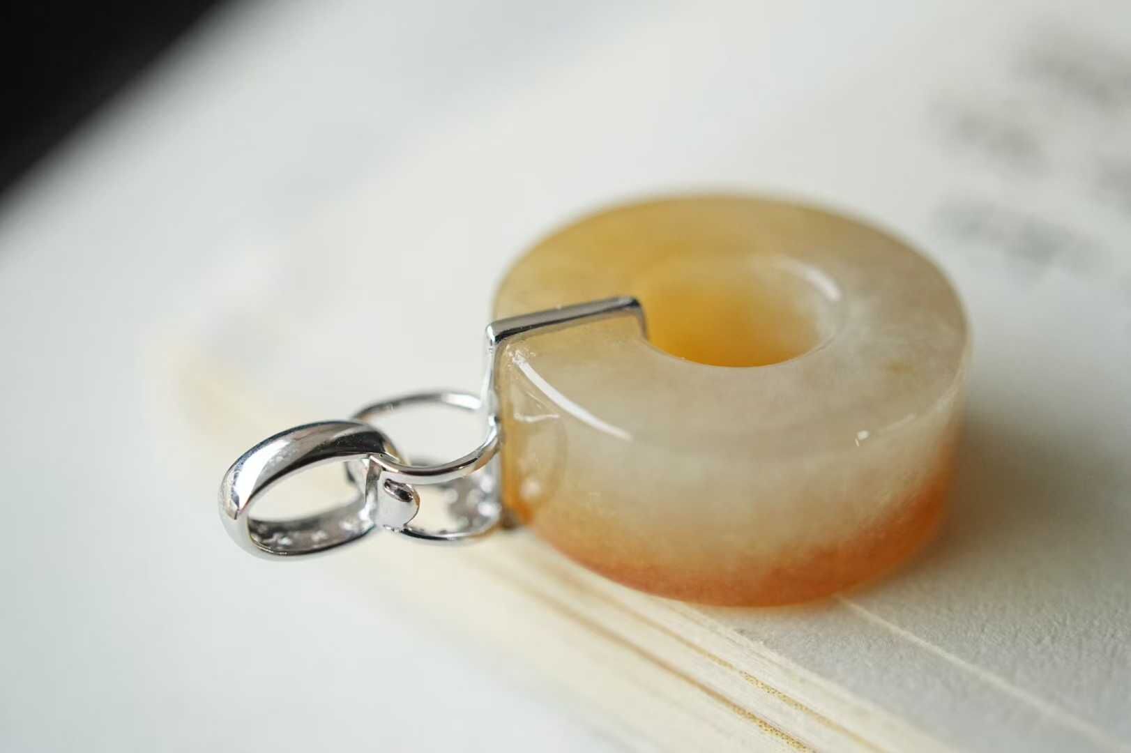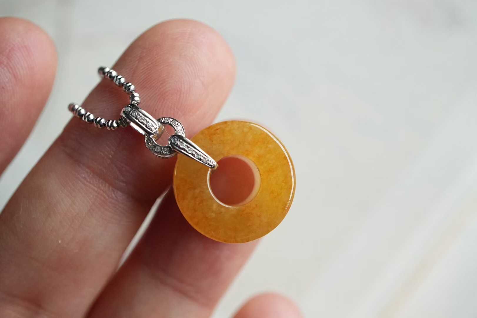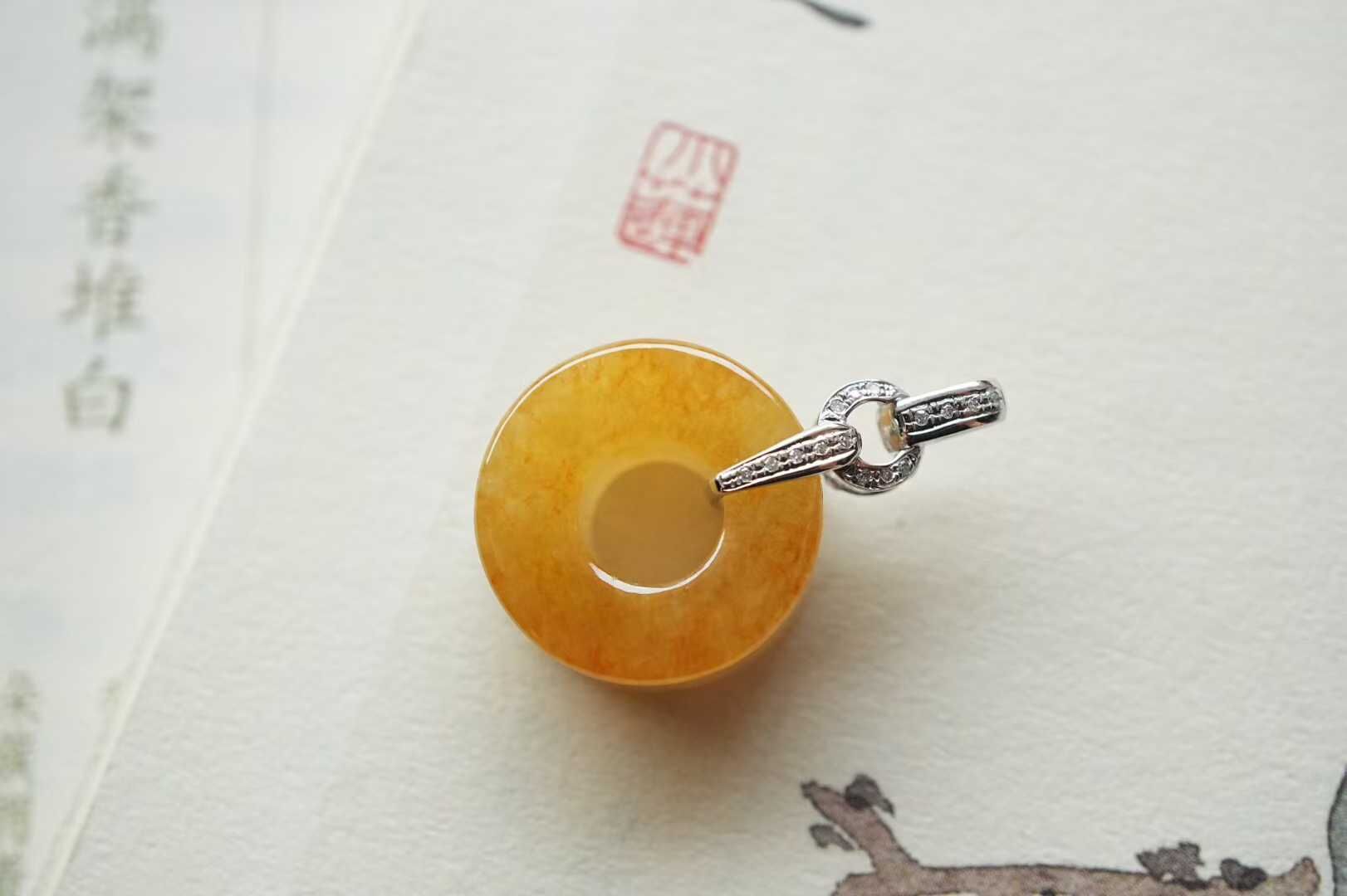 搭配18K白金鑲鑽扣頭,兼具美感與實用性。平安扣象徵圓滿平安,黃翡的暖調色澤代表財富與光明,願這枚吊墜護佑你歲歲平安、財運亨通。