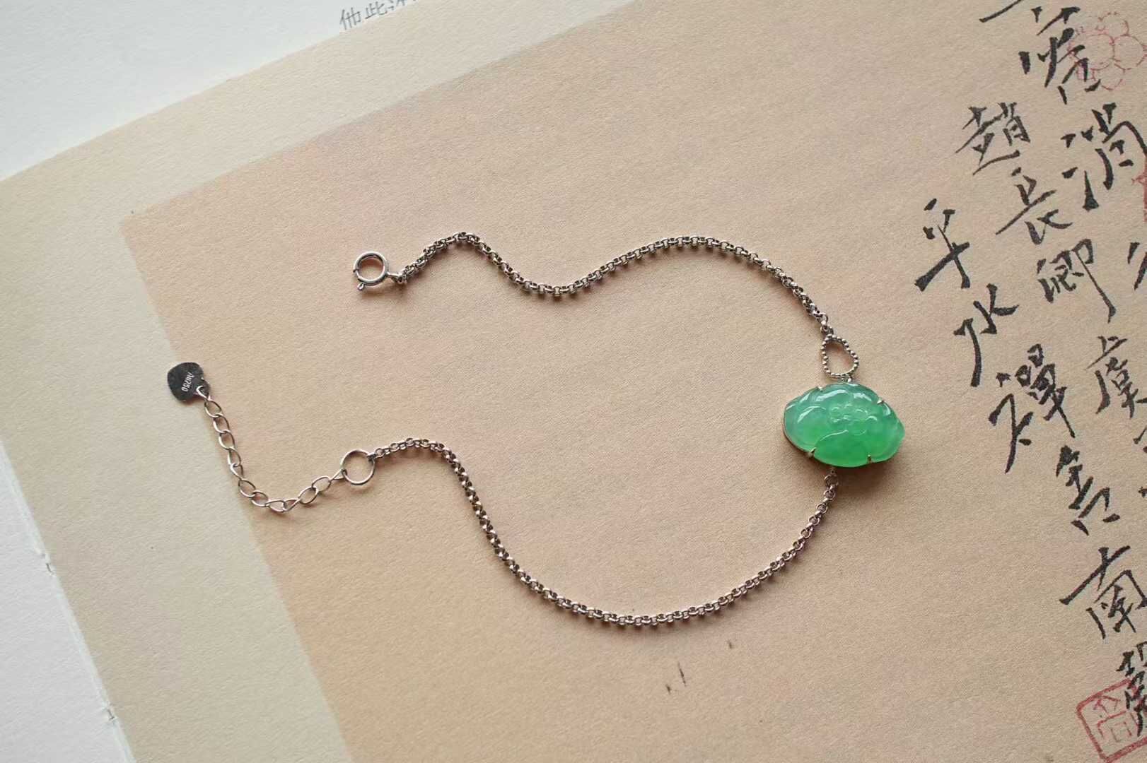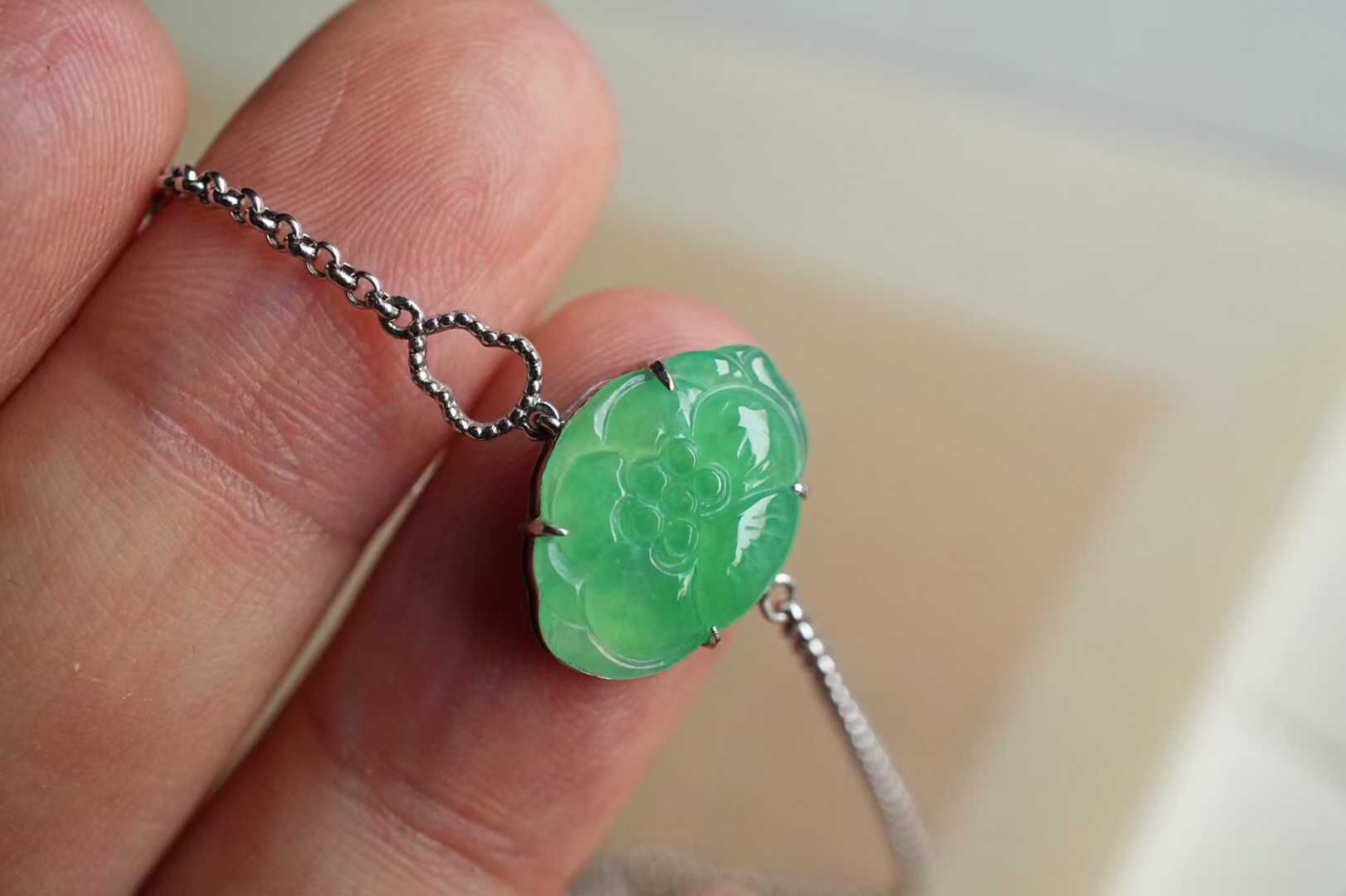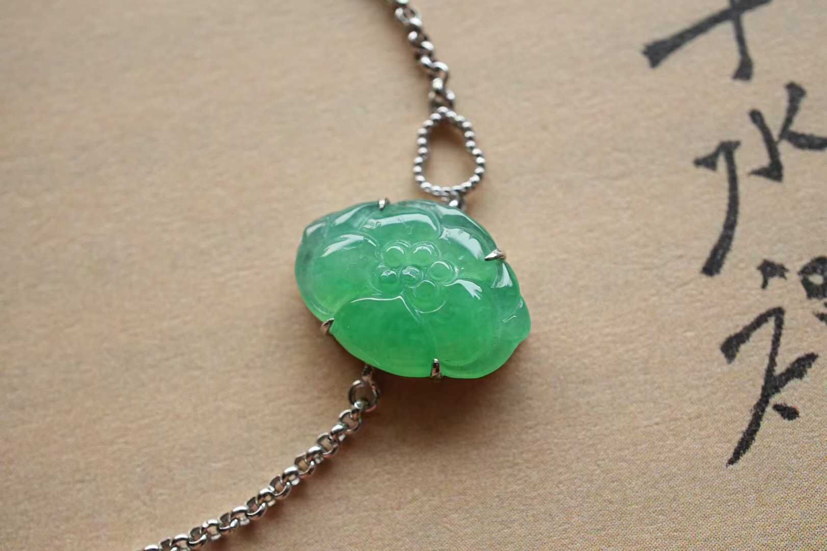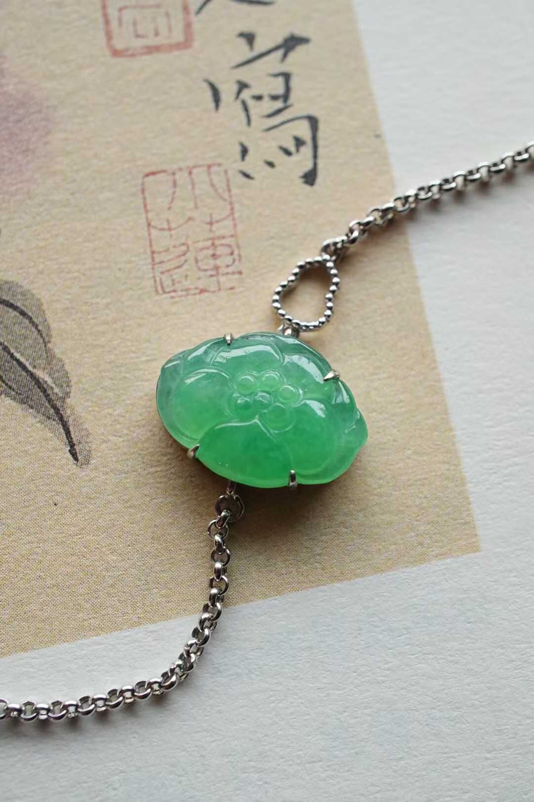 天然翡翠A玉,精選緬料老坑種,冰種陽綠翡翠,質地細膩通透,色澤鮮陽均勻,整體清新明媚。蓮花採用立體雕刻工藝,線條流暢生動。