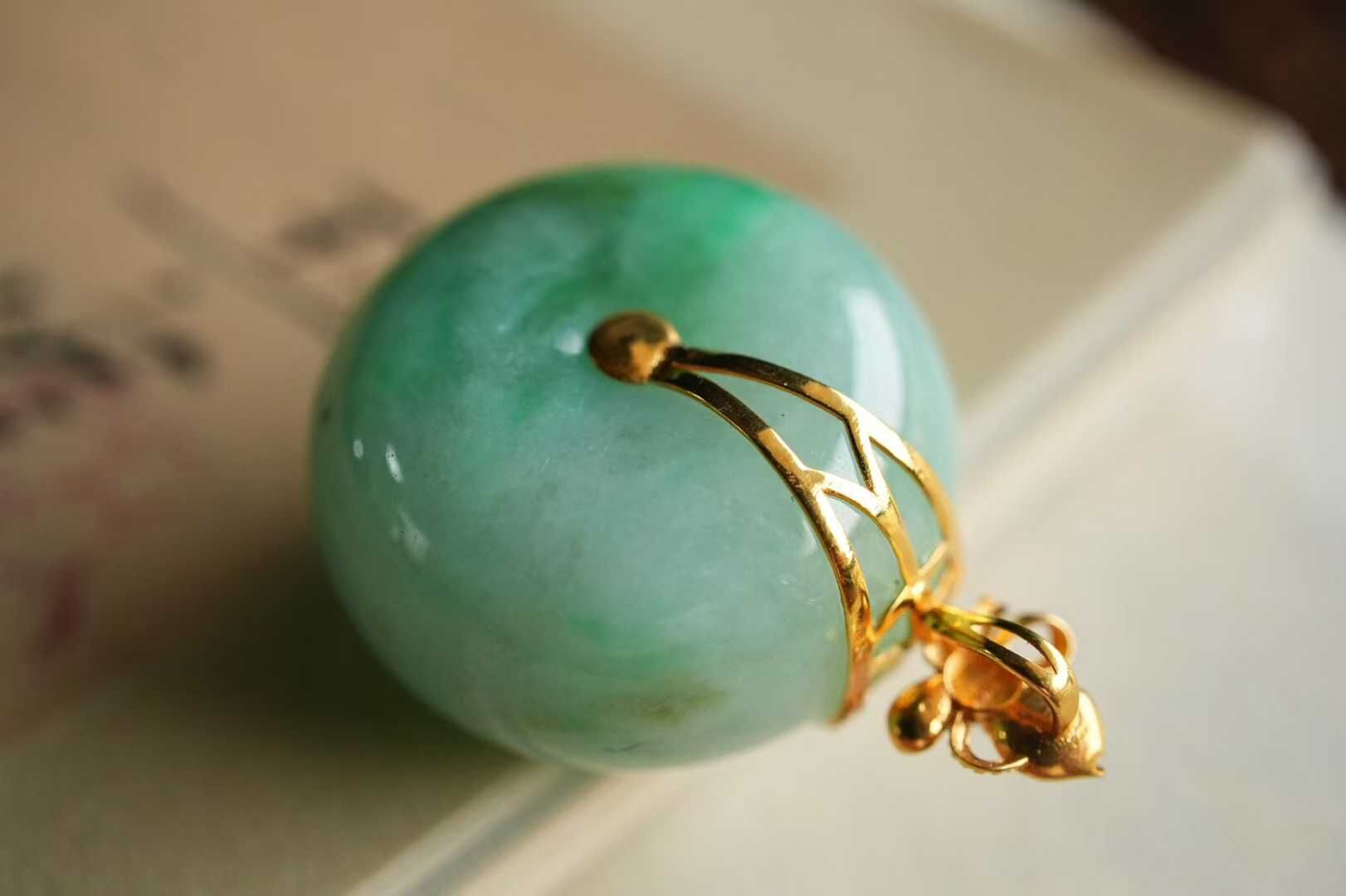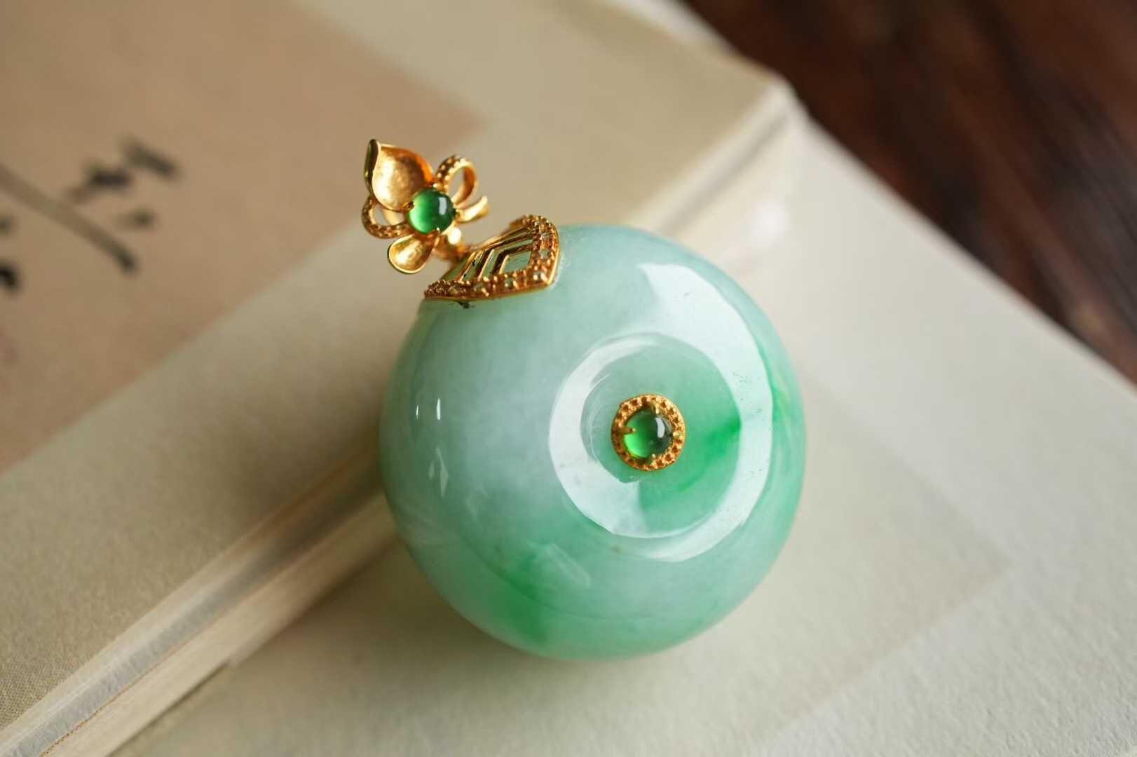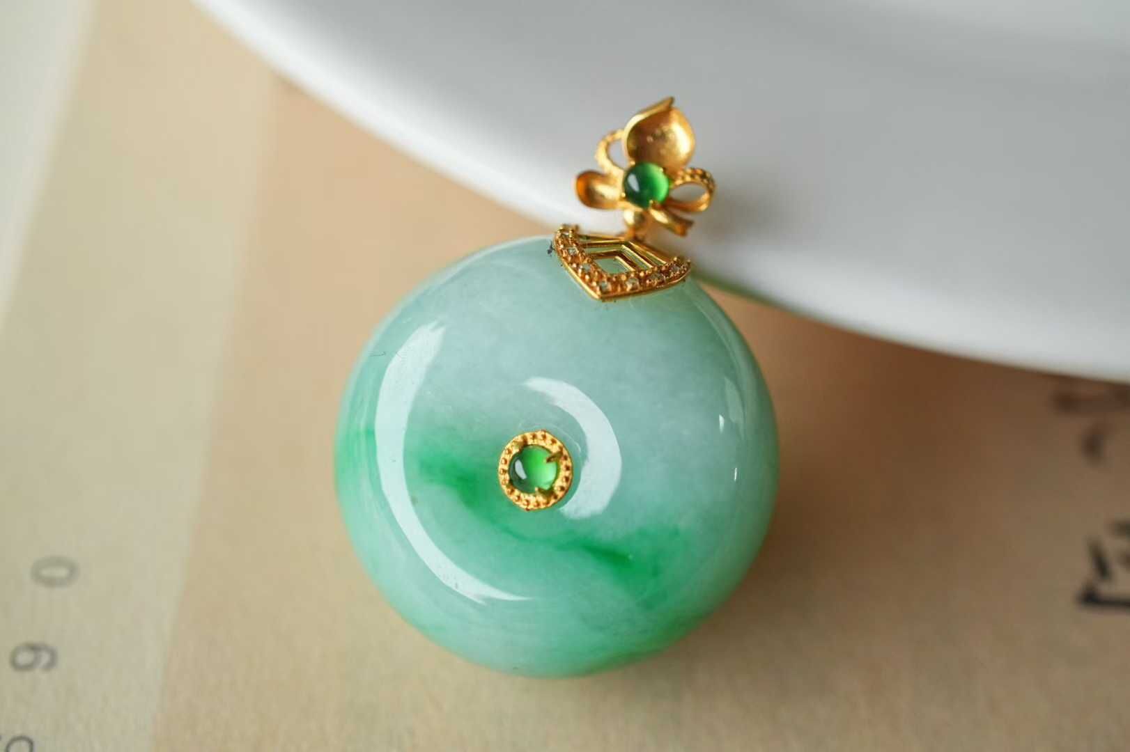 天然翡翠A玉,緬料。“春水生綠漪,平安扣清圓”這枚飄綠平安扣,如將初春湖面的一抹新綠凝於扣中。質地細膩水潤,翠色鮮活靈動。