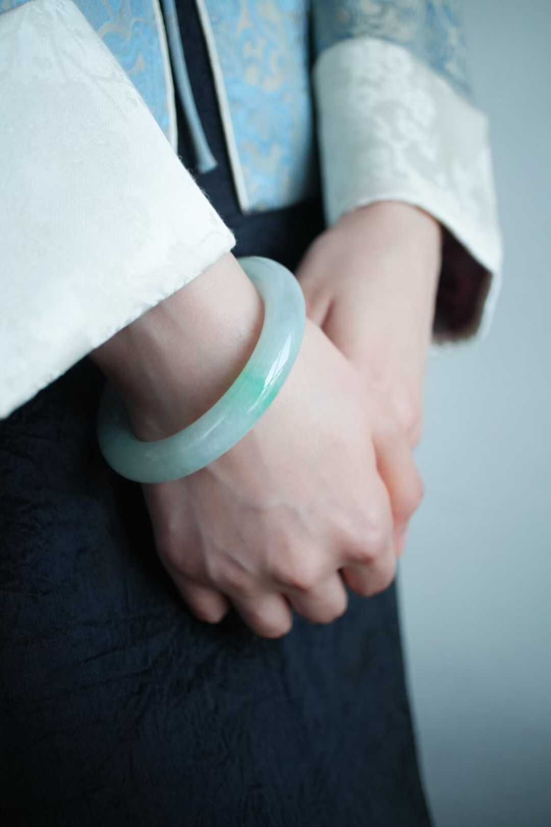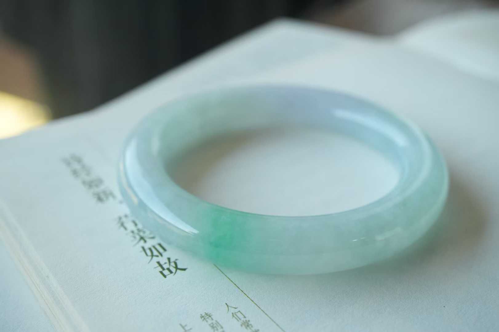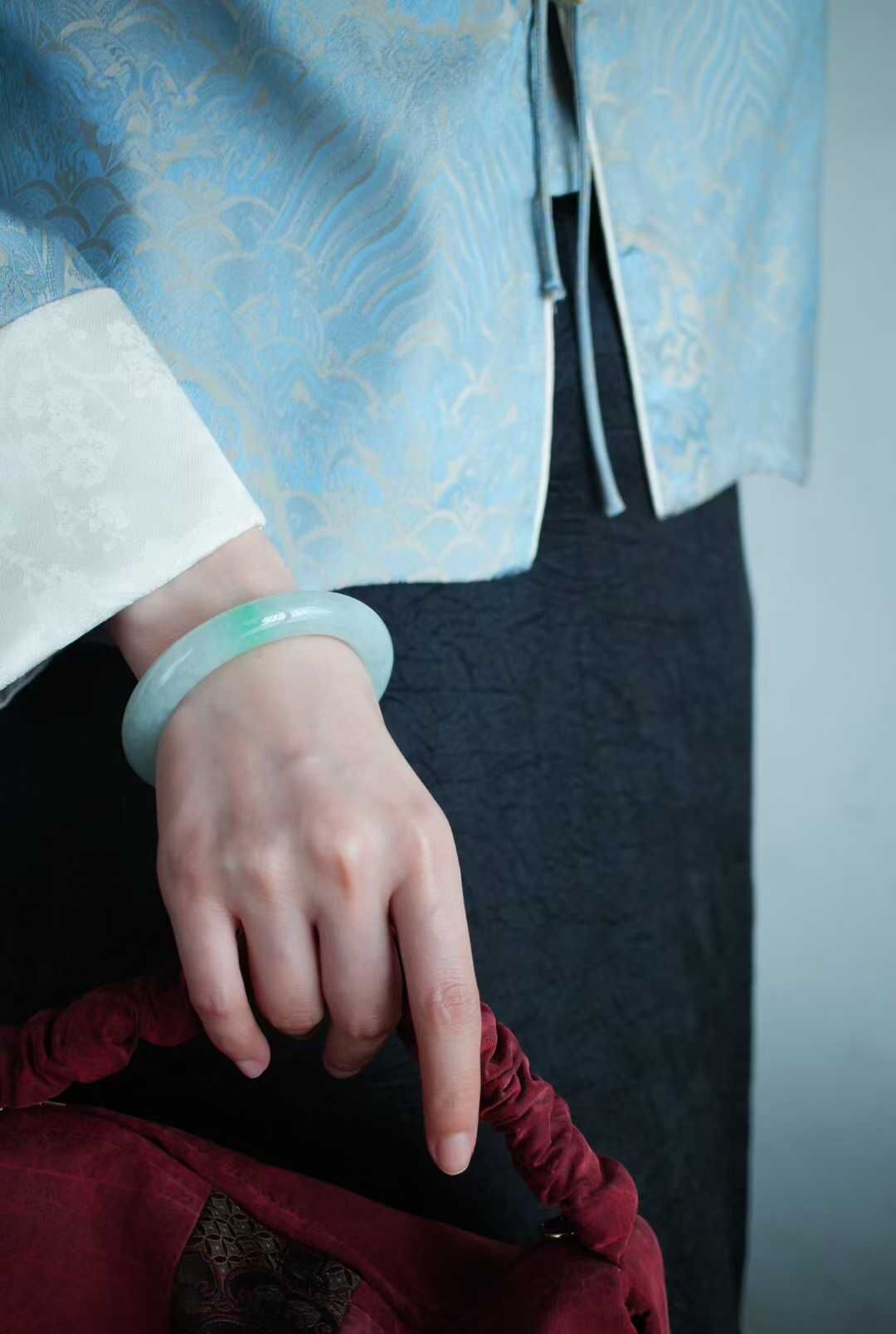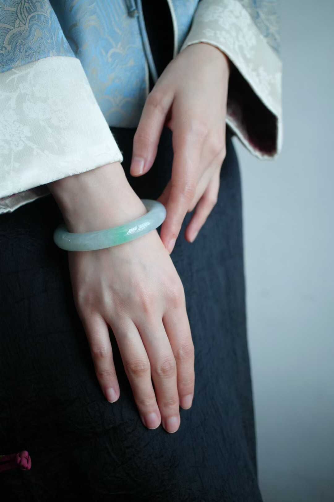 • 翡翠冰糯種白底青圓條手鐲,天然翡翠A玉, 緬甸玉, Jade, Jadeite