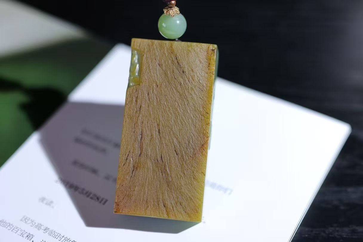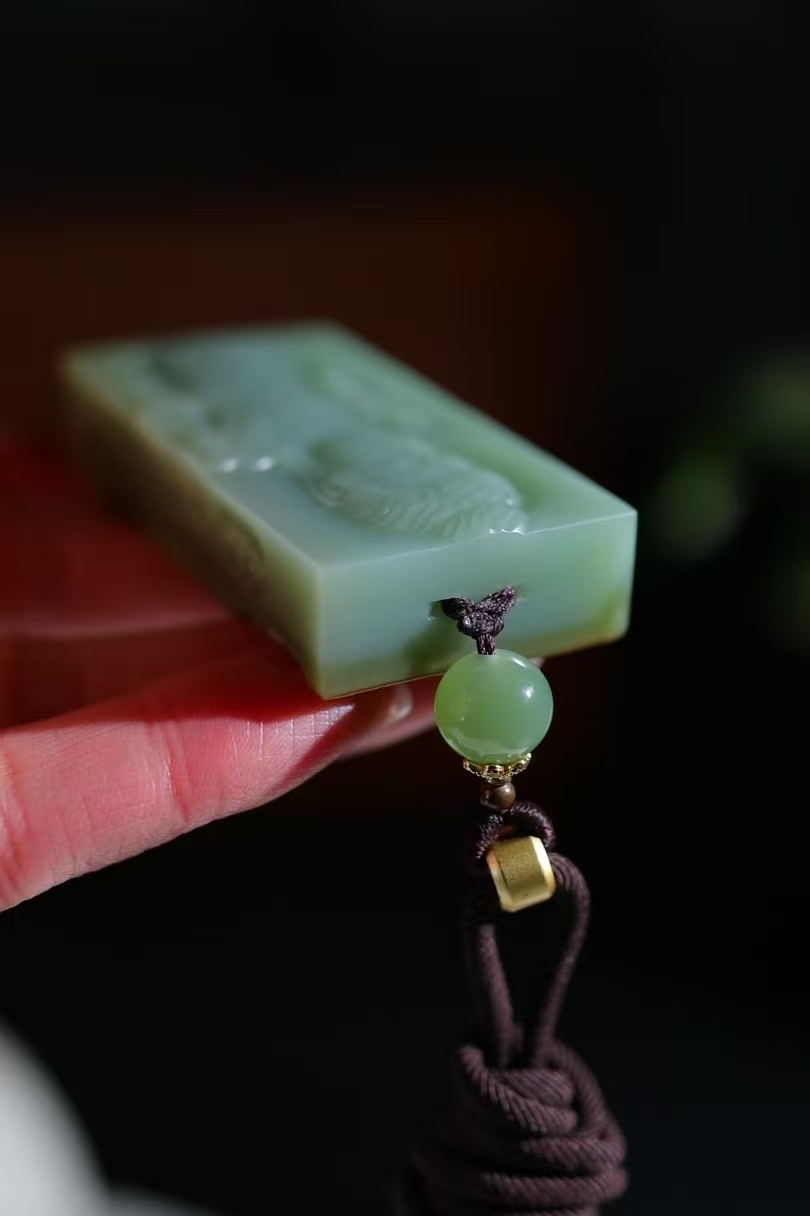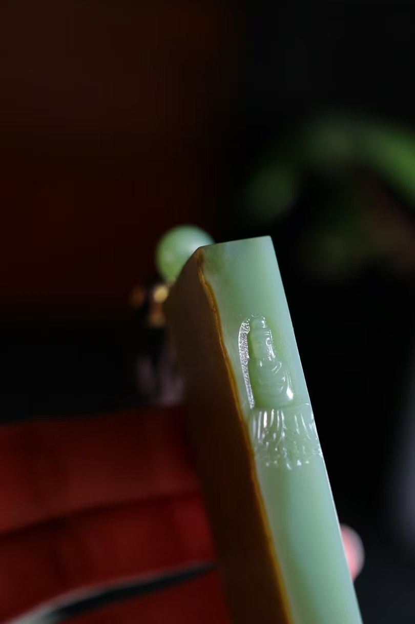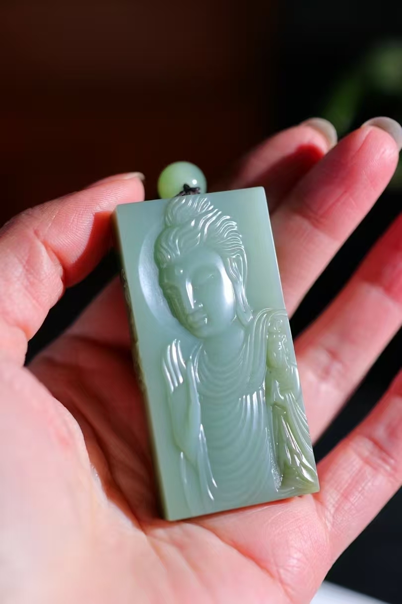 天然和田玉,原皮籽碧玉玉牌,雕刻有佛像等宗教題材圖案,碧玉色澤濃郁,雕刻工藝精細,展現出宗教文化與玉石工藝的融合,常作為宗教文化相關的飾品或收藏品,蘊含祈福、信仰等寓意。