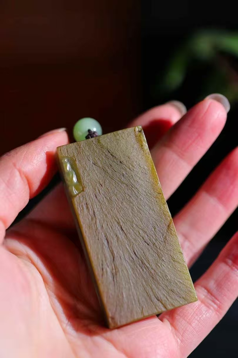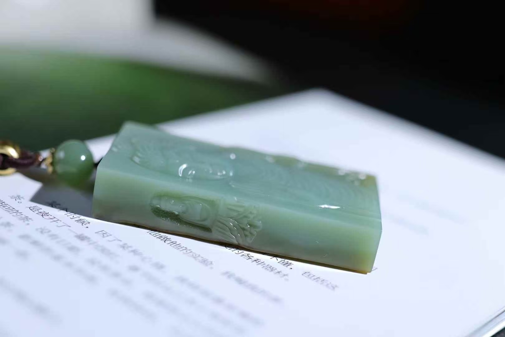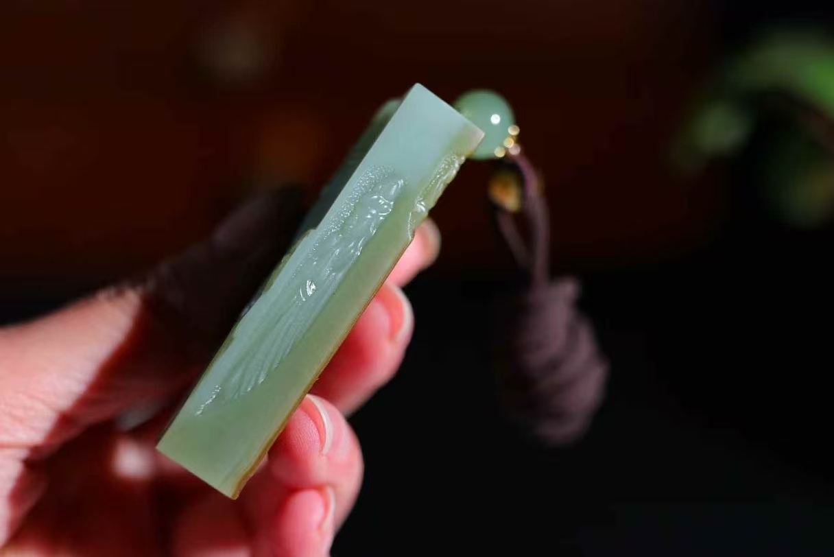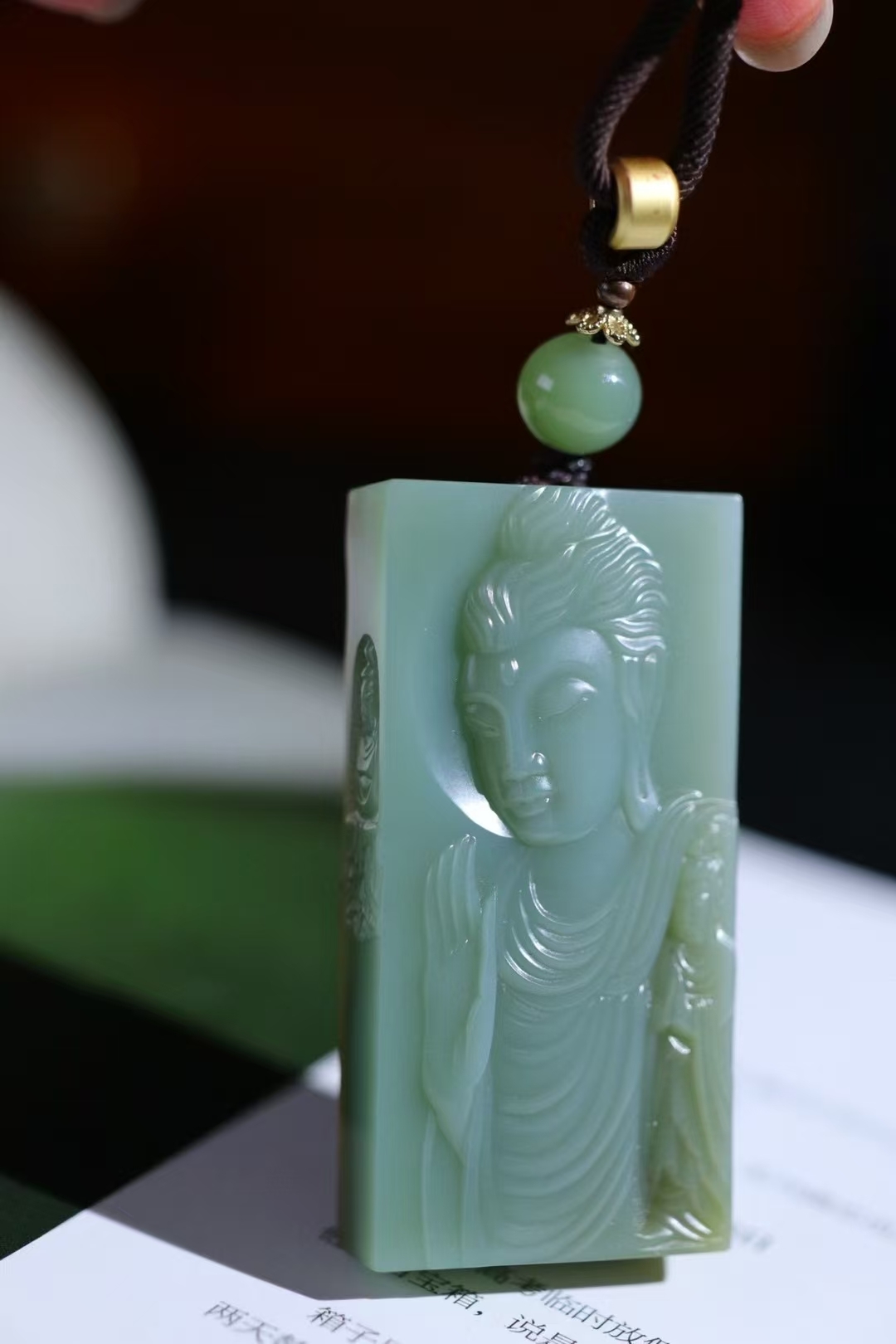 天然和田玉,原皮籽碧玉玉牌,雕刻有佛像等宗教題材圖案,碧玉色澤濃郁,雕刻工藝精細,展現出宗教文化與玉石工藝的融合,常作為宗教文化相關的飾品或收藏品,蘊含祈福、信仰等寓意。