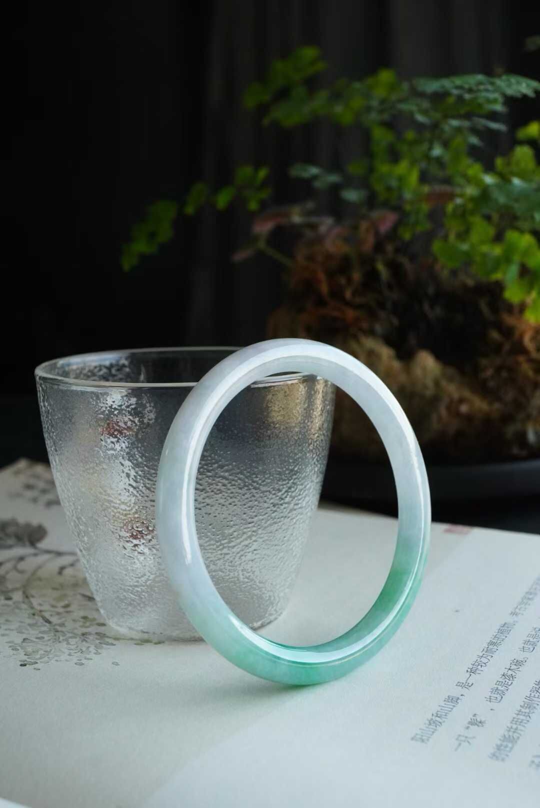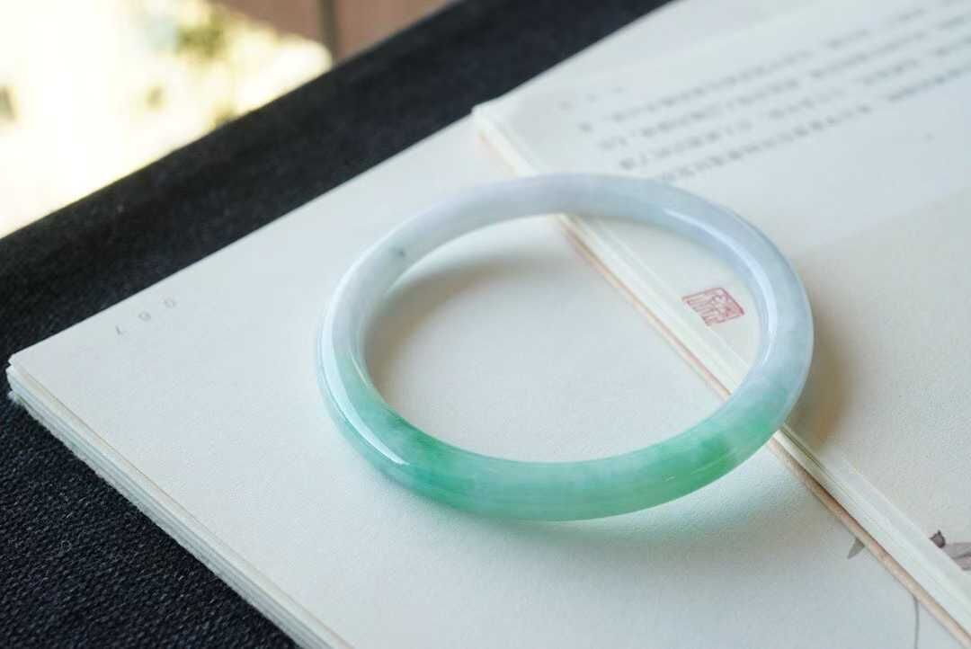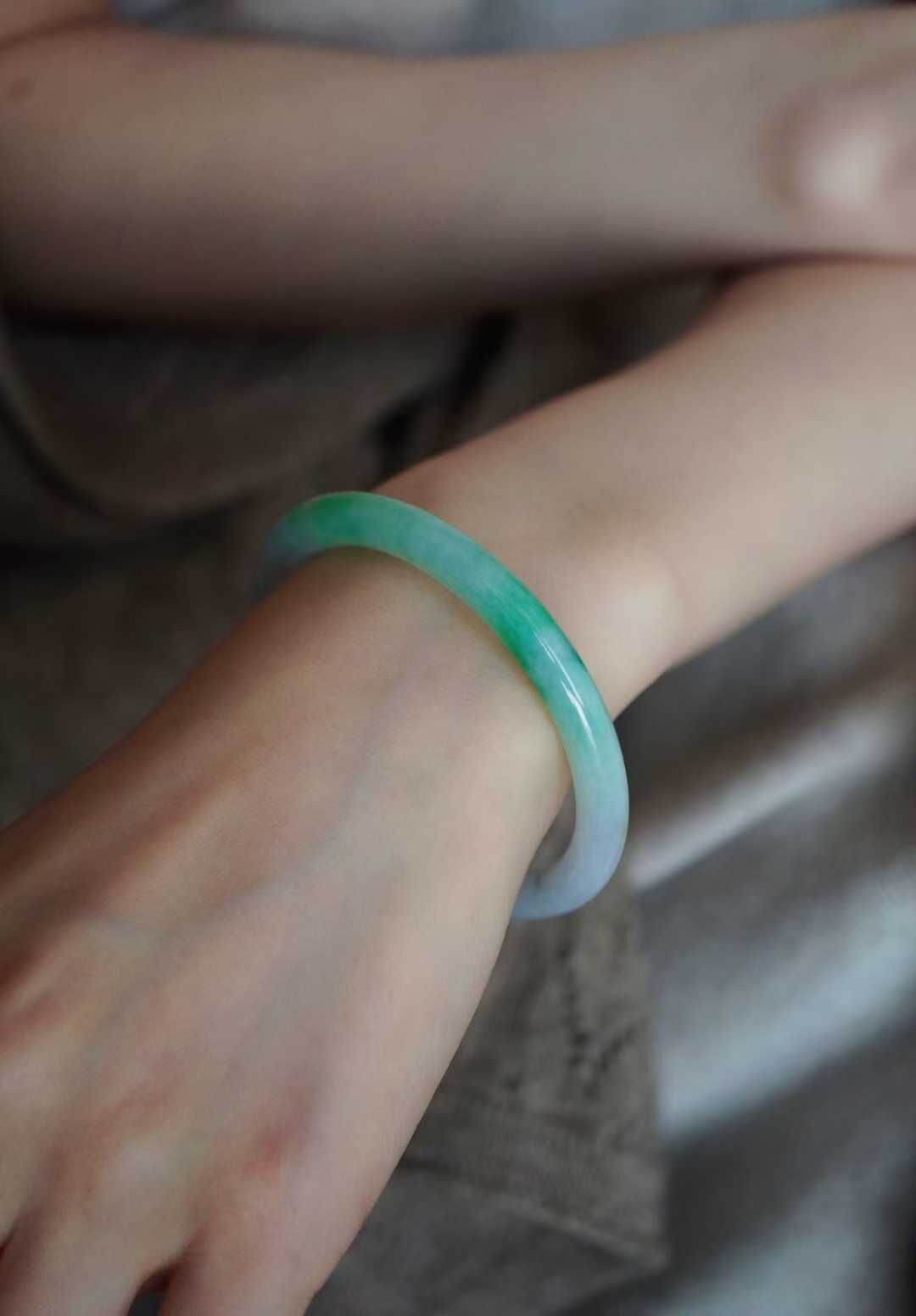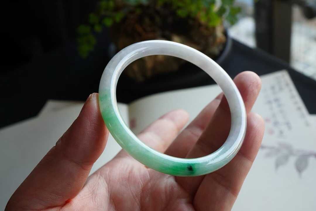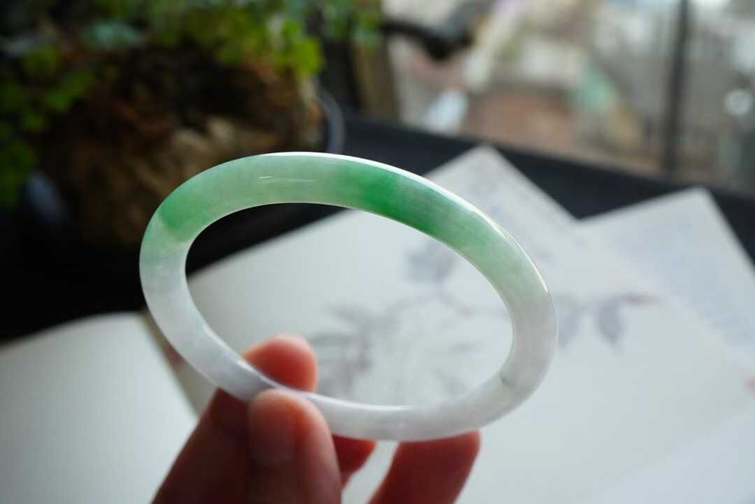 天然翡翠A玉,圓條54黃金圈口,55都可以戴。緬料老坑種,種老水足,色辣陽綠,底子冰潤細膩。飄一點濃翠,完美品相,性價比絕高!