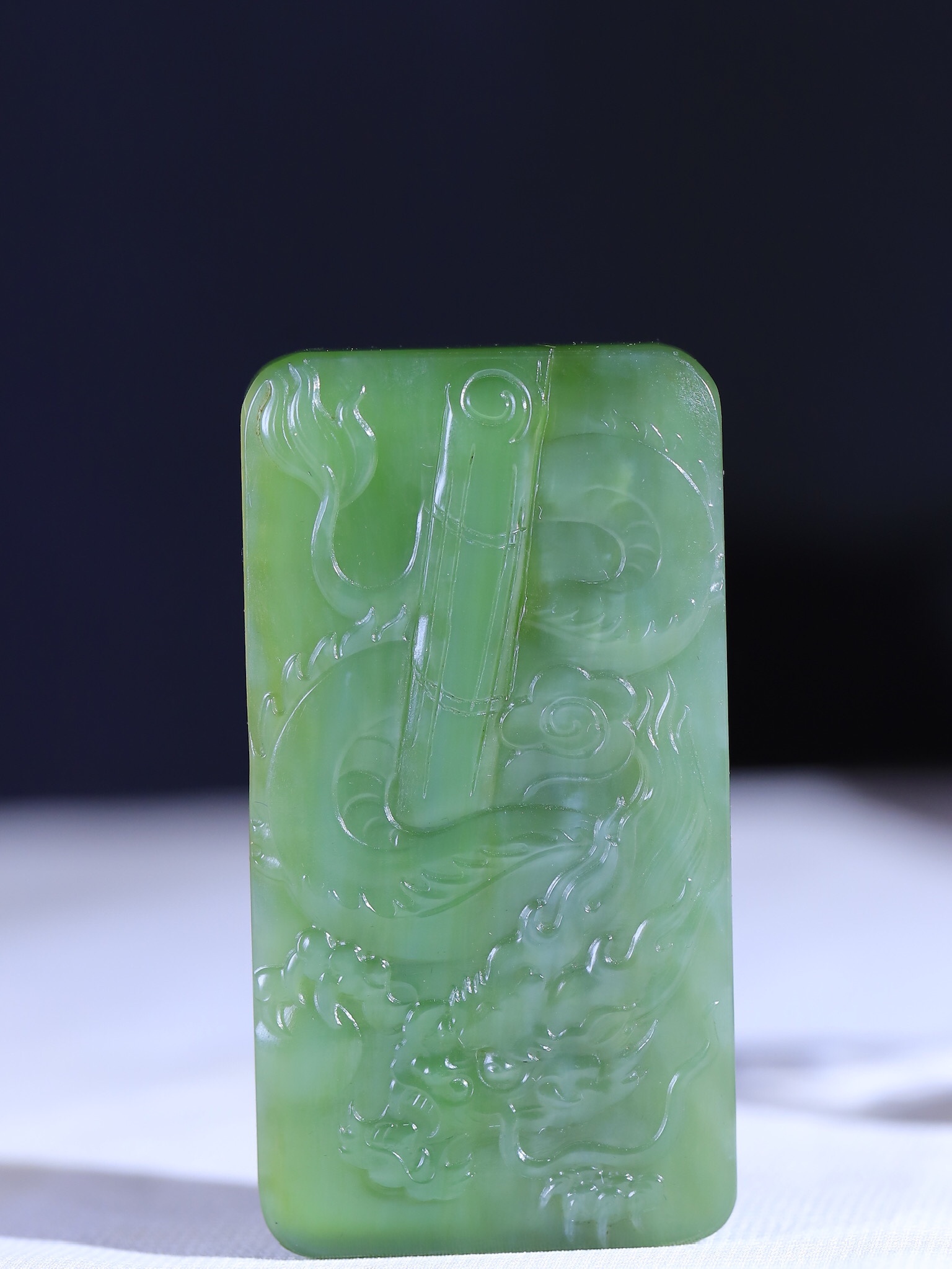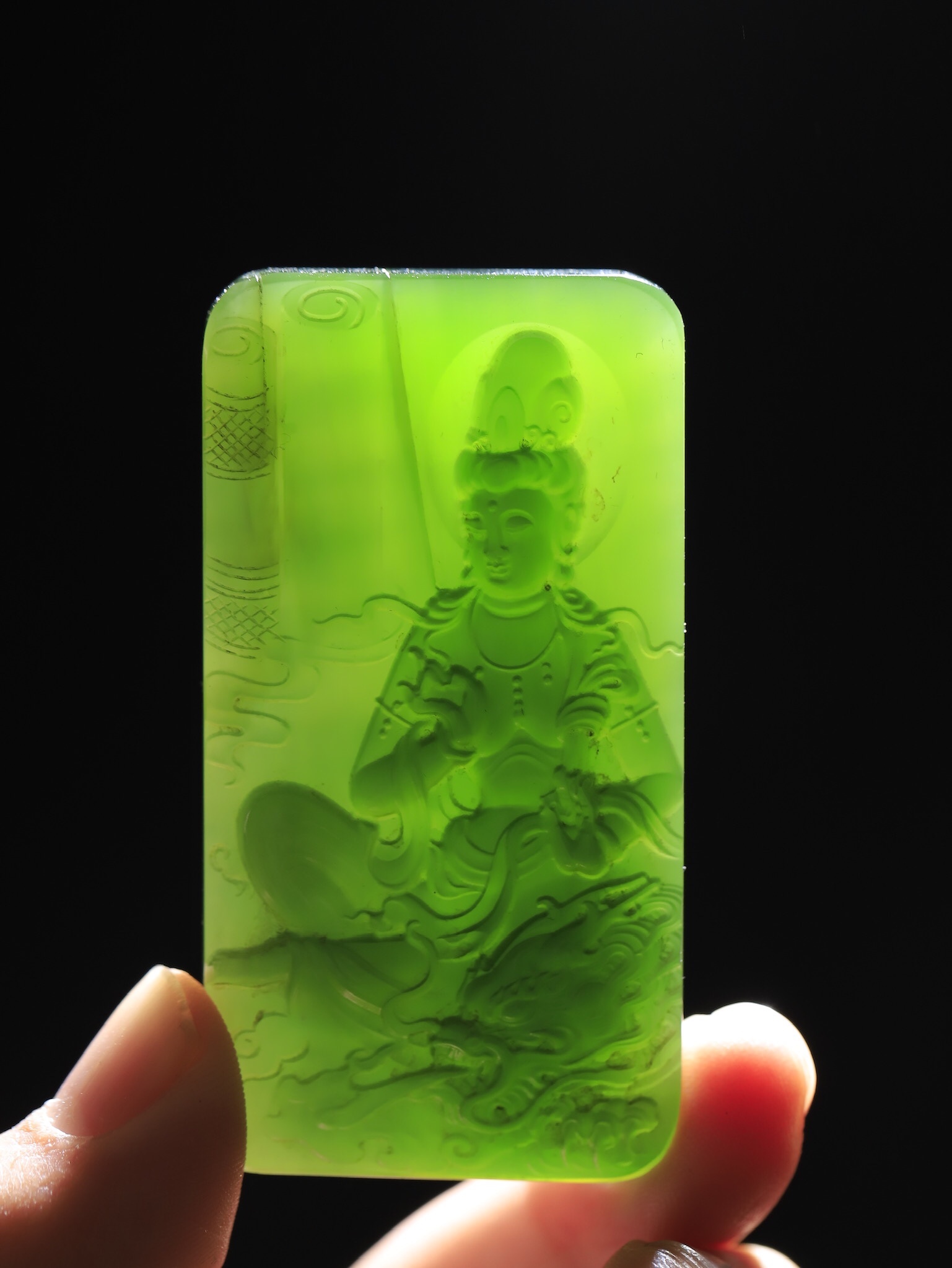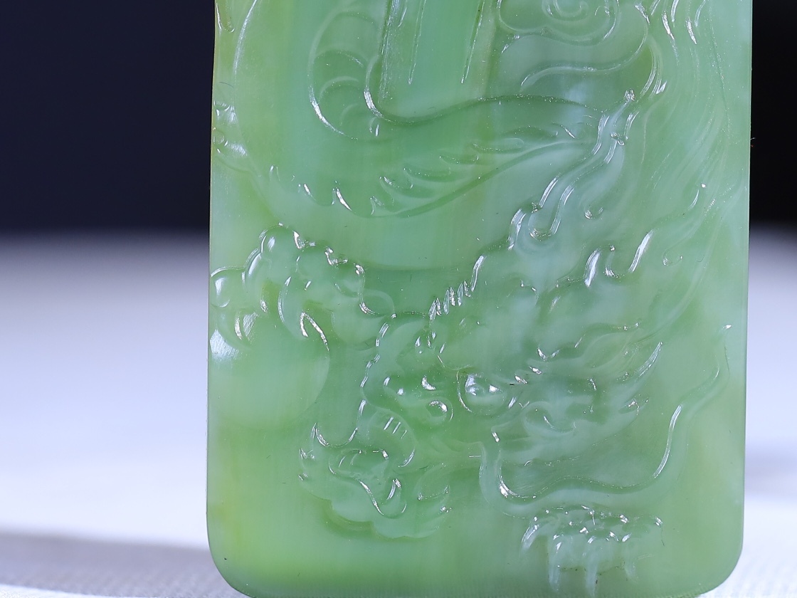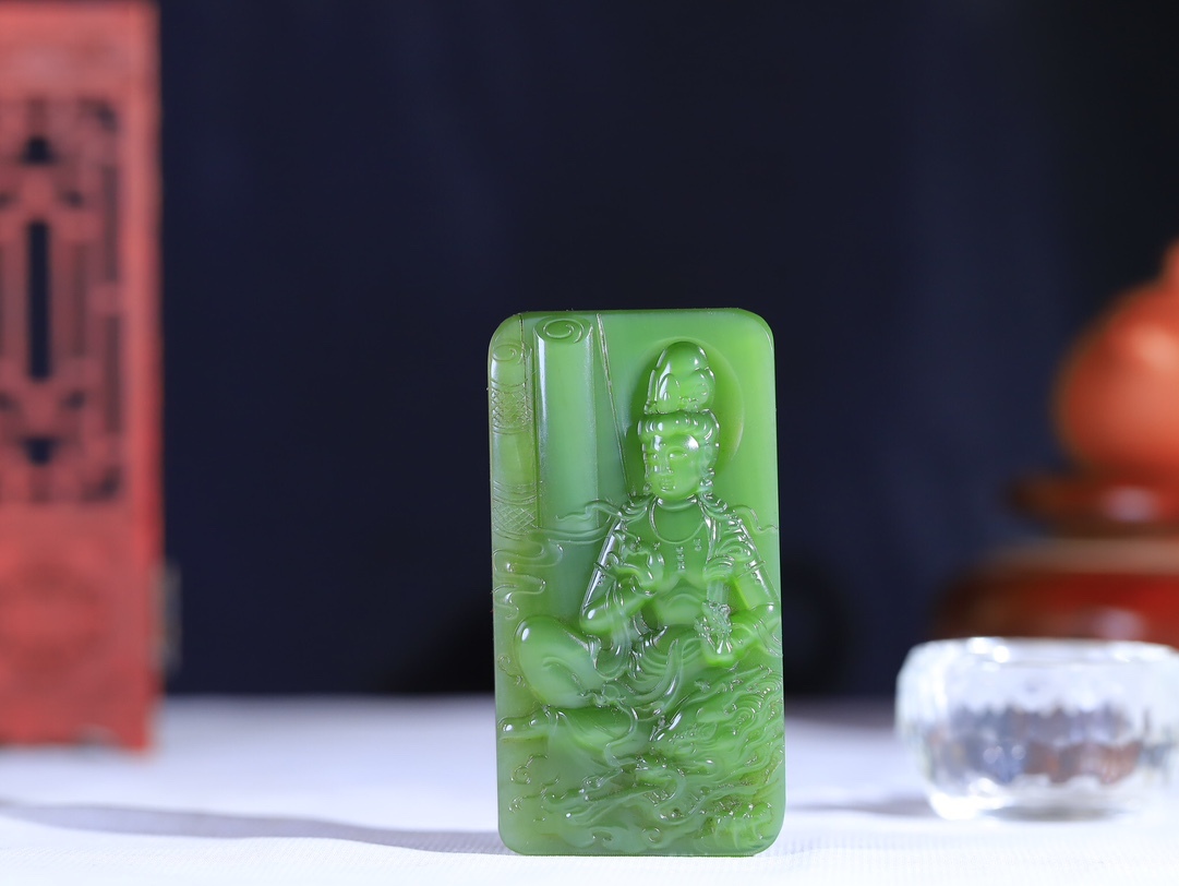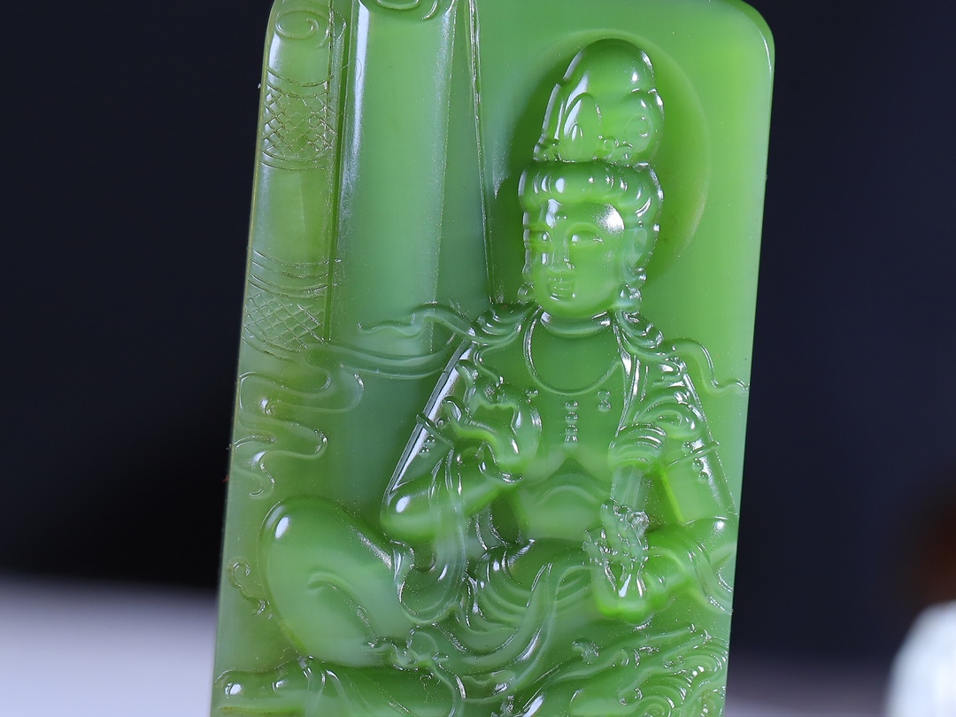 天然和田玉碧玉,玉質溫潤細膩,油性十足,雕刻觀音,端莊大氣,將其大慈大悲,普度眾生之態表現得淋漓盡致,雕琢祥龍,整器畫面簡潔,寓意觀音庇佑,灑福人間,風調雨順,保天下太平。