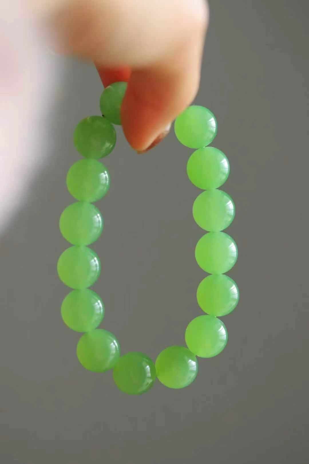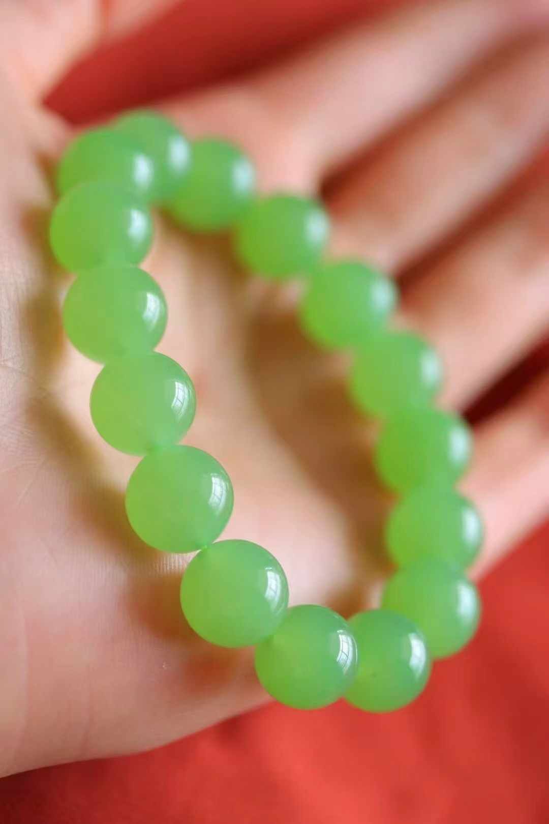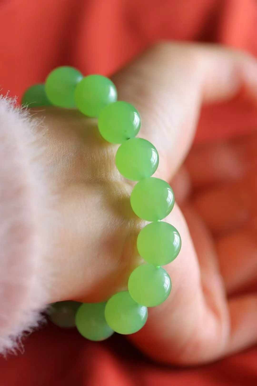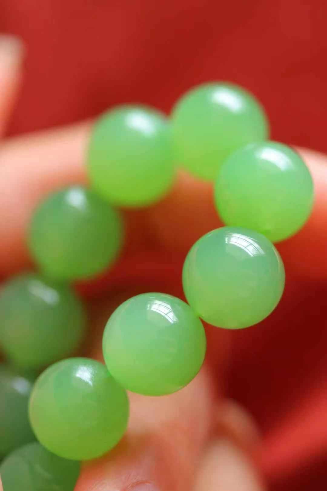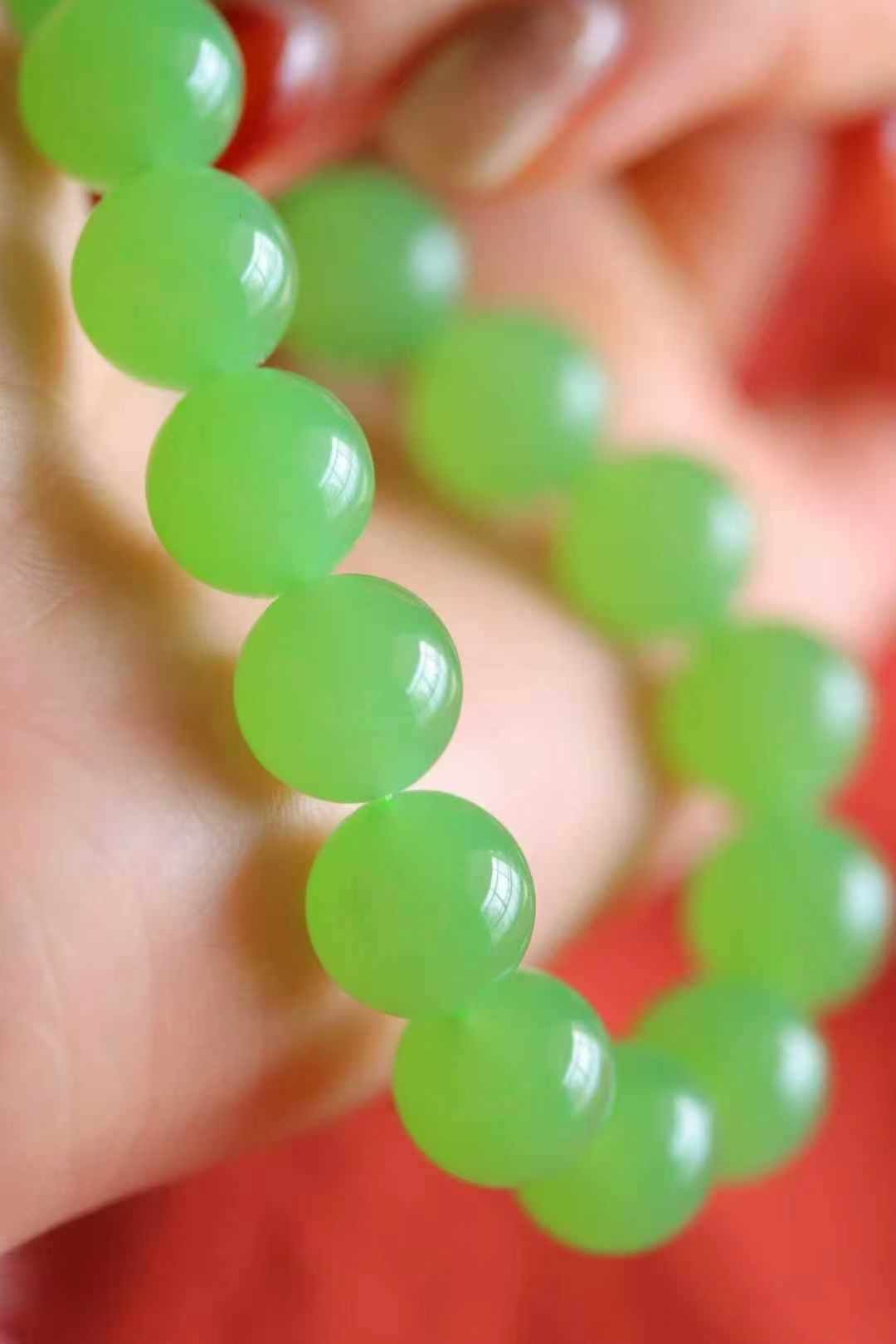 天然和田玉,罕見俄料翠青手串,跟蘋果綠迥異的綠色調,但同樣的翠綠鮮嫩。玉質非常細,冰潤通透,質感十足。