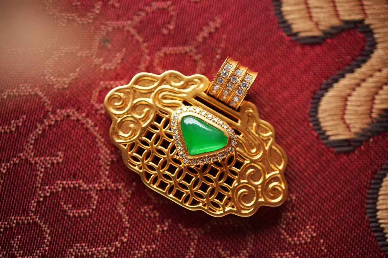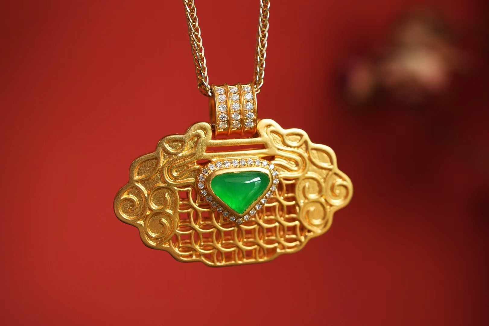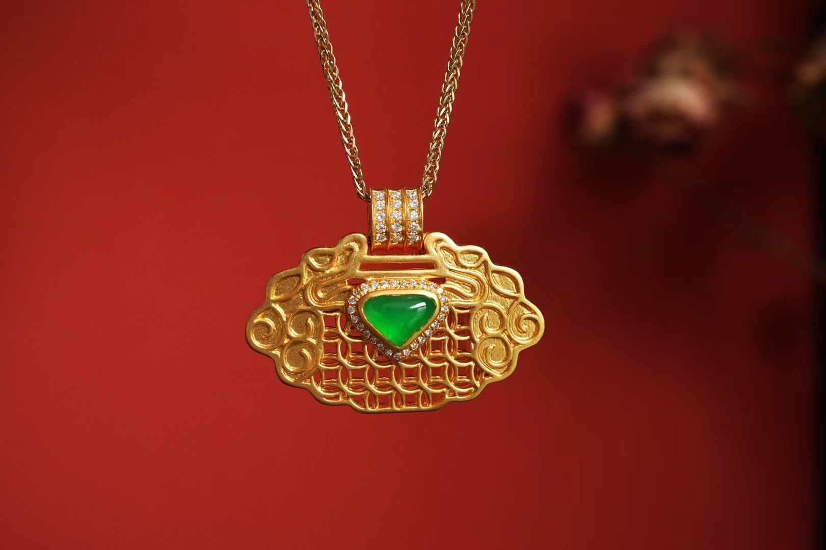 天然翡翠A玉,緬料冰陽綠心形裸石,經時光淬煉,冰潤通透,陽綠濃郁,盡顯翡翠的珍稀與高貴,18K金精工鑽石鑲嵌,平安鎖作為中式傳統吉祥信物,承載著對生活的美好期許“鎖平安,納百福”