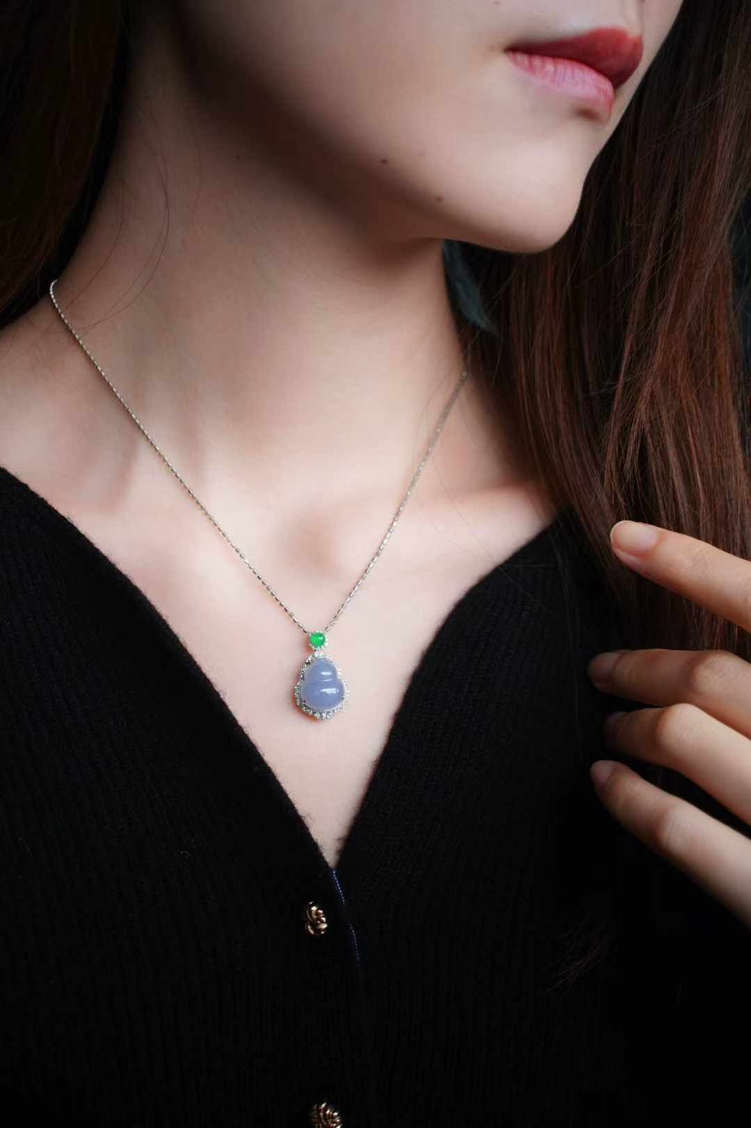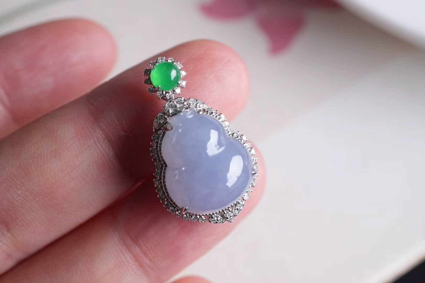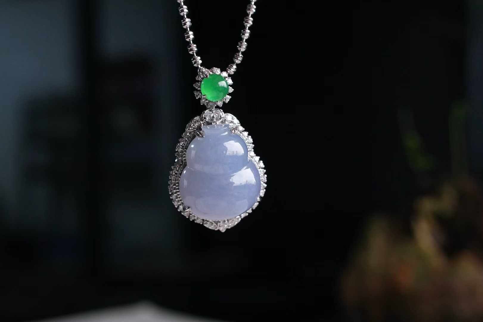 天然翡翠A玉,紫氣東來,是哪位仙女的葫蘆呀!冰紫羅蘭,飽滿圓潤的葫蘆,純天然的色,水汪汪的,太難得了,18K重金鑽石鑲嵌,點綴翡翠綠蛋,精致貴氣,優雅又吉祥。