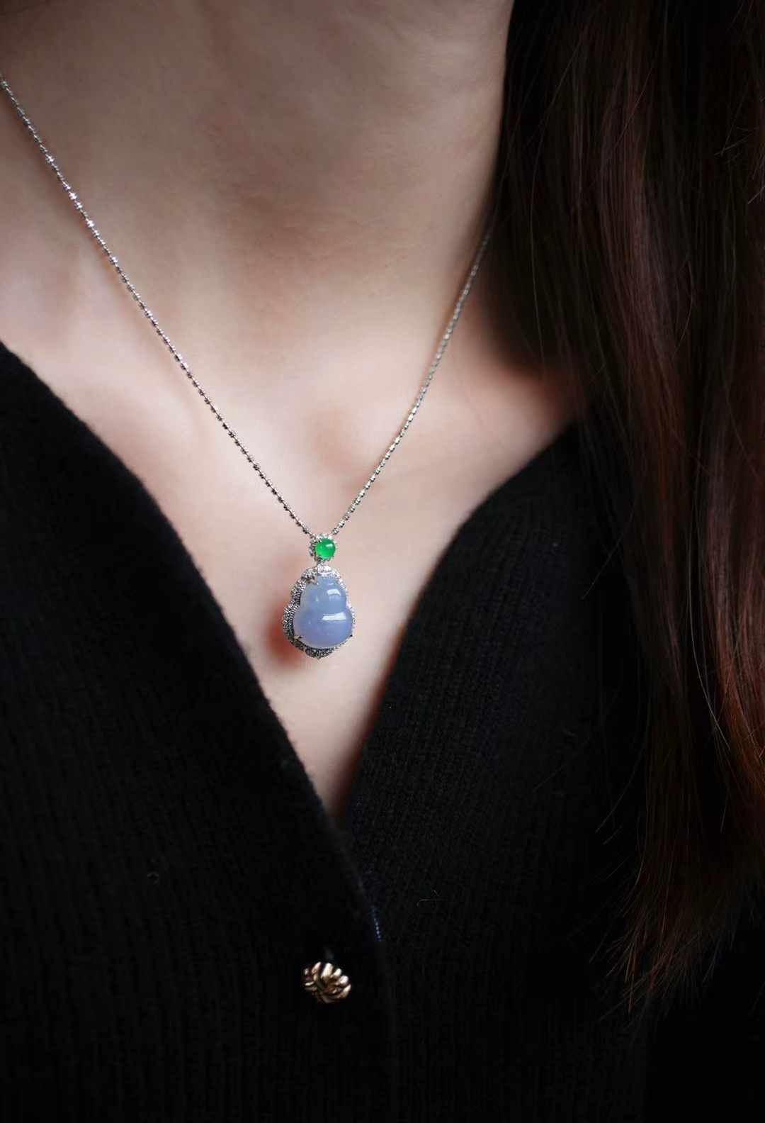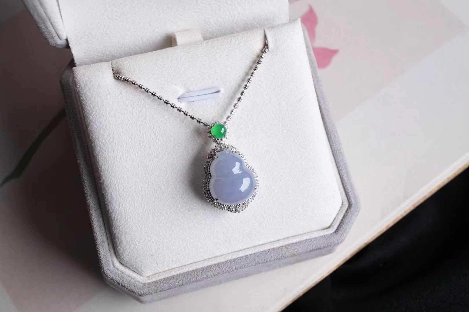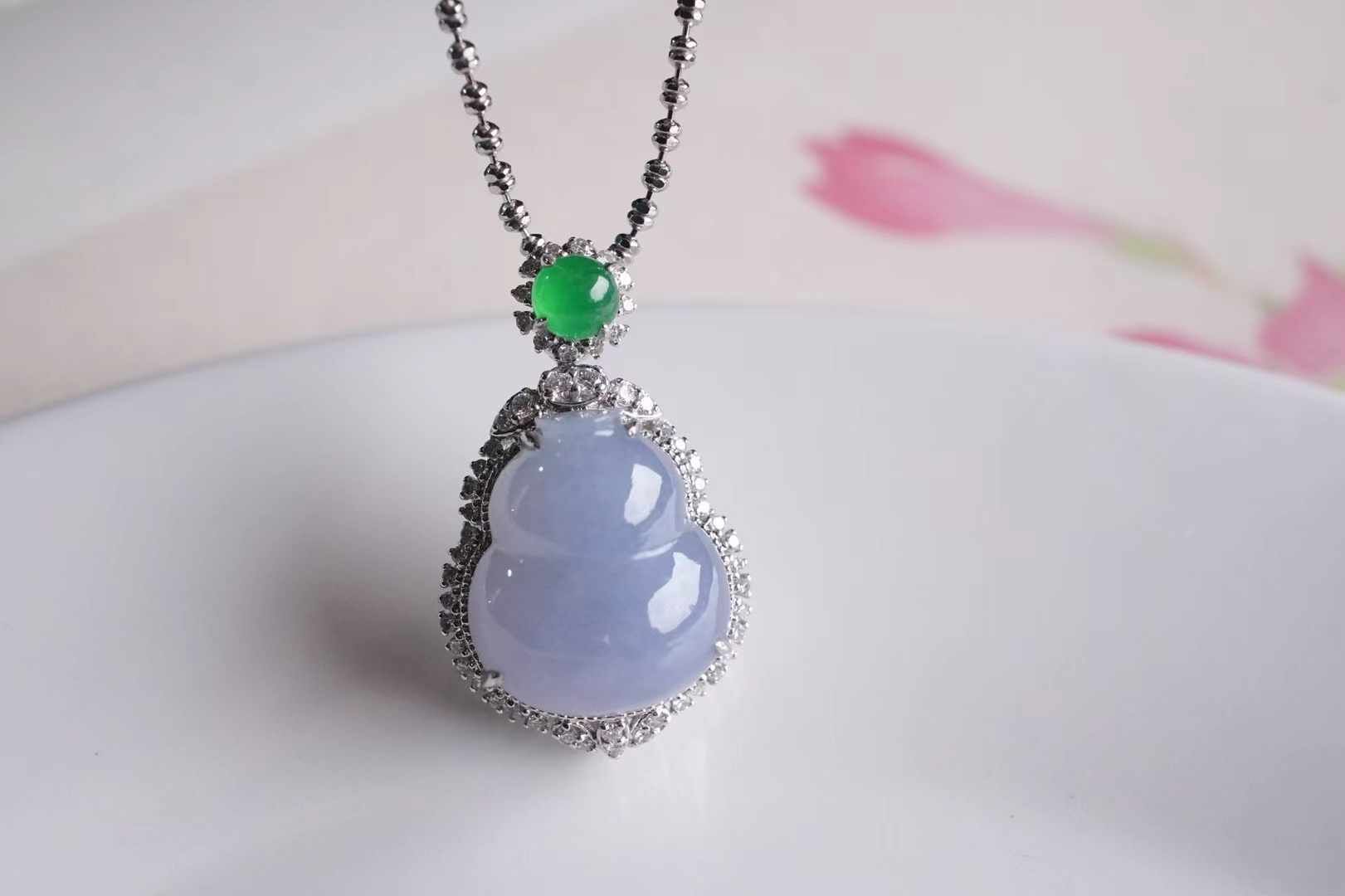 天然翡翠A玉,紫氣東來,是哪位仙女的葫蘆呀!冰紫羅蘭,飽滿圓潤的葫蘆,純天然的色,水汪汪的,太難得了,18K重金鑽石鑲嵌,點綴翡翠綠蛋,精致貴氣,優雅又吉祥。