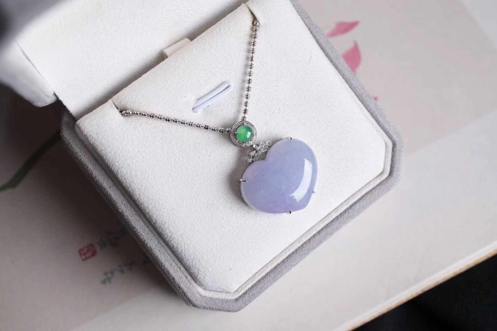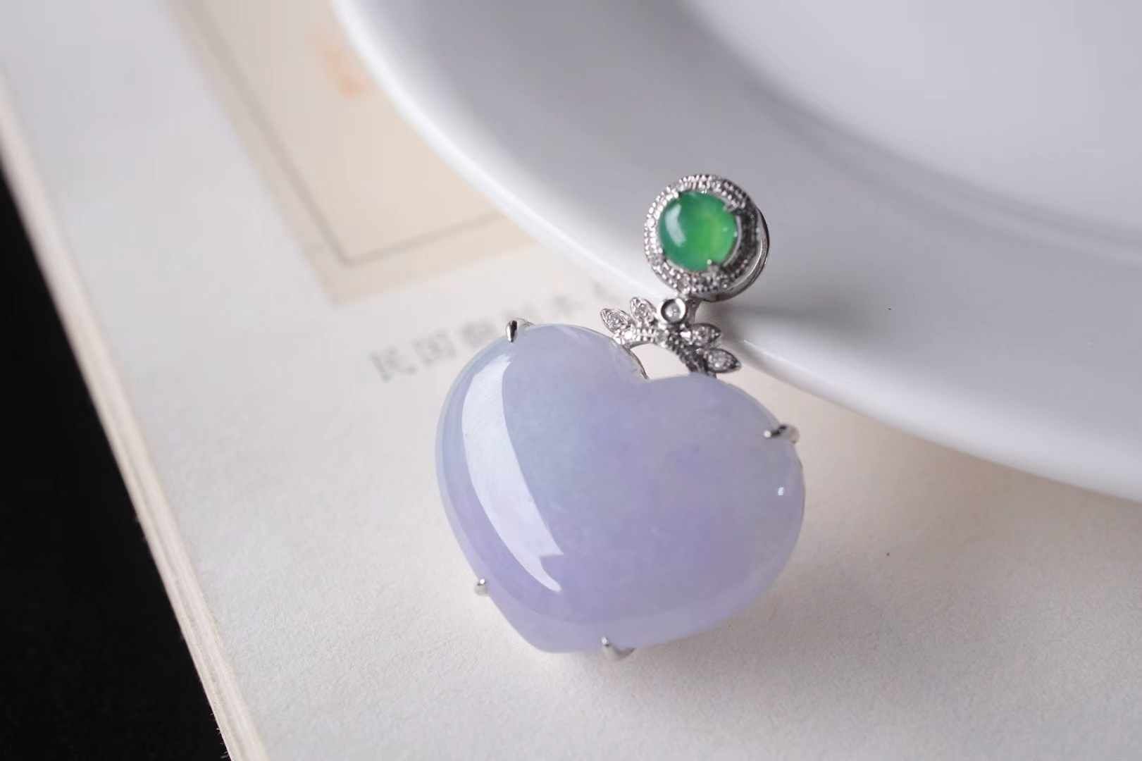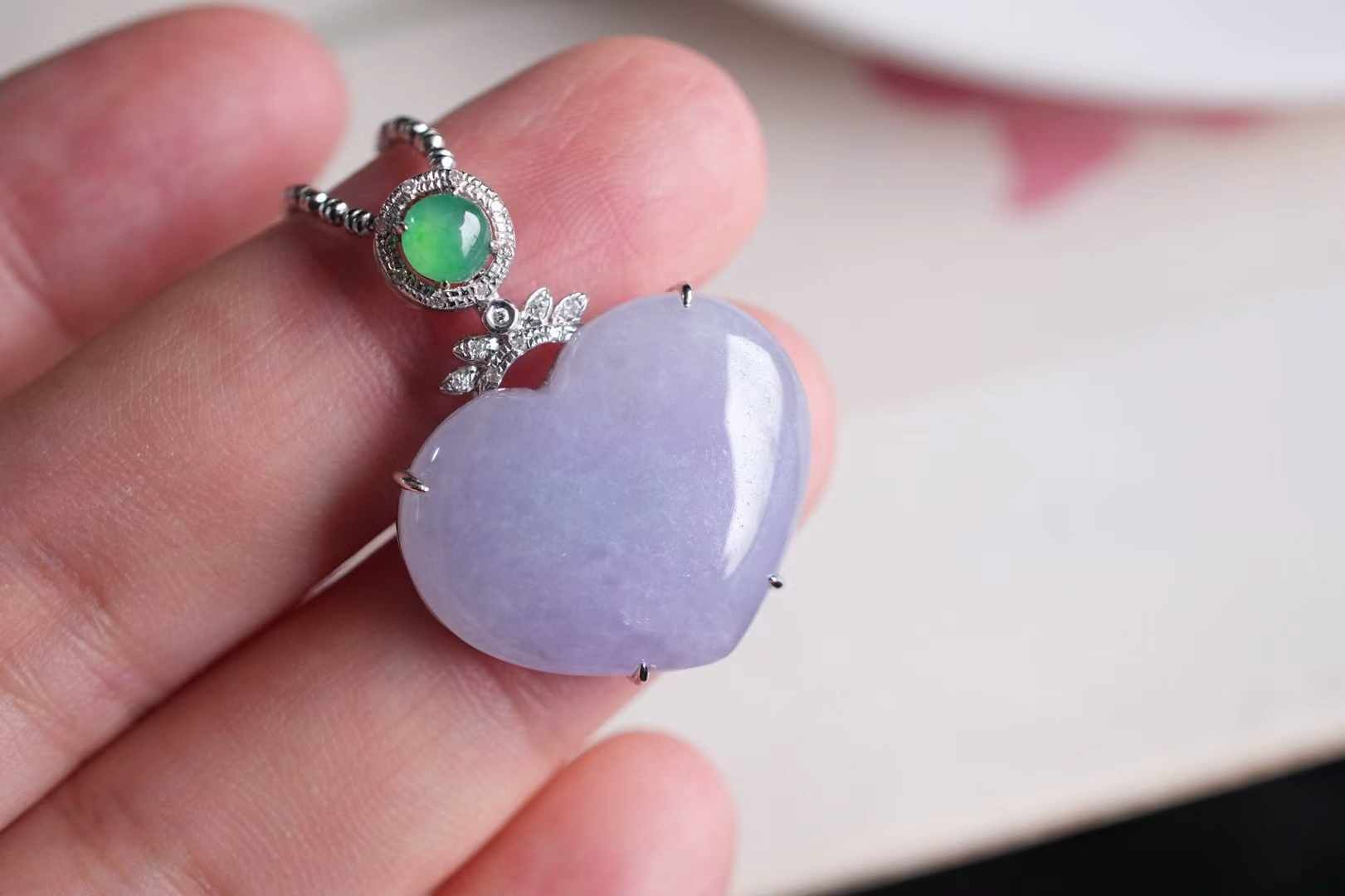 天然翡翠A玉,緬料紫羅蘭愛心,飽滿厚實,色澤濃郁,粉紫色調極為純粹,整體溫柔、仙美、貴氣,太美了,18K金精工打造,點綴鑽石,高冰綠翡翠,靈動甜美的珠寶感。