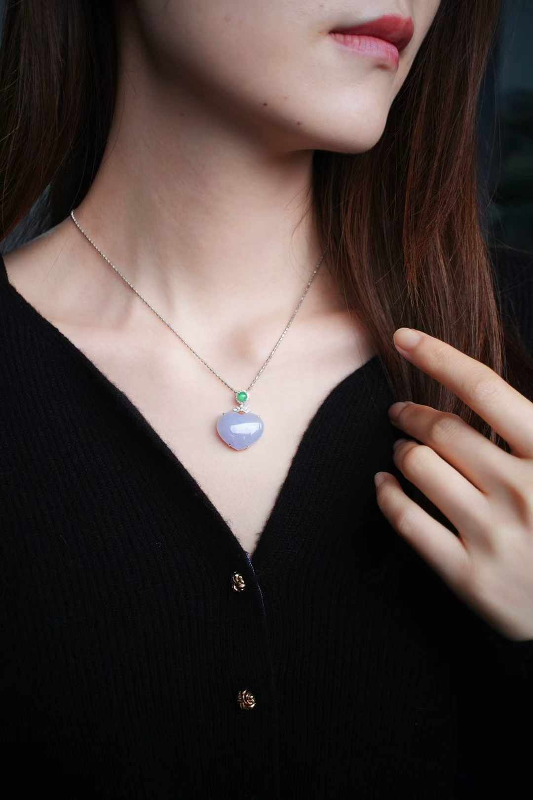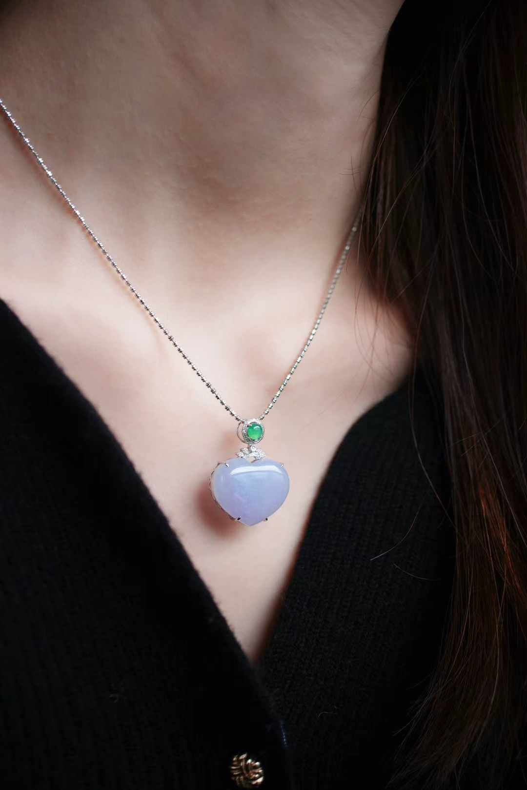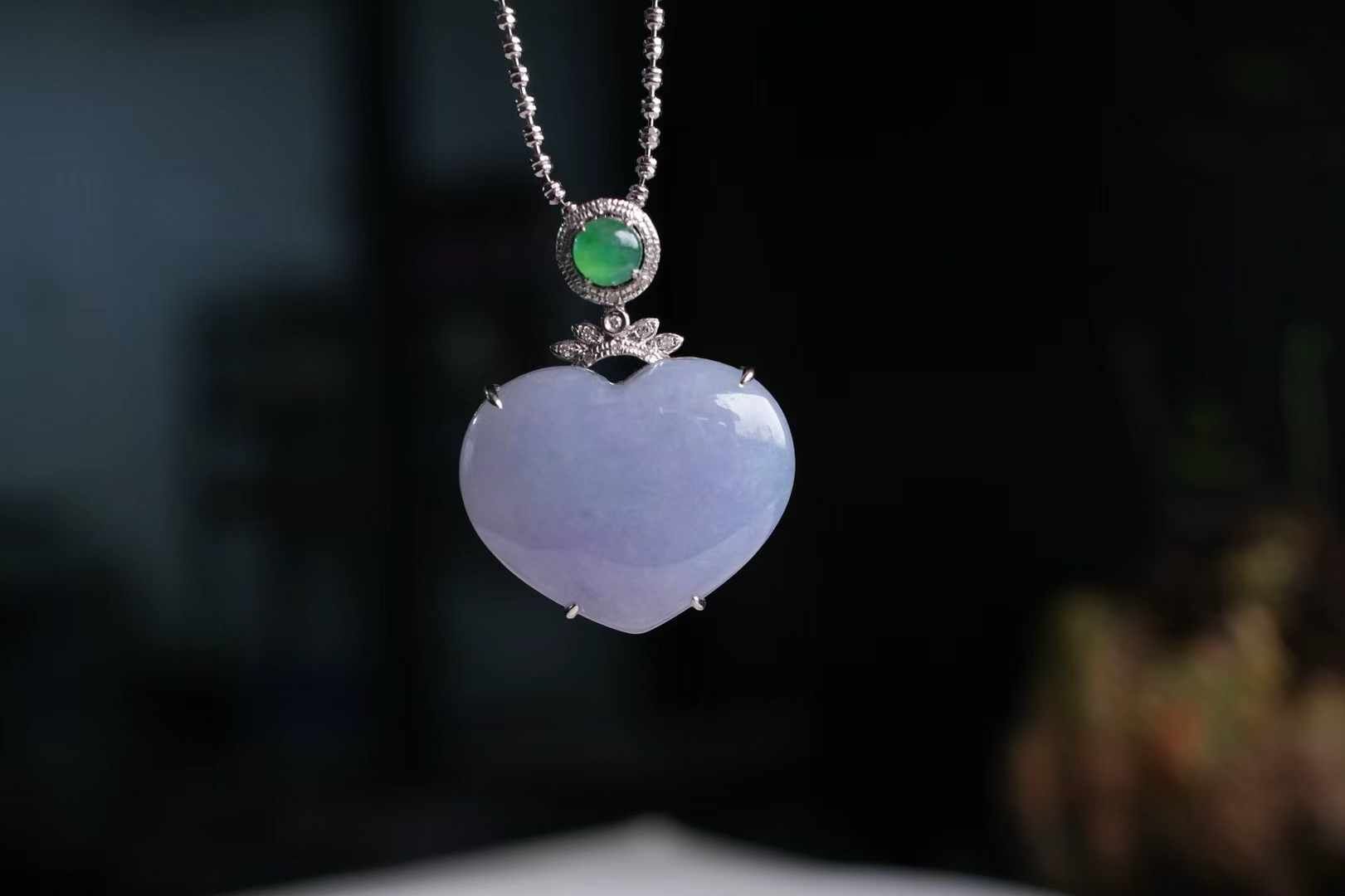 天然翡翠A玉,緬料紫羅蘭愛心,飽滿厚實,色澤濃郁,粉紫色調極為純粹,整體溫柔、仙美、貴氣,太美了,18K金精工打造,點綴鑽石,高冰綠翡翠,靈動甜美的珠寶感。