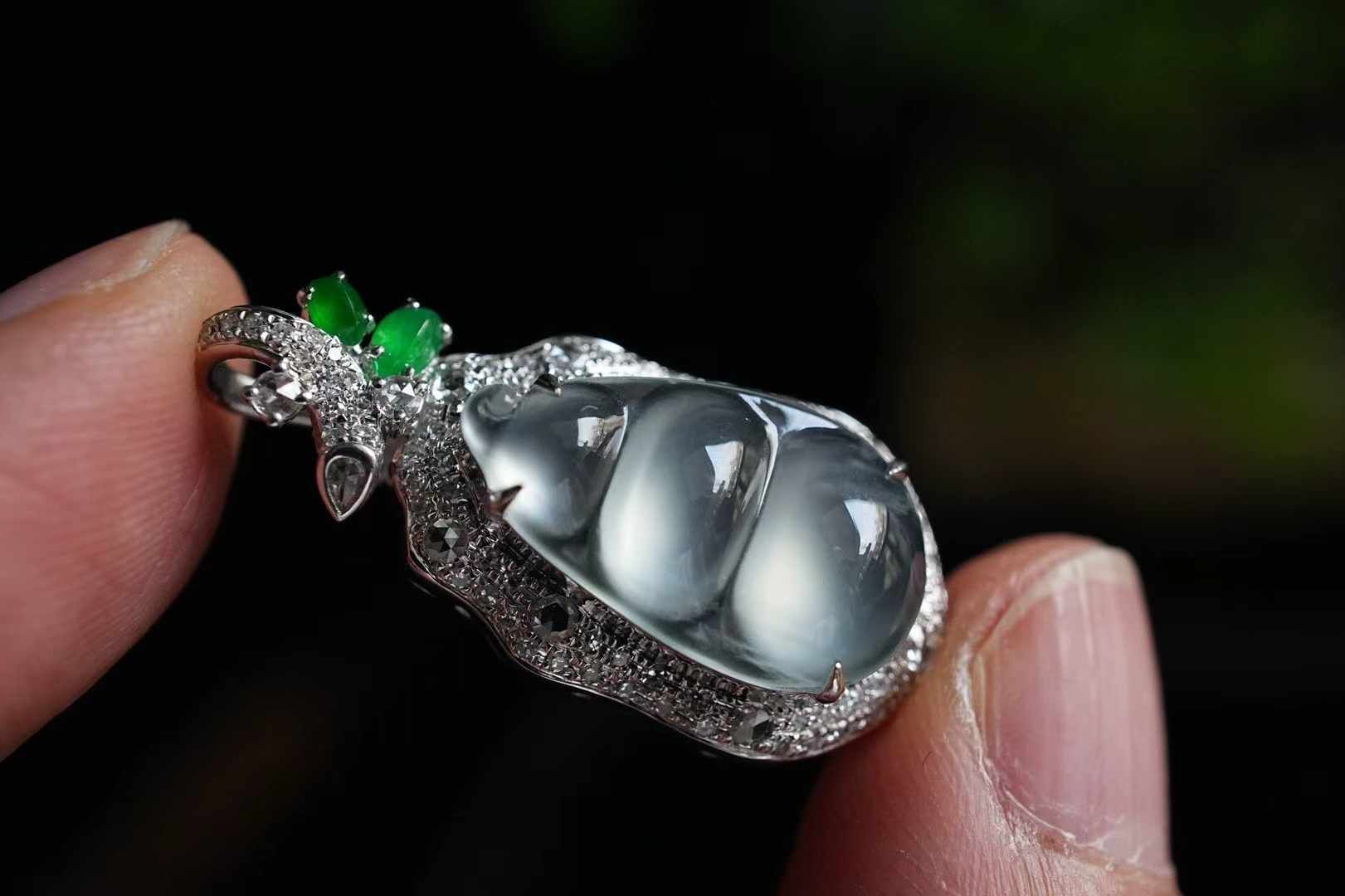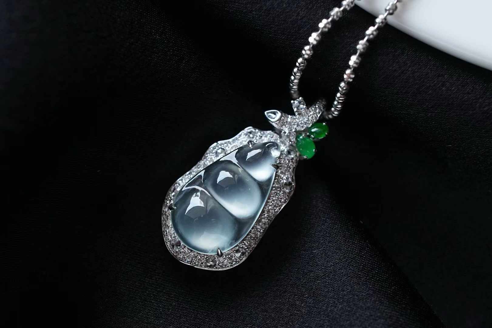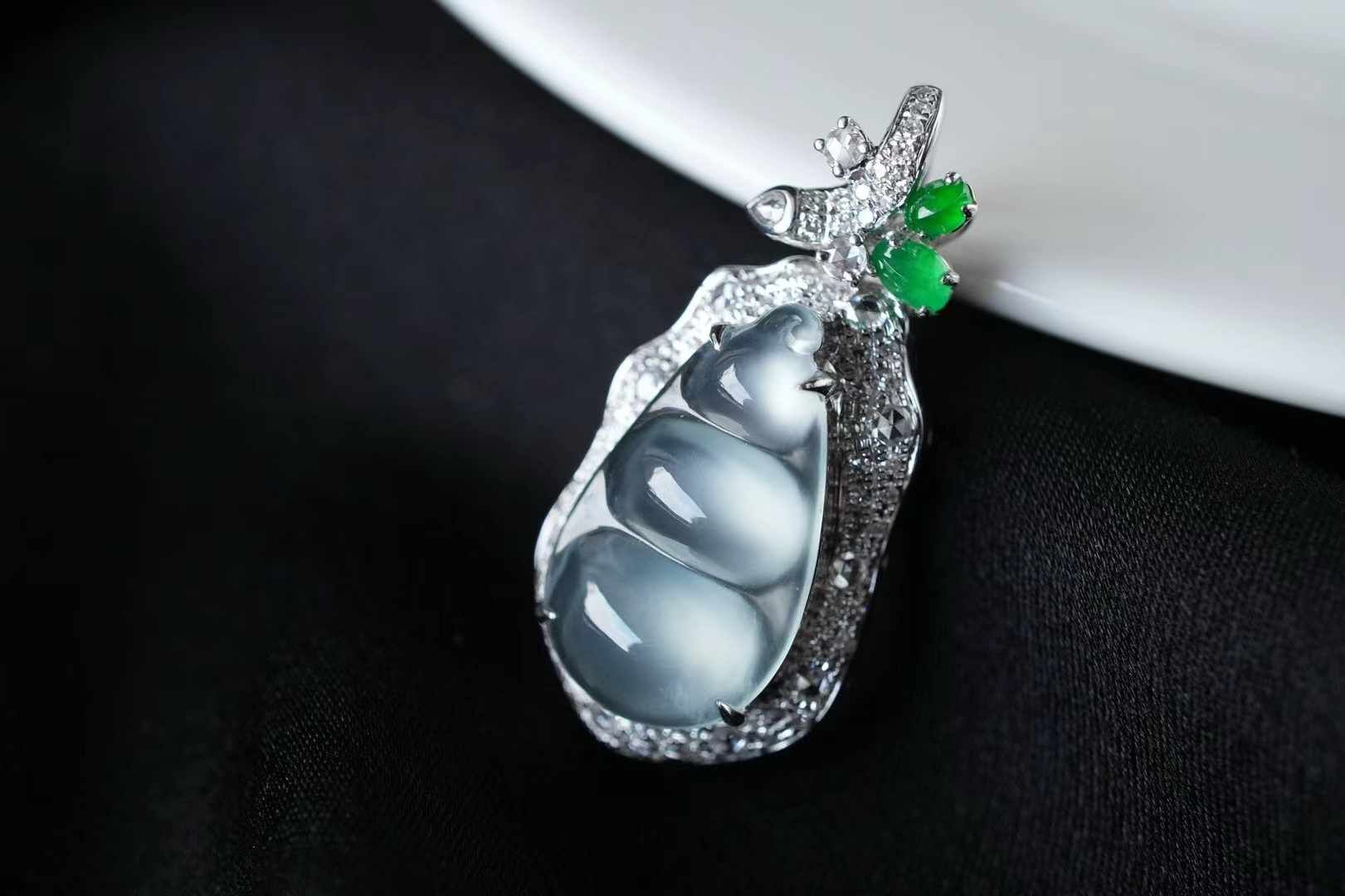 天然翡翠A玉,緬料玻璃種,一枚直接畢業的福豆,晶瑩剔透的感覺,寒光凜冽,起鋼性,種水好到極致,18K金鑽豪鑲,充滿自然感的設計款,寓意福祿壽,連中三元,佩戴奢華貴氣。