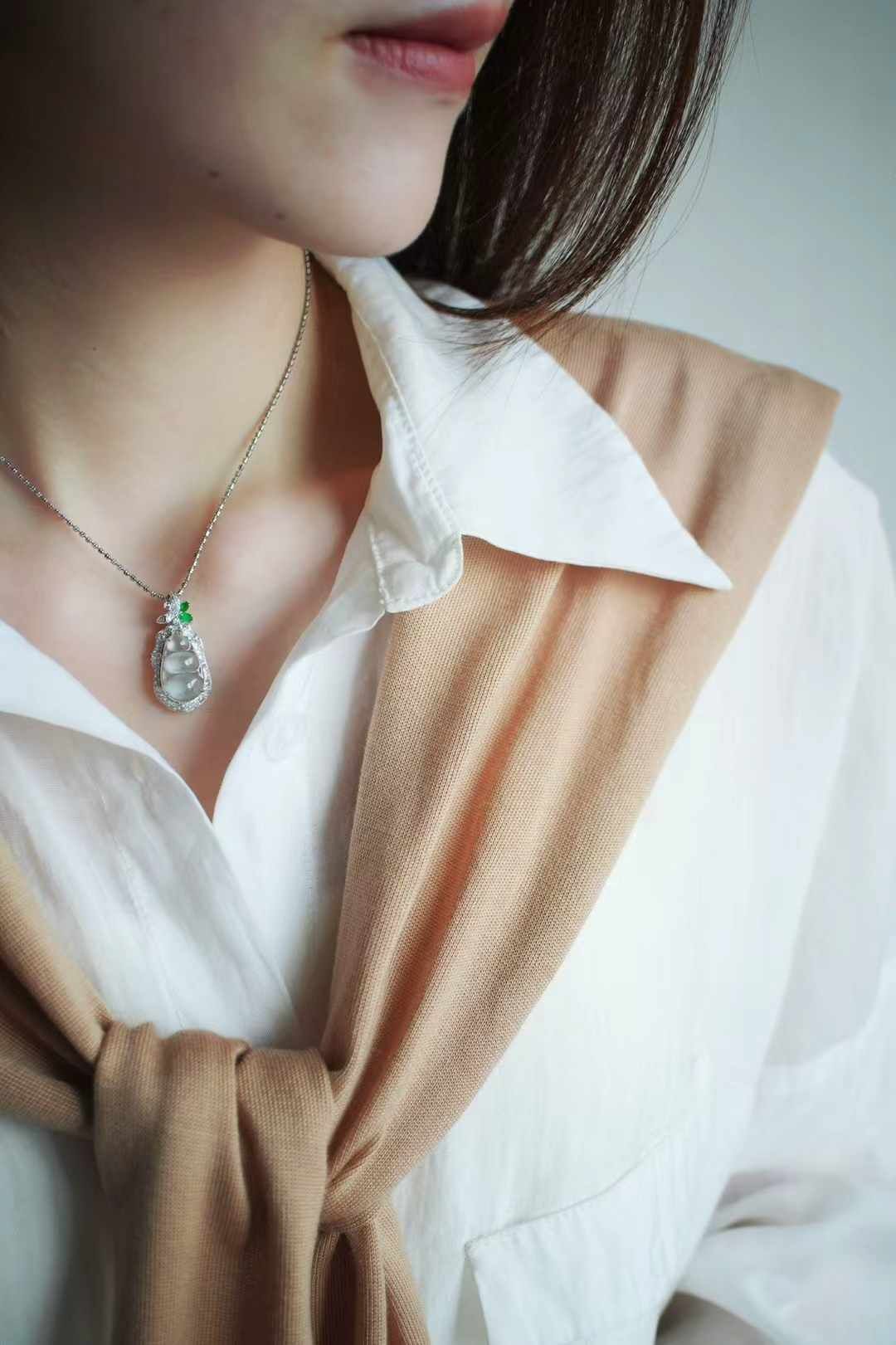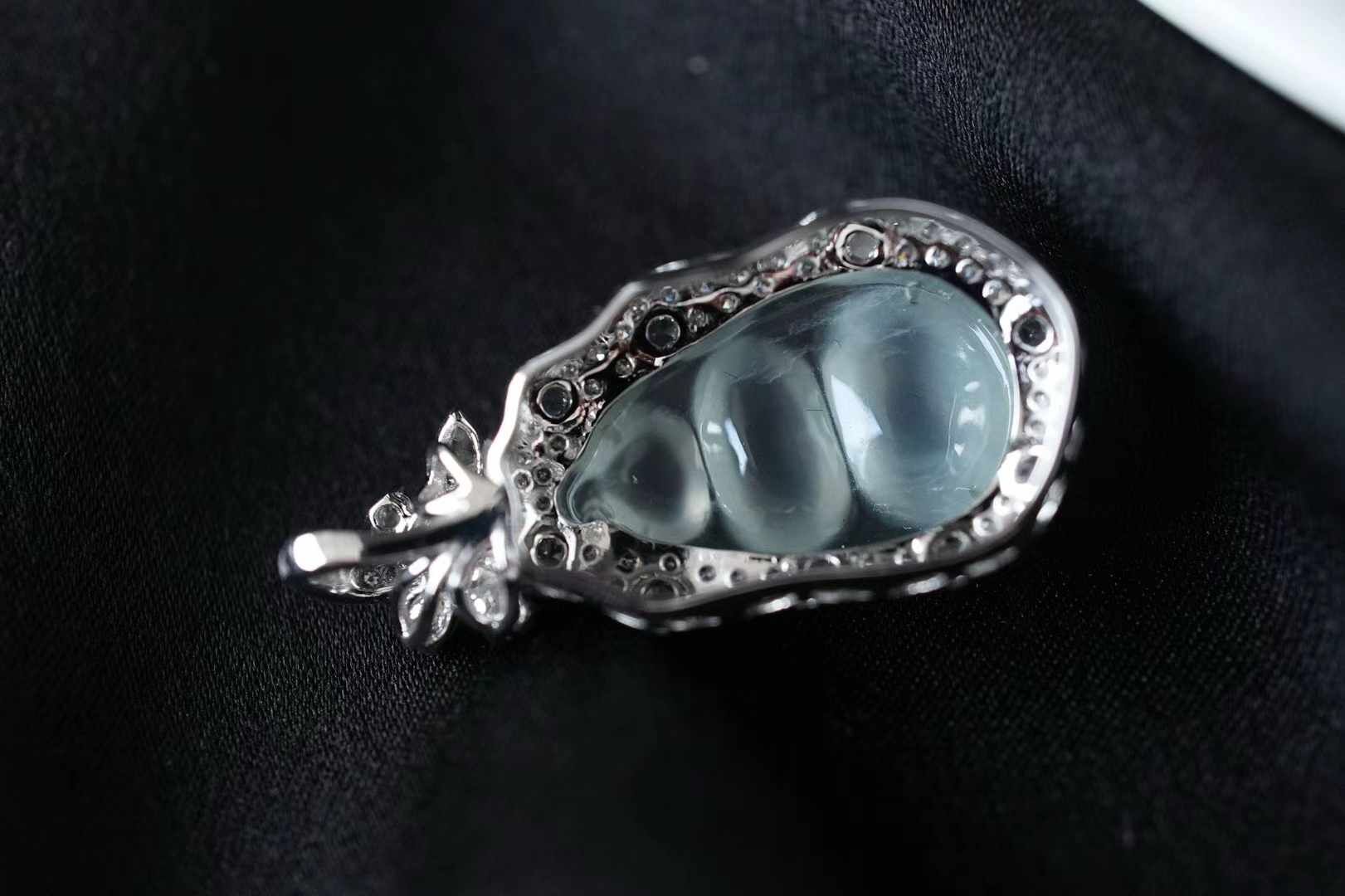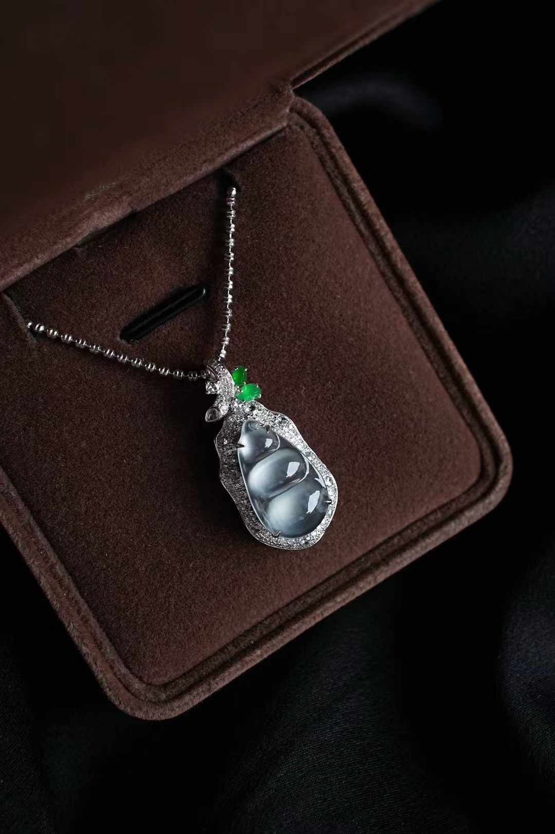 天然翡翠A玉,緬料玻璃種,一枚直接畢業的福豆,晶瑩剔透的感覺,寒光凜冽,起鋼性,種水好到極致,18K金鑽豪鑲,充滿自然感的設計款,寓意福祿壽,連中三元,佩戴奢華貴氣。
