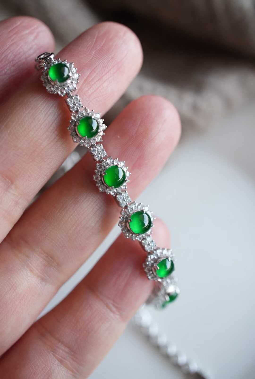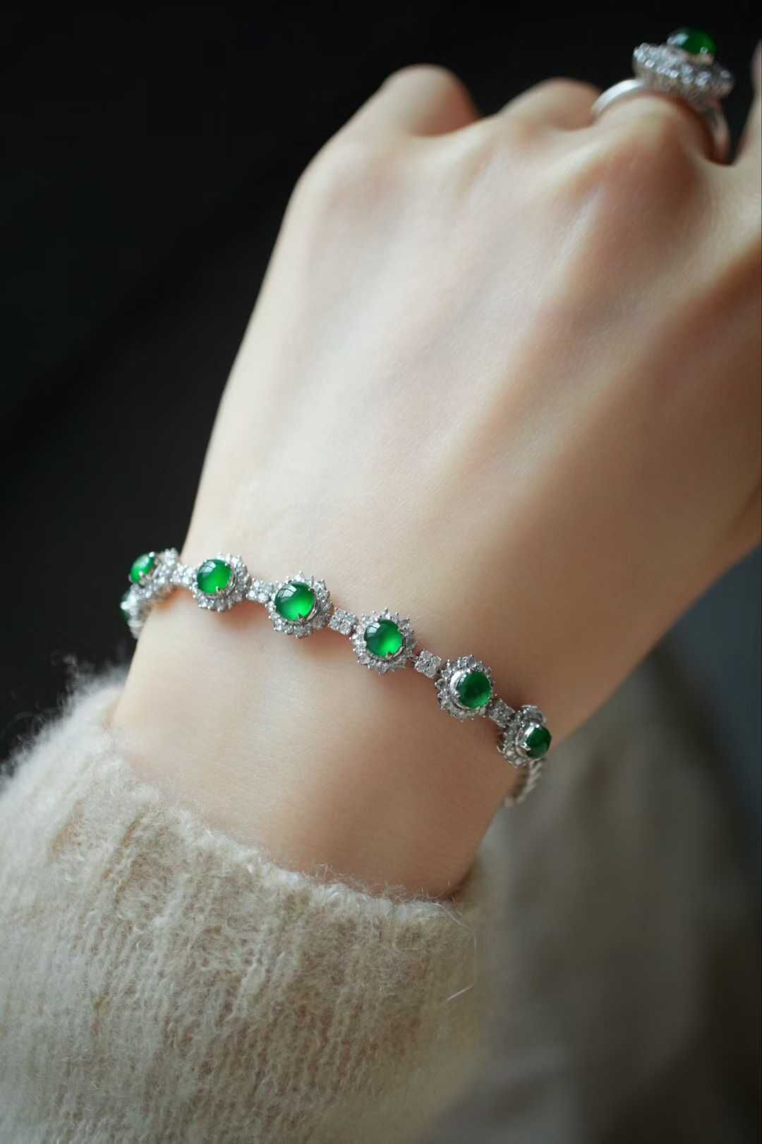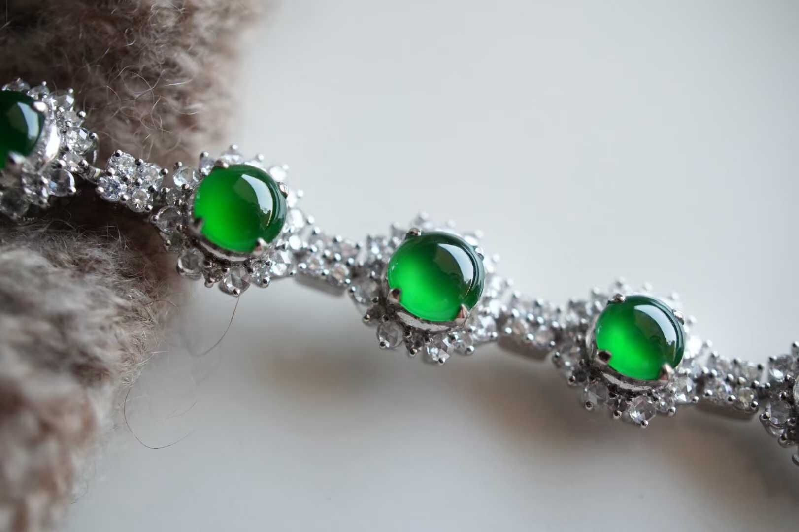 天然翡翠A玉,五顆蛋面色澤濃郁,冰透起光,流光溢彩的感覺,太美好了,種色兼備的精品,超級難得的品相,18K金滿鑽高級質感,上身貴氣優雅。(推薦套裝佩戴)