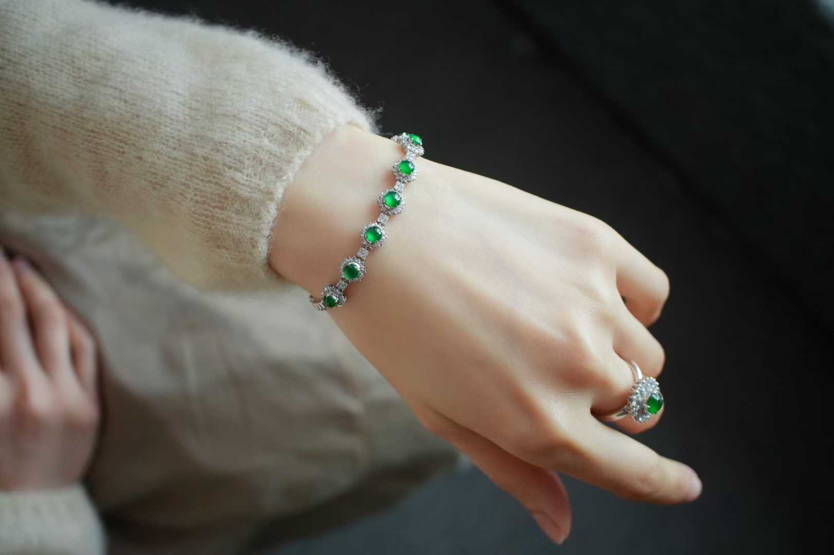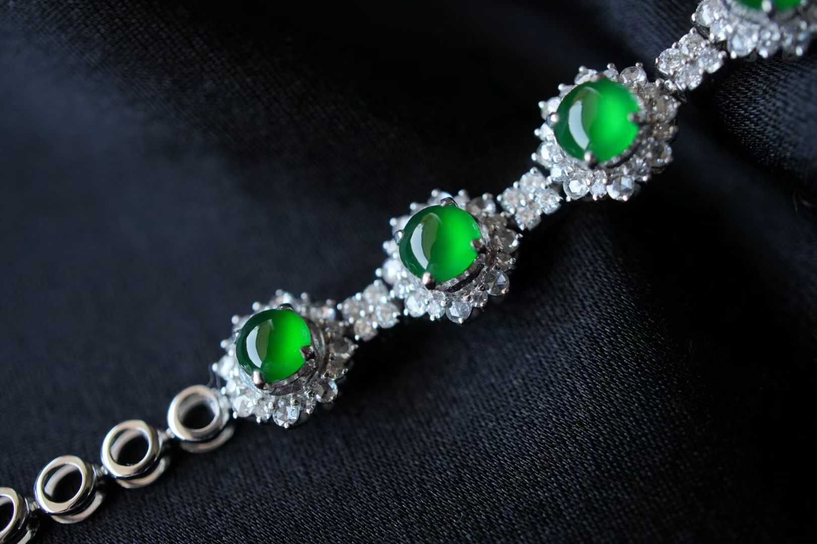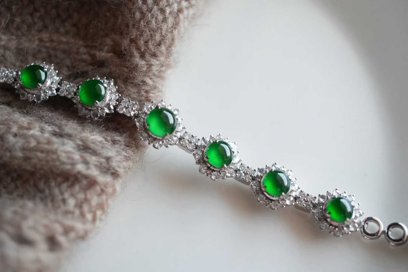 天然翡翠A玉,五顆蛋面色澤濃郁,冰透起光,流光溢彩的感覺,太美好了,種色兼備的精品,超級難得的品相,18K金滿鑽高級質感,上身貴氣優雅。(推薦套裝佩戴)