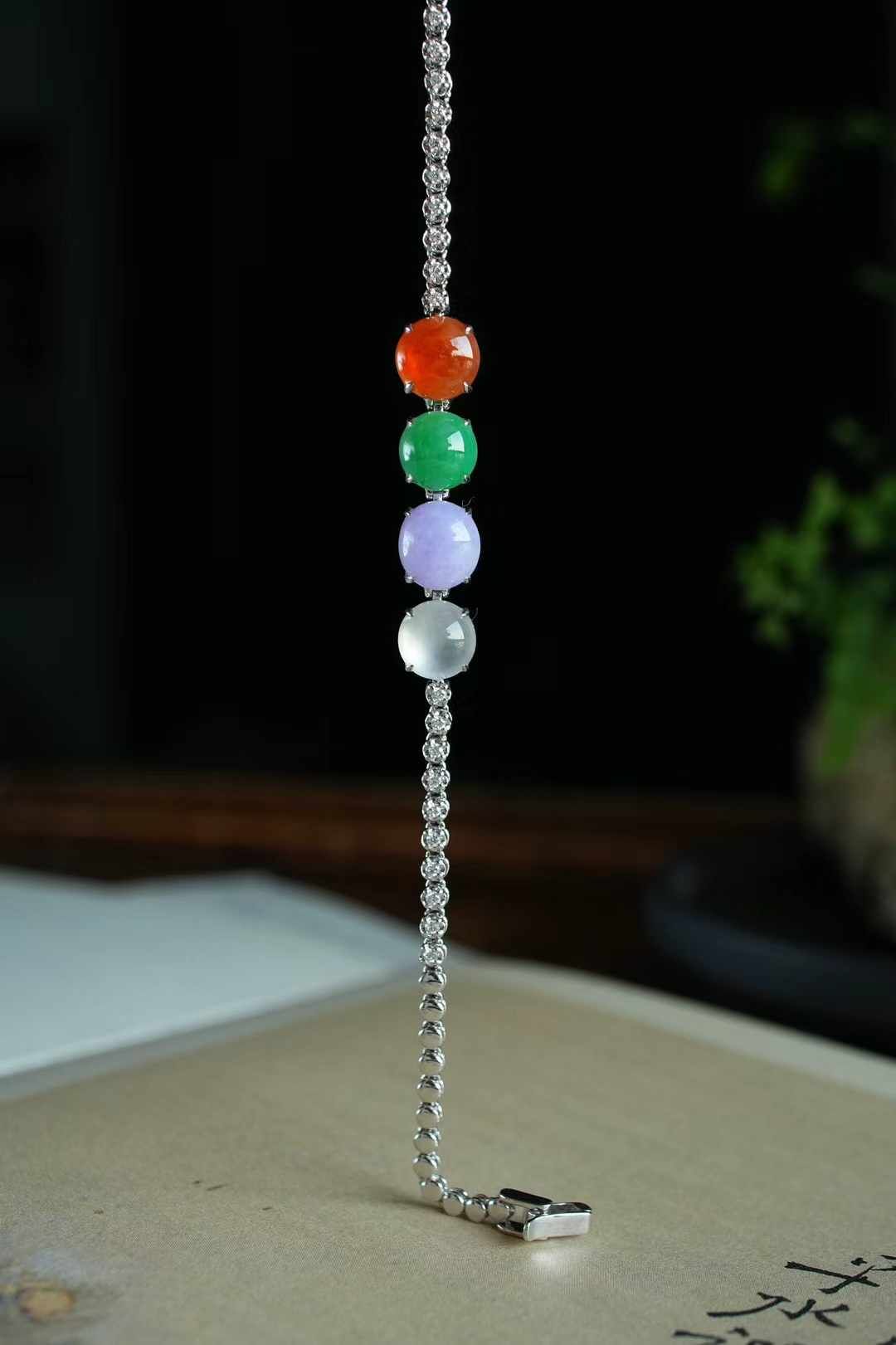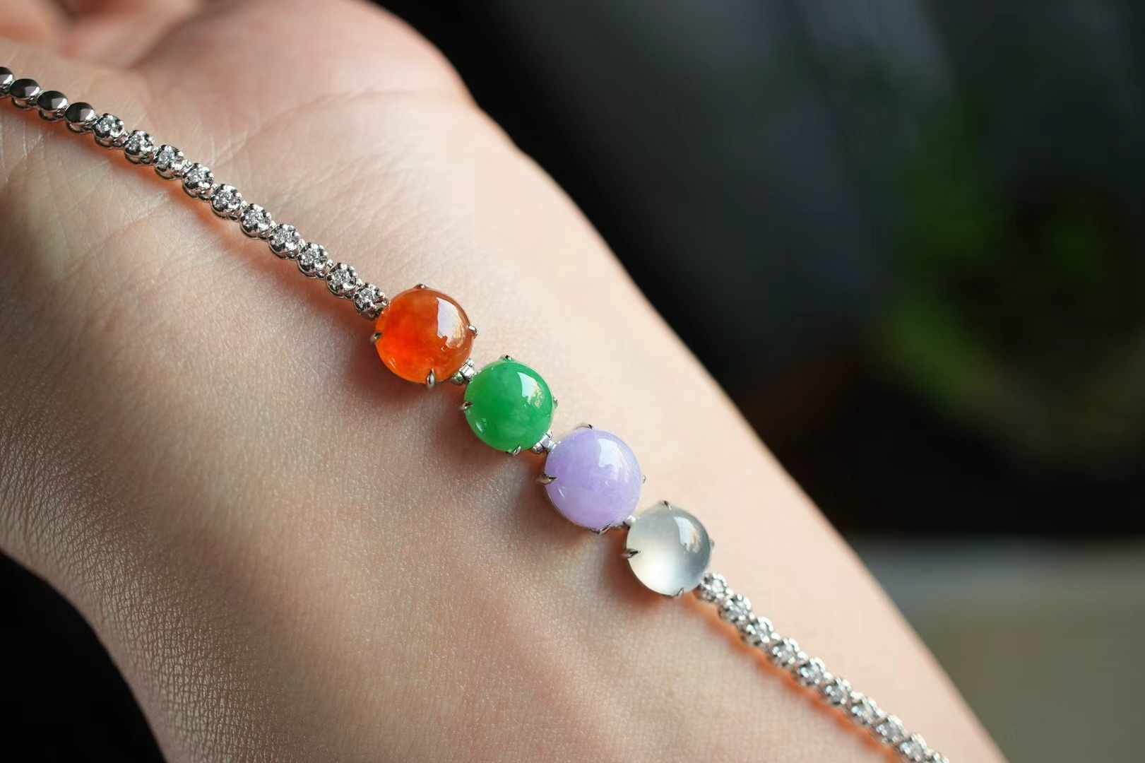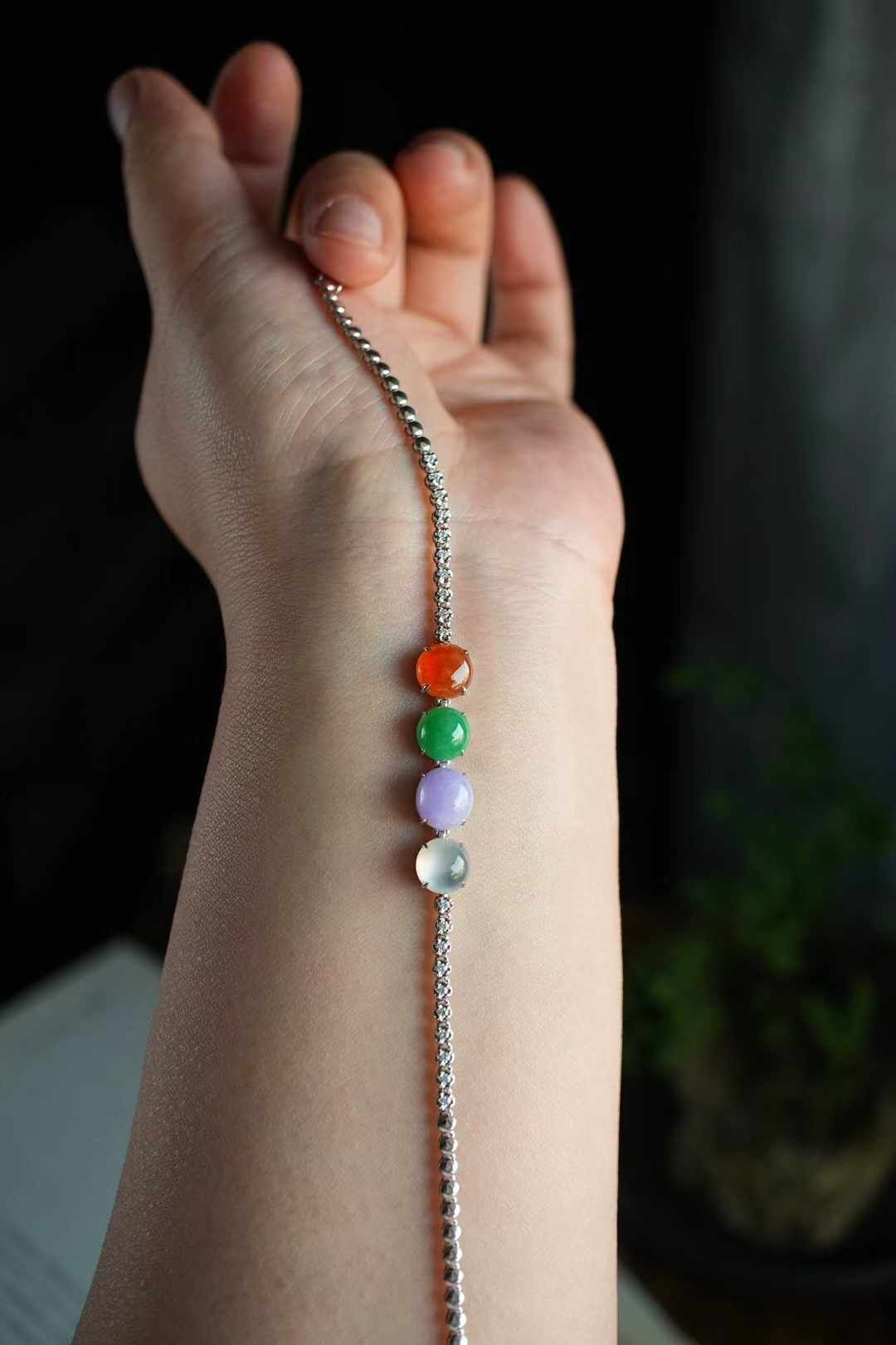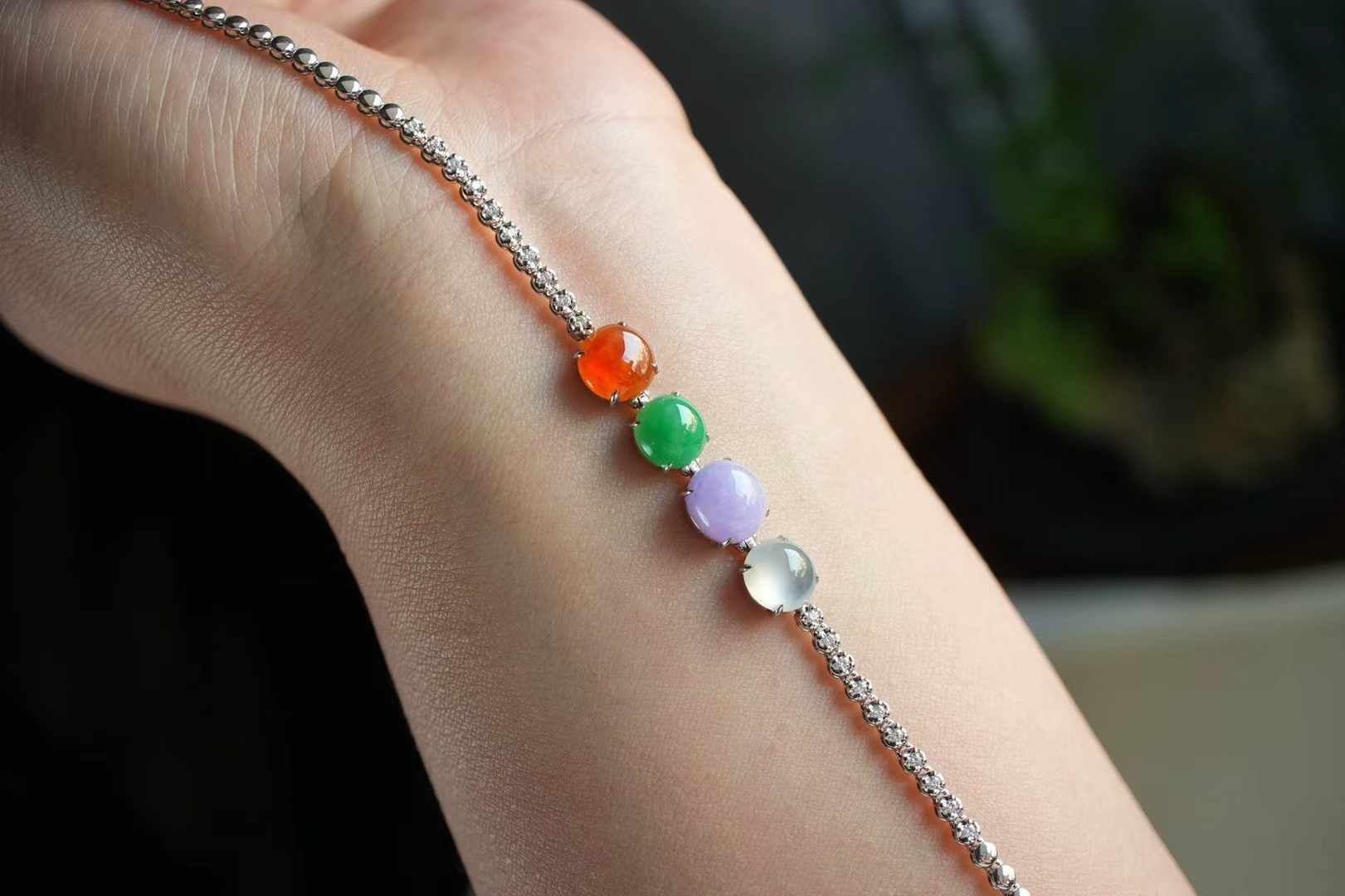 天然翡翠A玉,緬料,集齊冰種白、紫羅蘭、陽綠、紅翡的緬料四色翡翠蛋面手鏈,堪稱翡翠里的“彩寶盛宴”,每一顆蛋面都甄選緬料雕琢,冰種白翡瑩潤如月光,紫羅蘭溫婉似煙霞,陽綠鮮妍若春芽,紅翡明艷勝丹霞,四色銜接自然,把翡翠的色彩美學揉進腕間