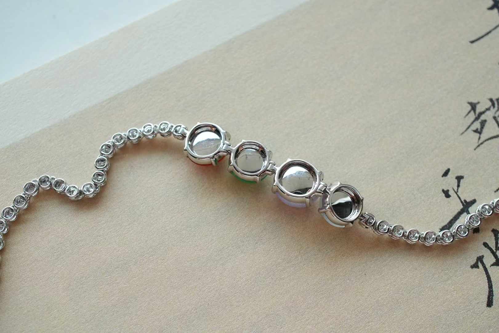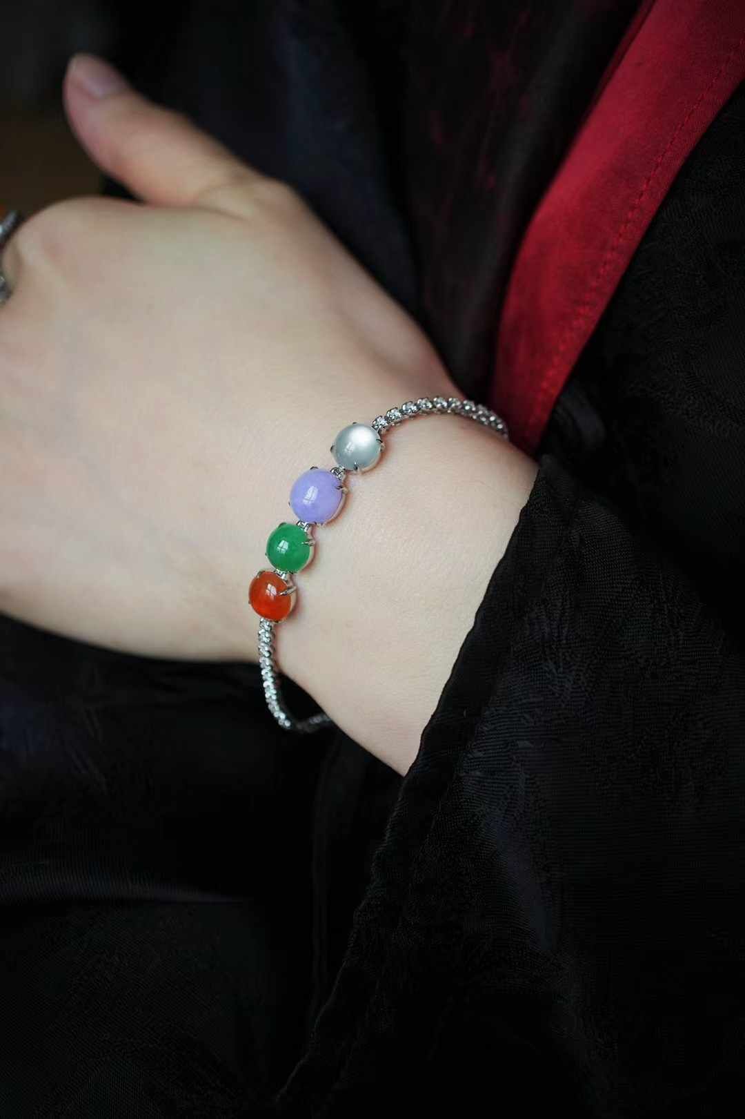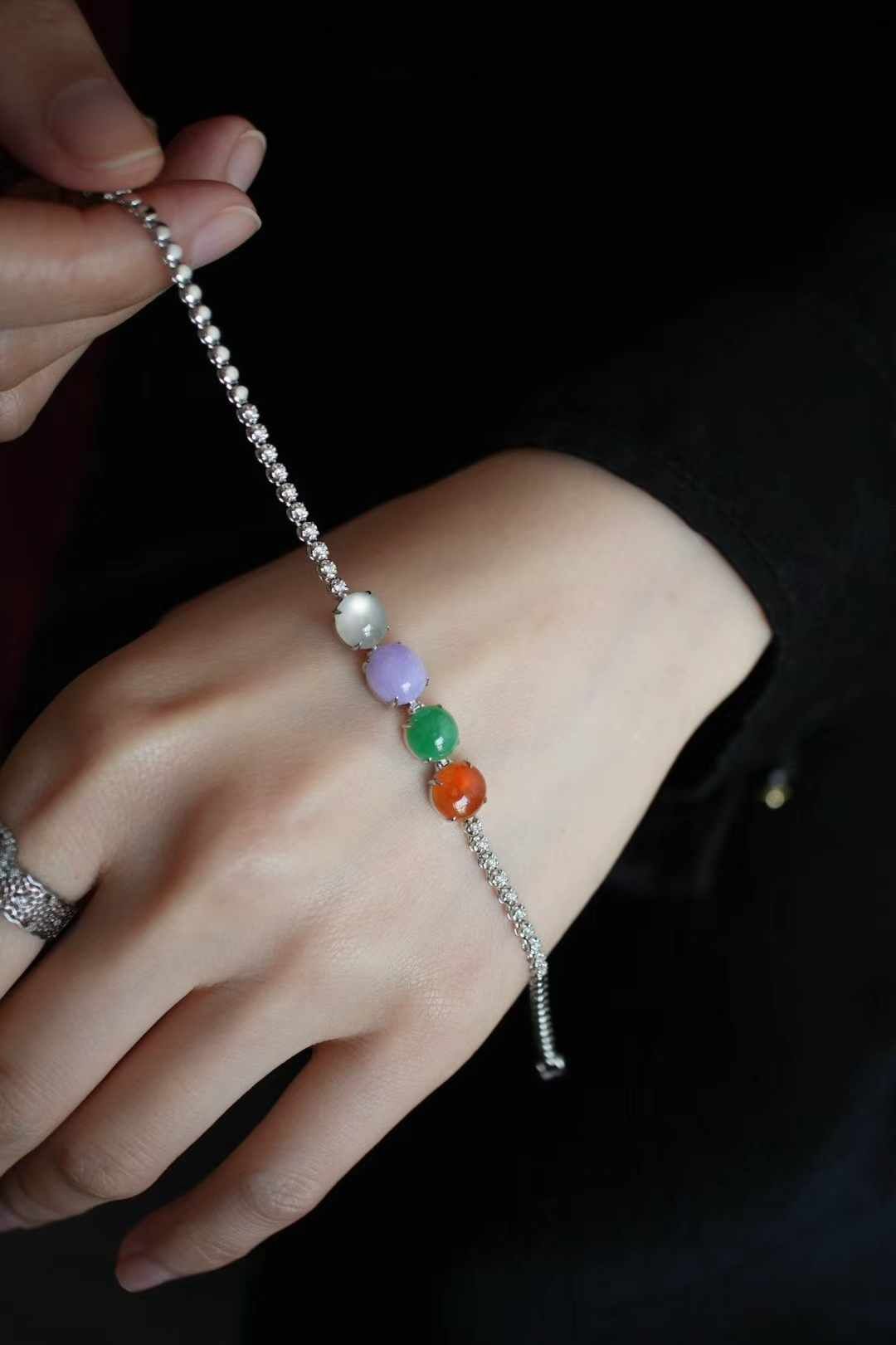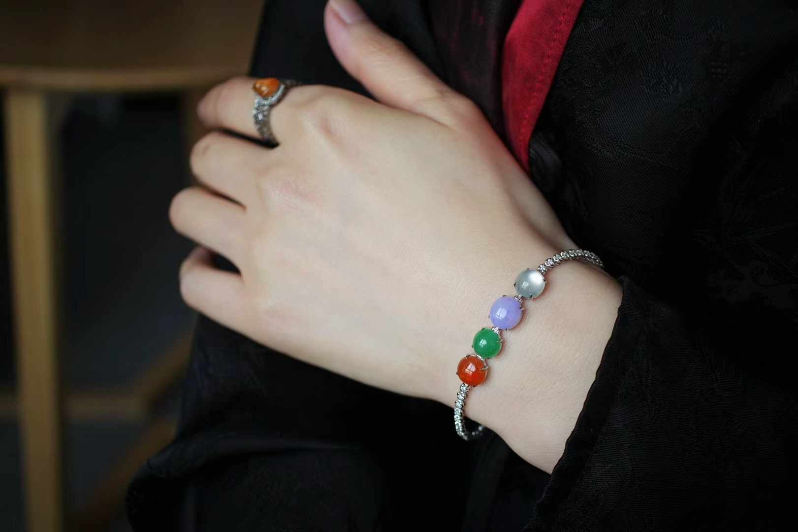 天然翡翠A玉,緬料,集齊冰種白、紫羅蘭、陽綠、紅翡的緬料四色翡翠蛋面手鏈,堪稱翡翠里的“彩寶盛宴”,每一顆蛋面都甄選緬料雕琢,冰種白翡瑩潤如月光,紫羅蘭溫婉似煙霞,陽綠鮮妍若春芽,紅翡明艷勝丹霞,四色銜接自然,把翡翠的色彩美學揉進腕間