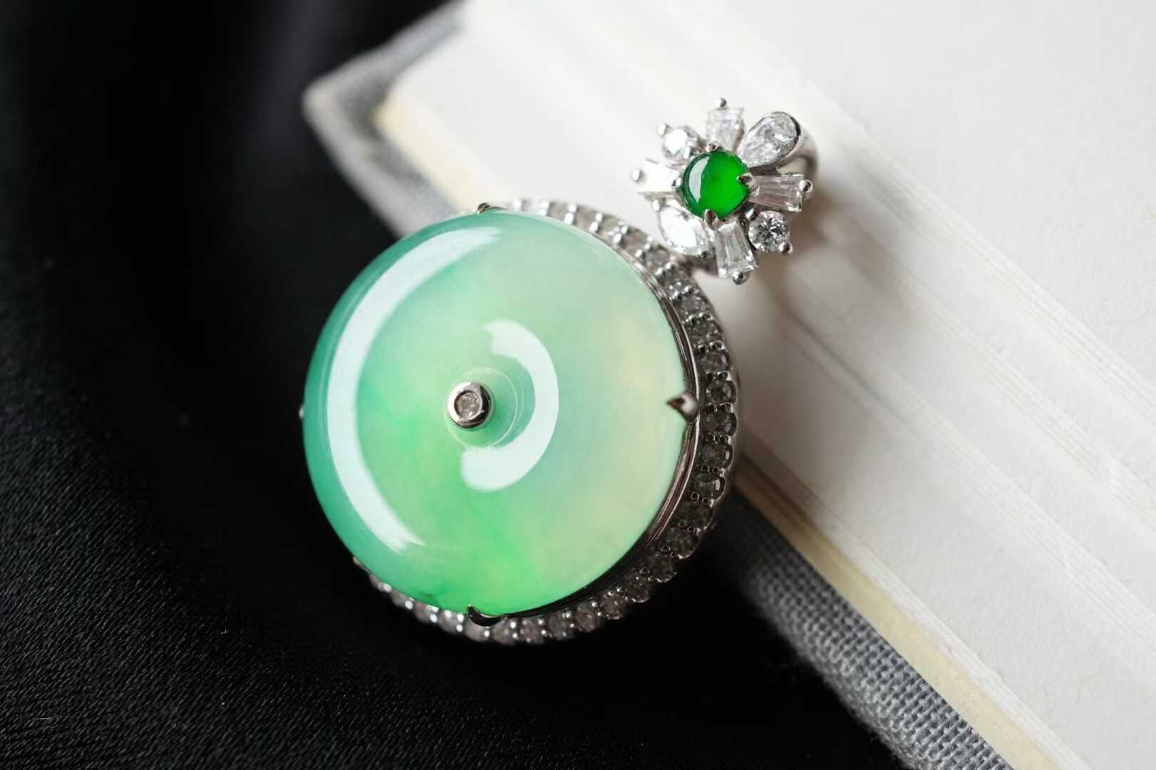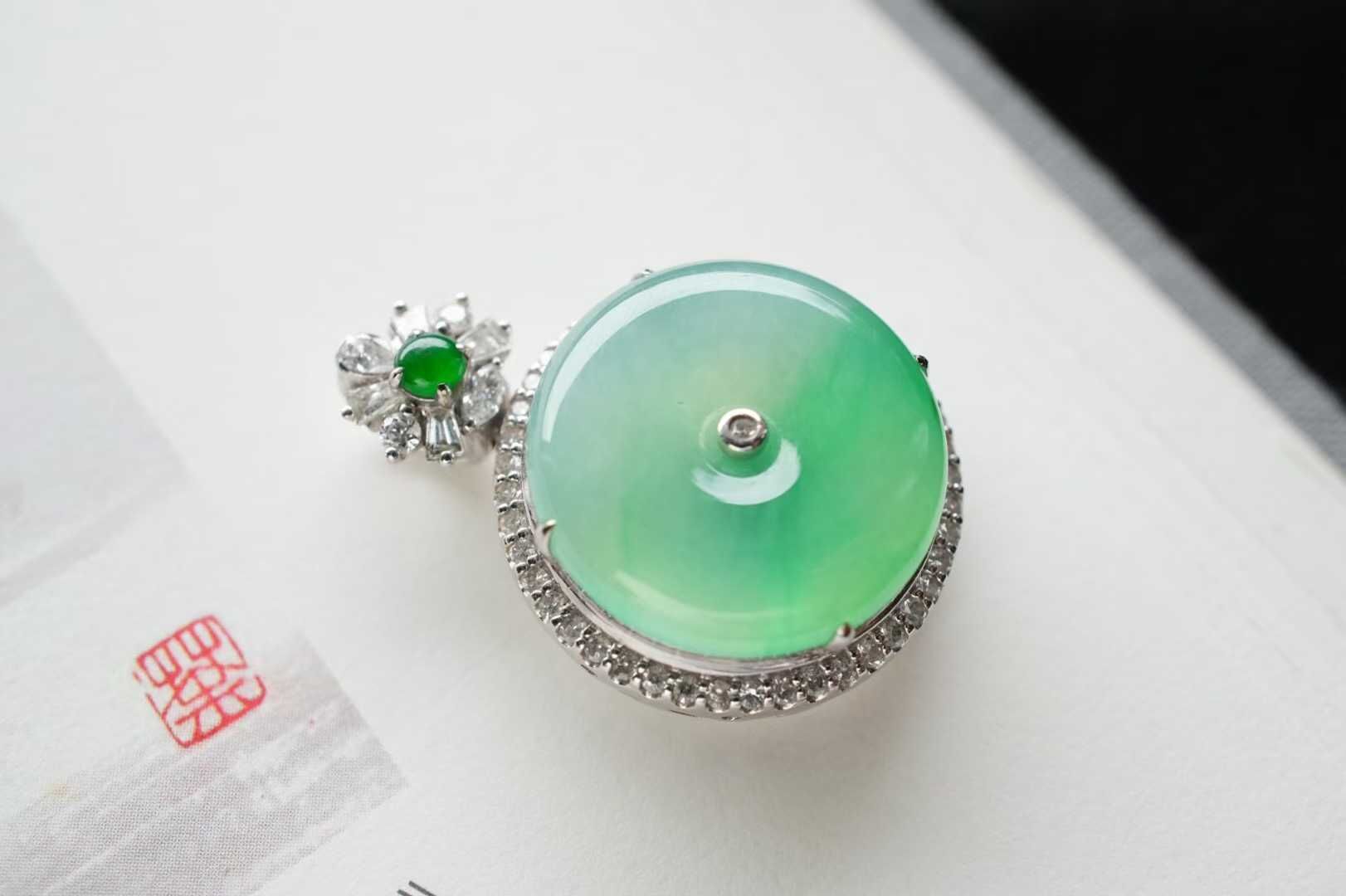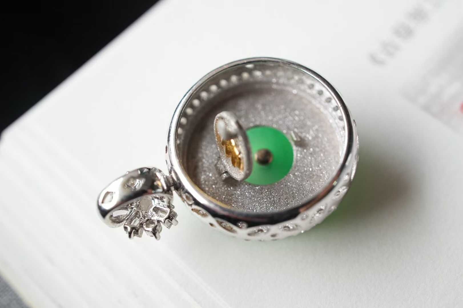 天然翡翠A玉,緬料,翠色明媚鮮甜,質地溫雅起膠感,器型優美圓潤,很是鮮嫩好看,18K金鑽石鑲嵌,點綴一顆冰陽綠蛋面,圓潤美好,平平安安。