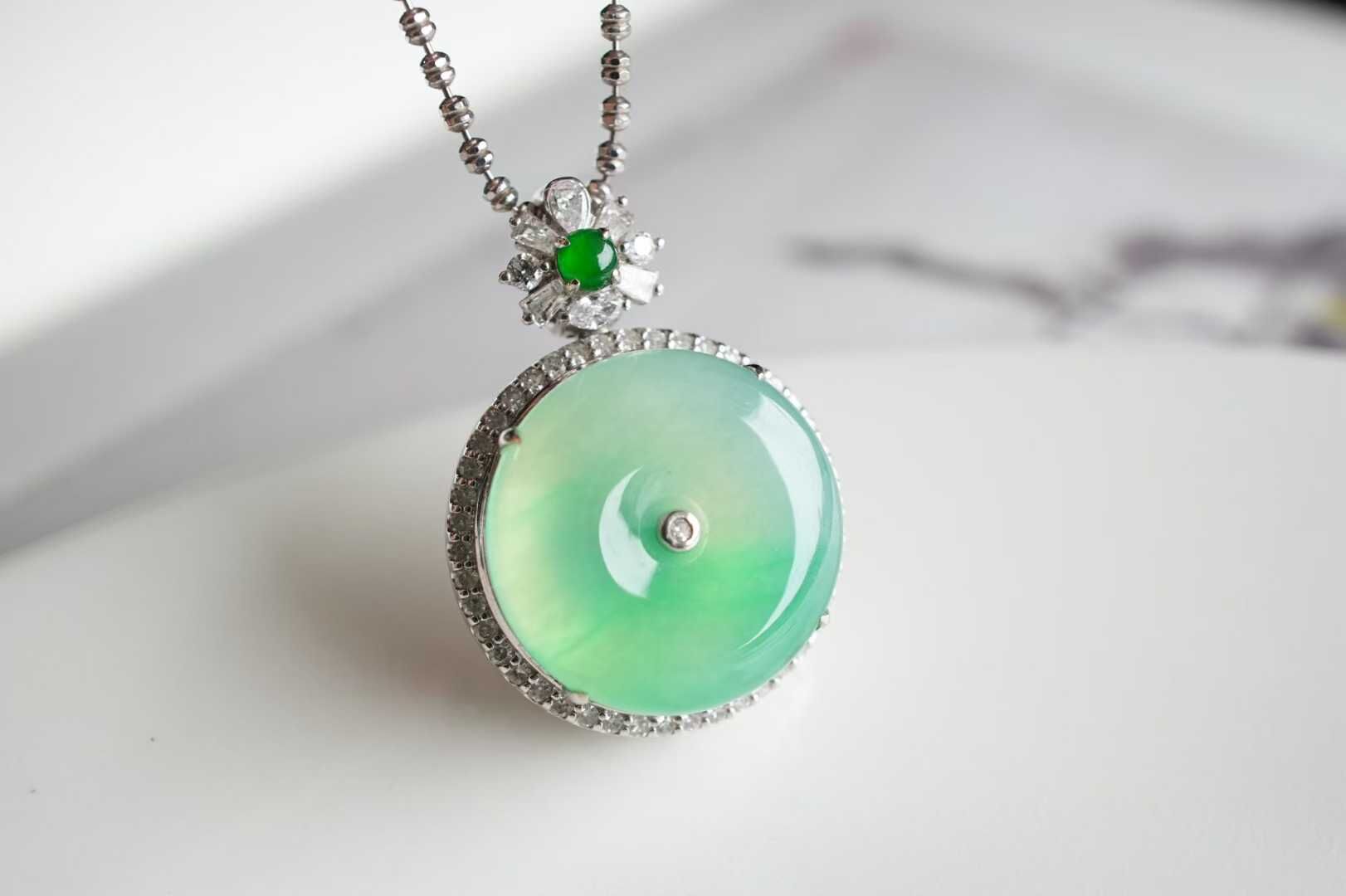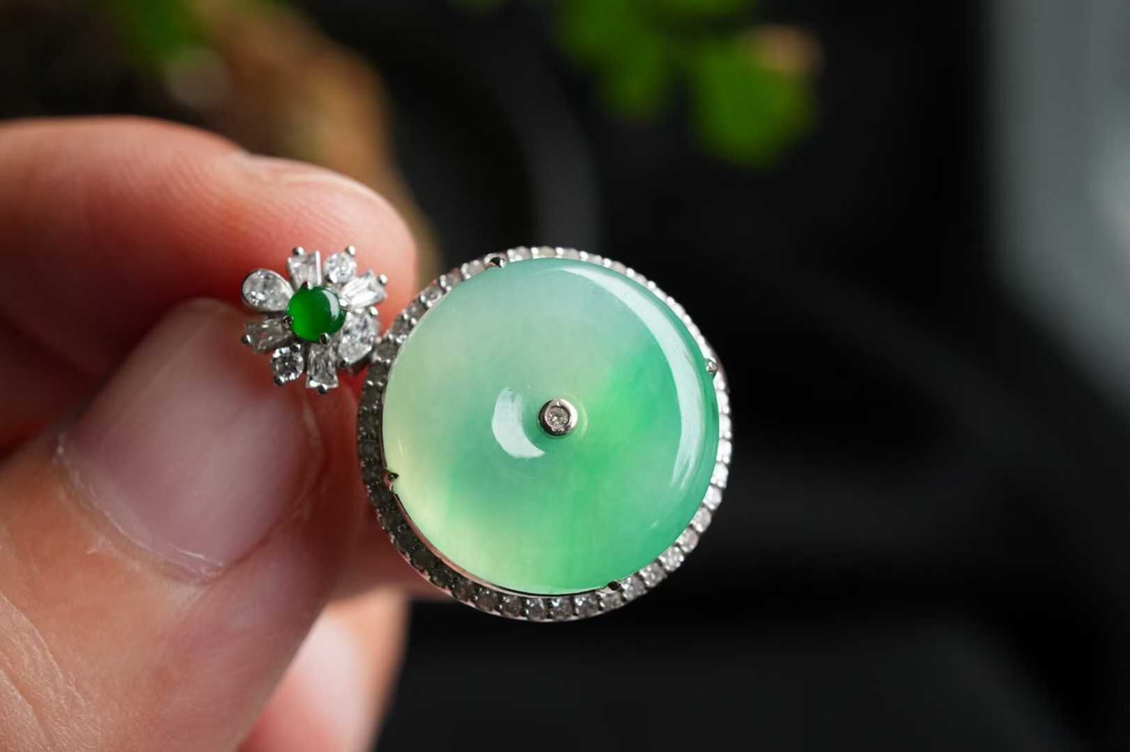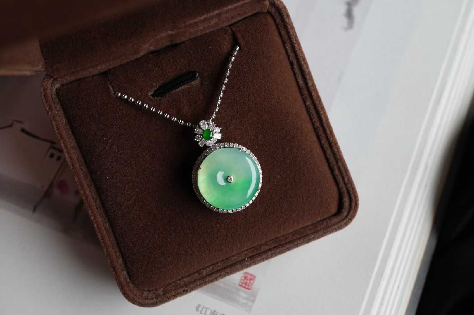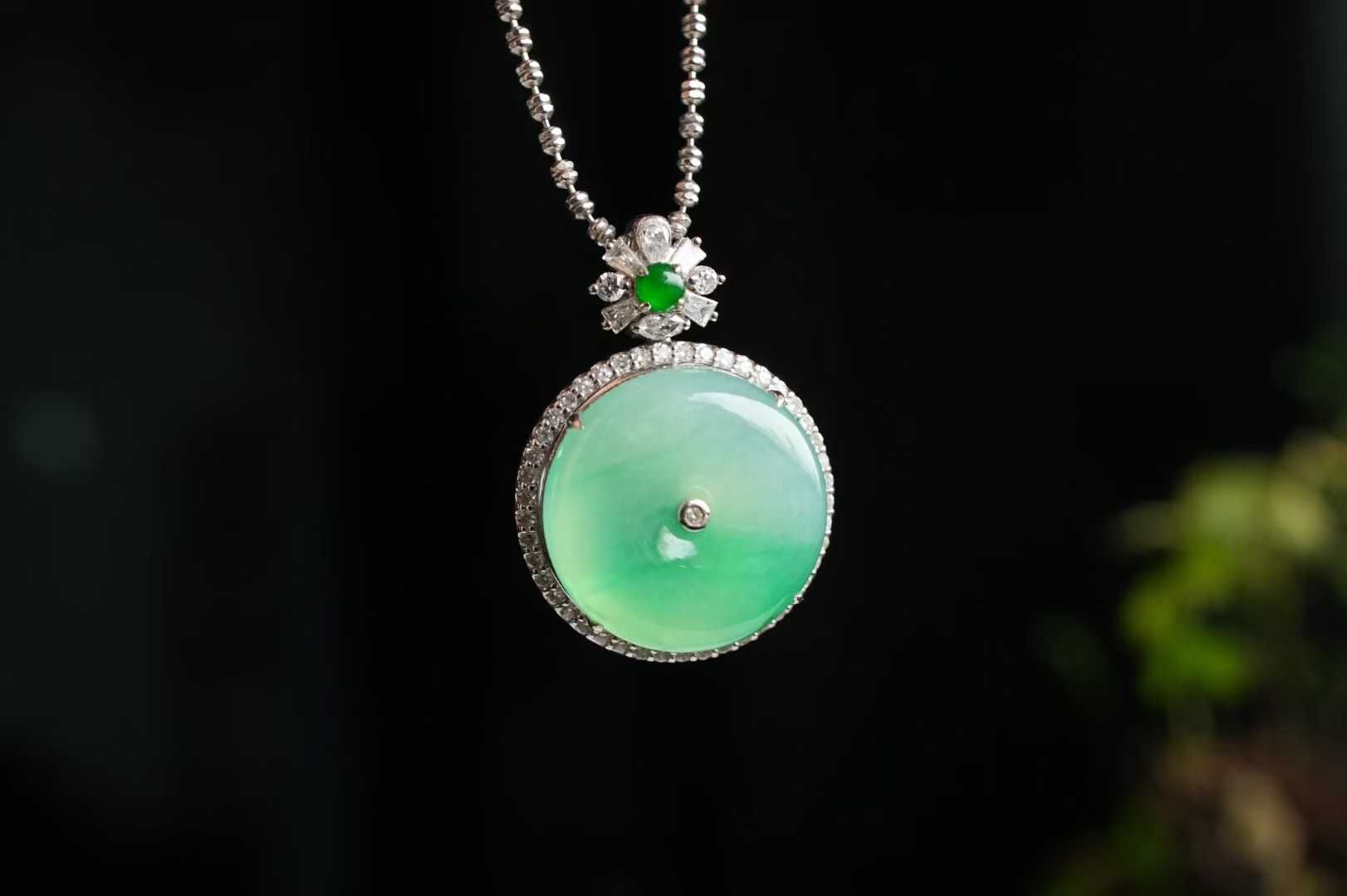 天然翡翠A玉,緬料,翠色明媚鮮甜,質地溫雅起膠感,器型優美圓潤,很是鮮嫩好看,18K金鑽石鑲嵌,點綴一顆冰陽綠蛋面,圓潤美好,平平安安。