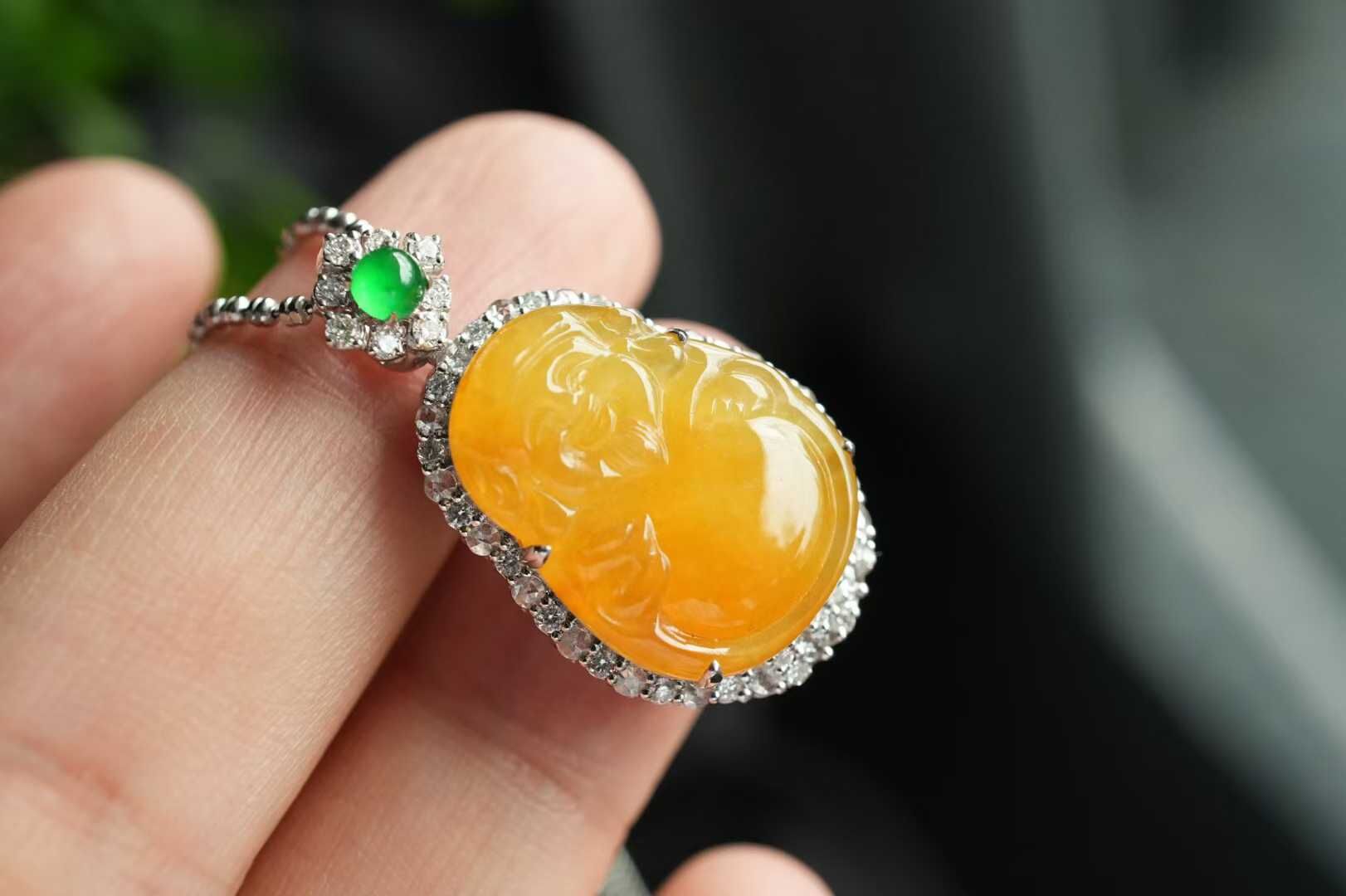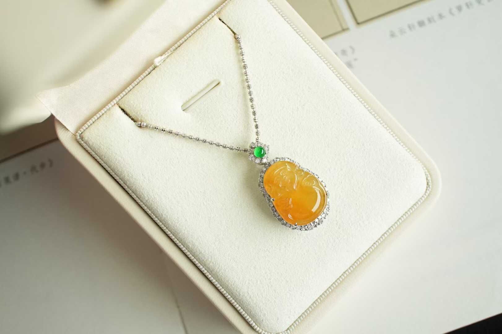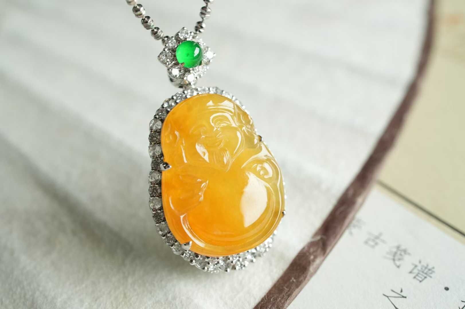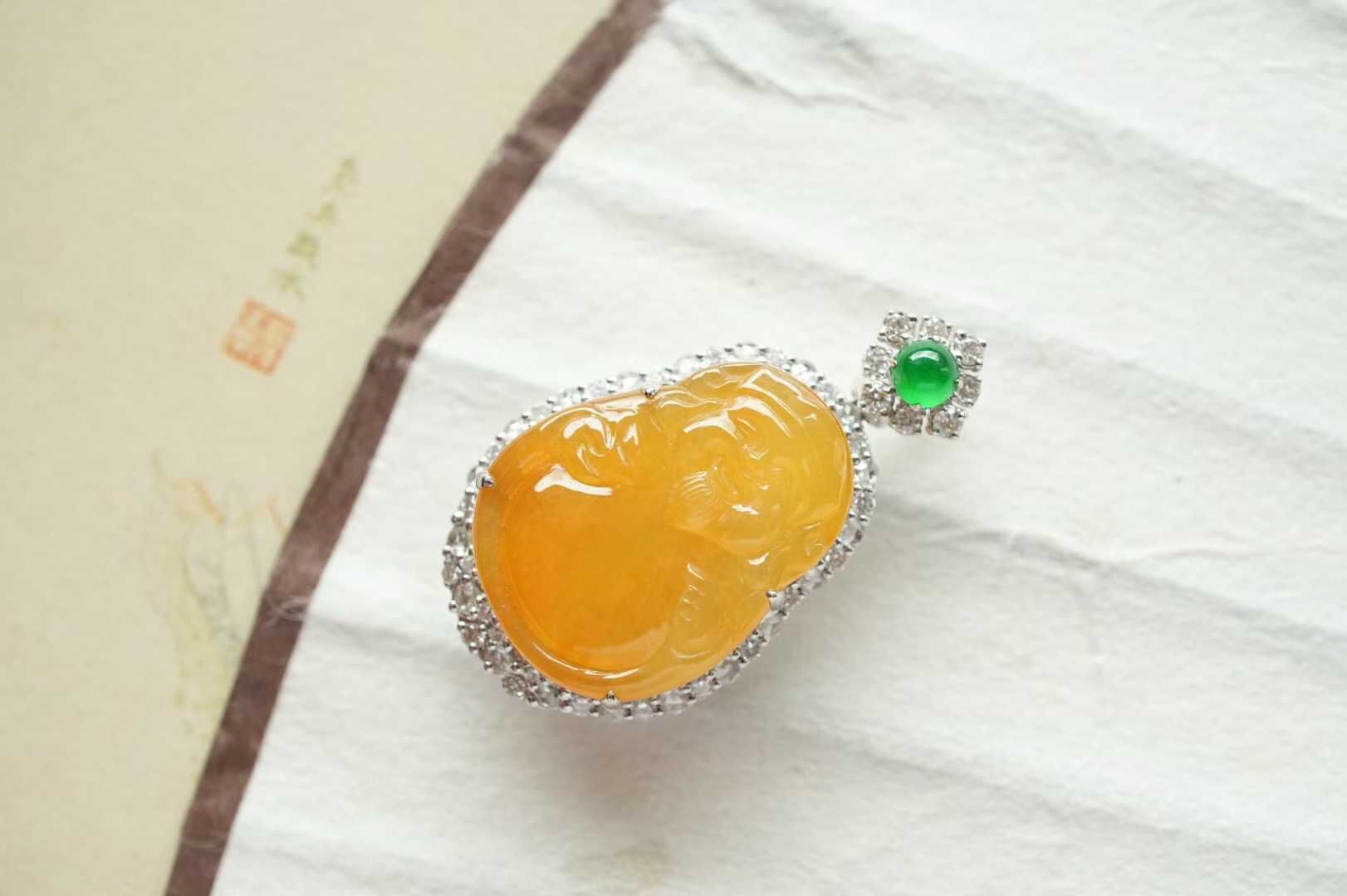 天然翡翠A玉,黃翡凝暉,財神賜運,是誰的小財神啊,冰種黃翡財神,精工雕琢,開臉樂呵呵的太討喜了,種色俱佳,18K金鑽石鑲嵌,精致珠寶感。