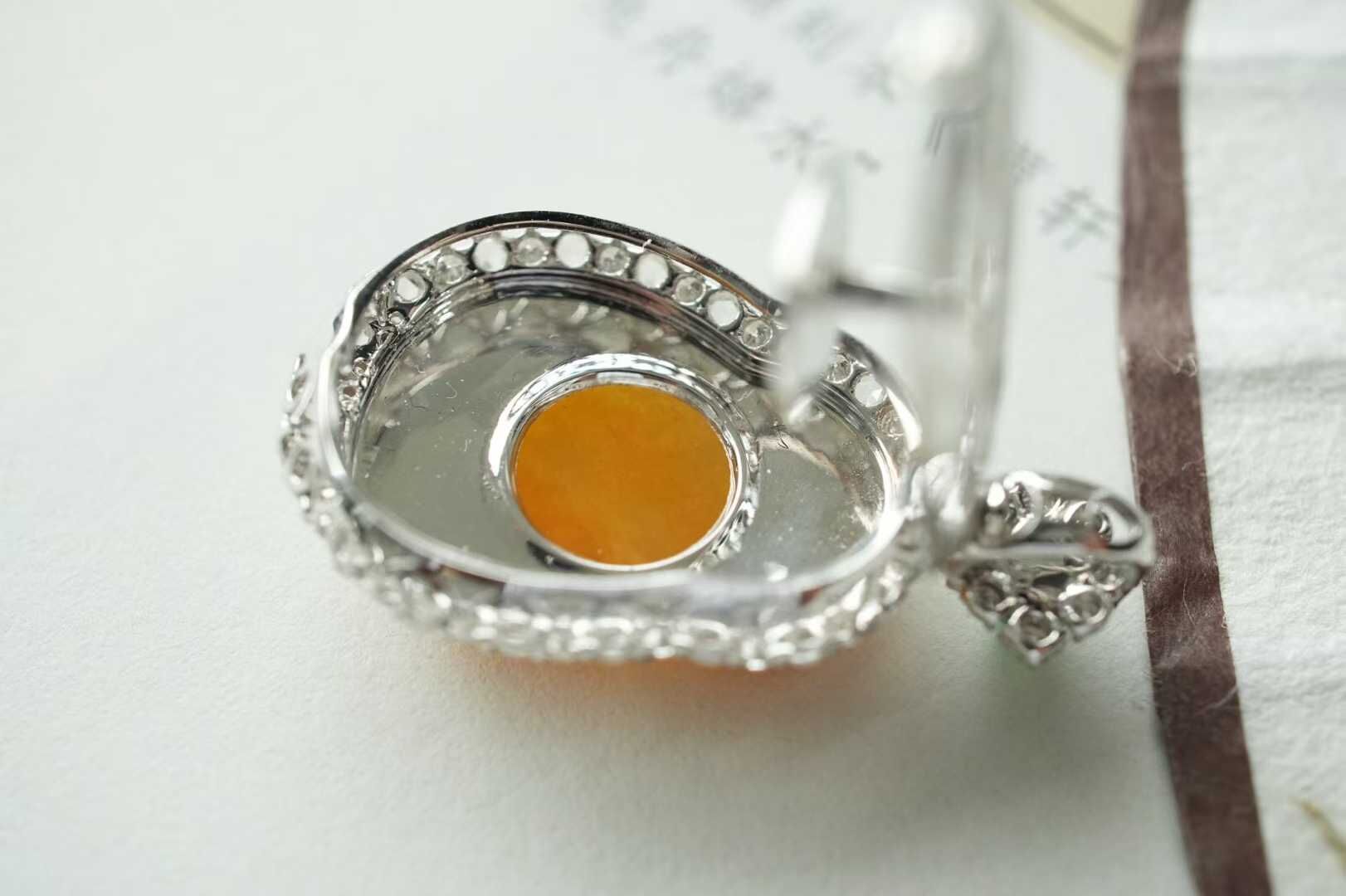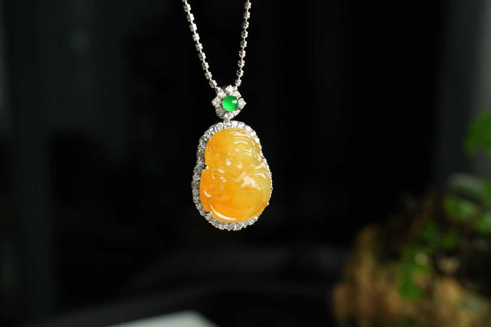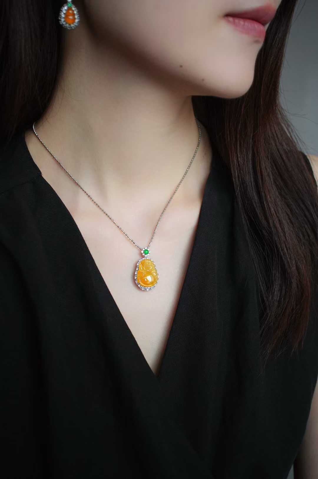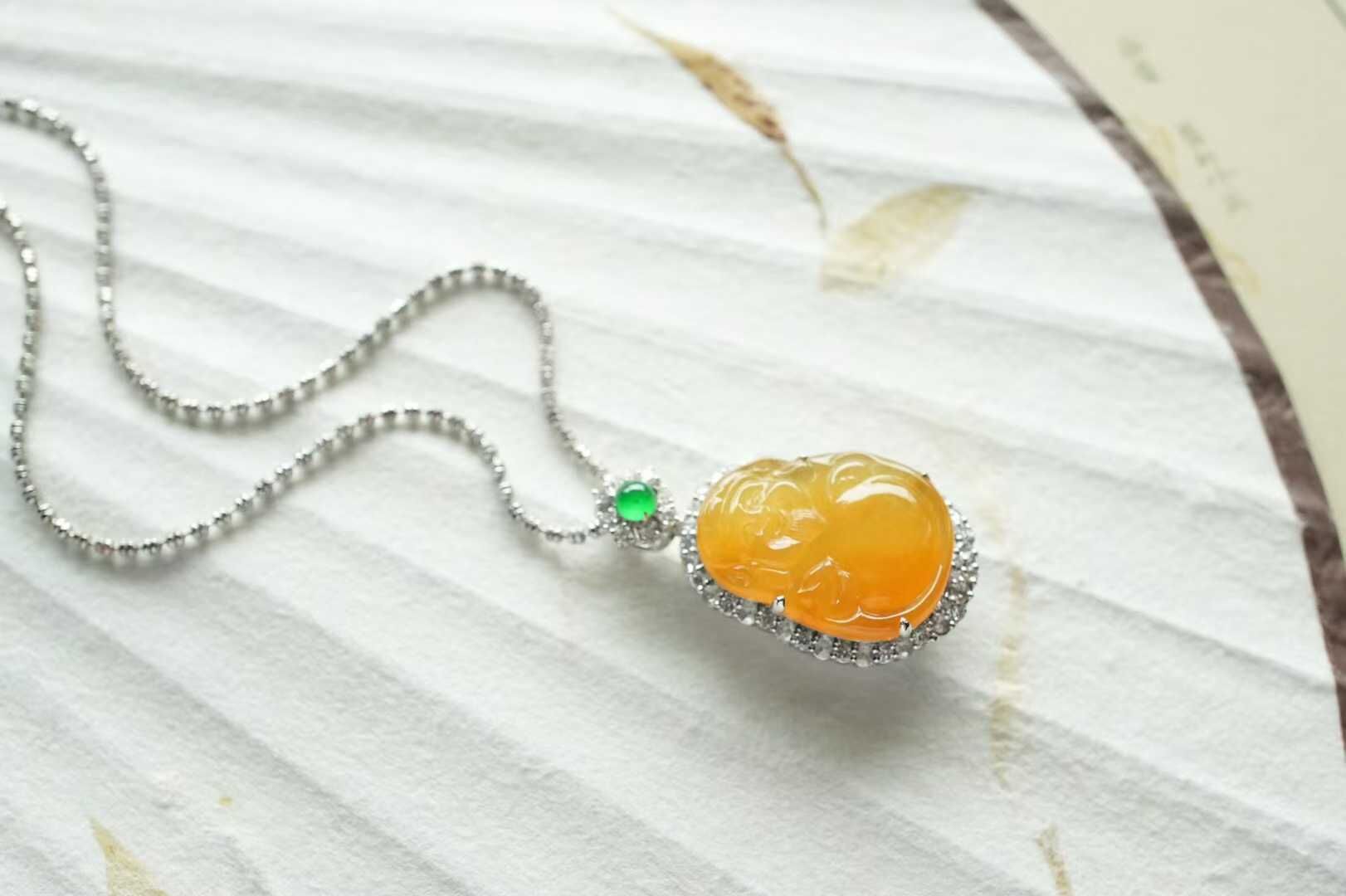 天然翡翠A玉,黃翡凝暉,財神賜運,是誰的小財神啊,冰種黃翡財神,精工雕琢,開臉樂呵呵的太討喜了,種色俱佳,18K金鑽石鑲嵌,精致珠寶感。