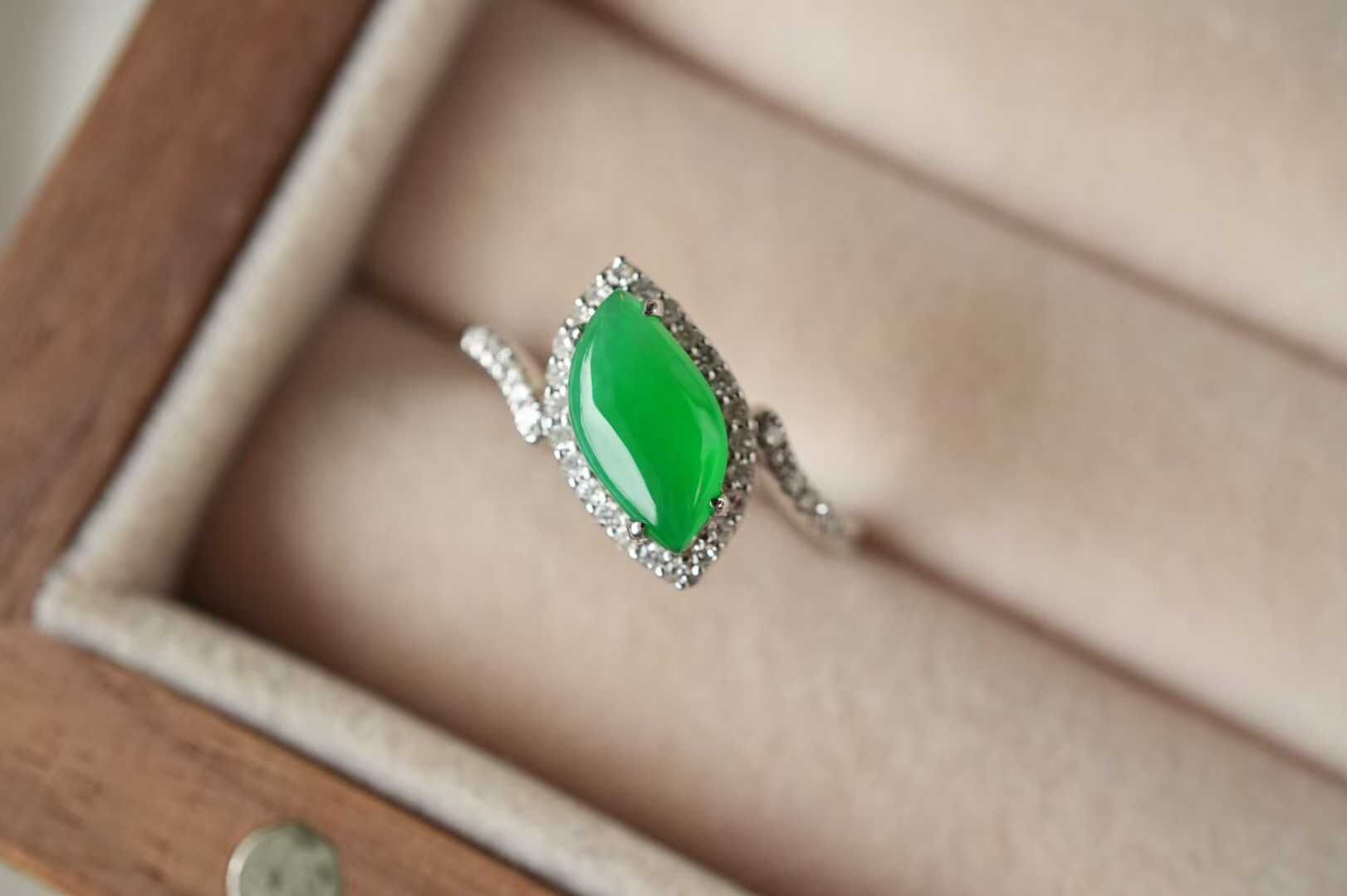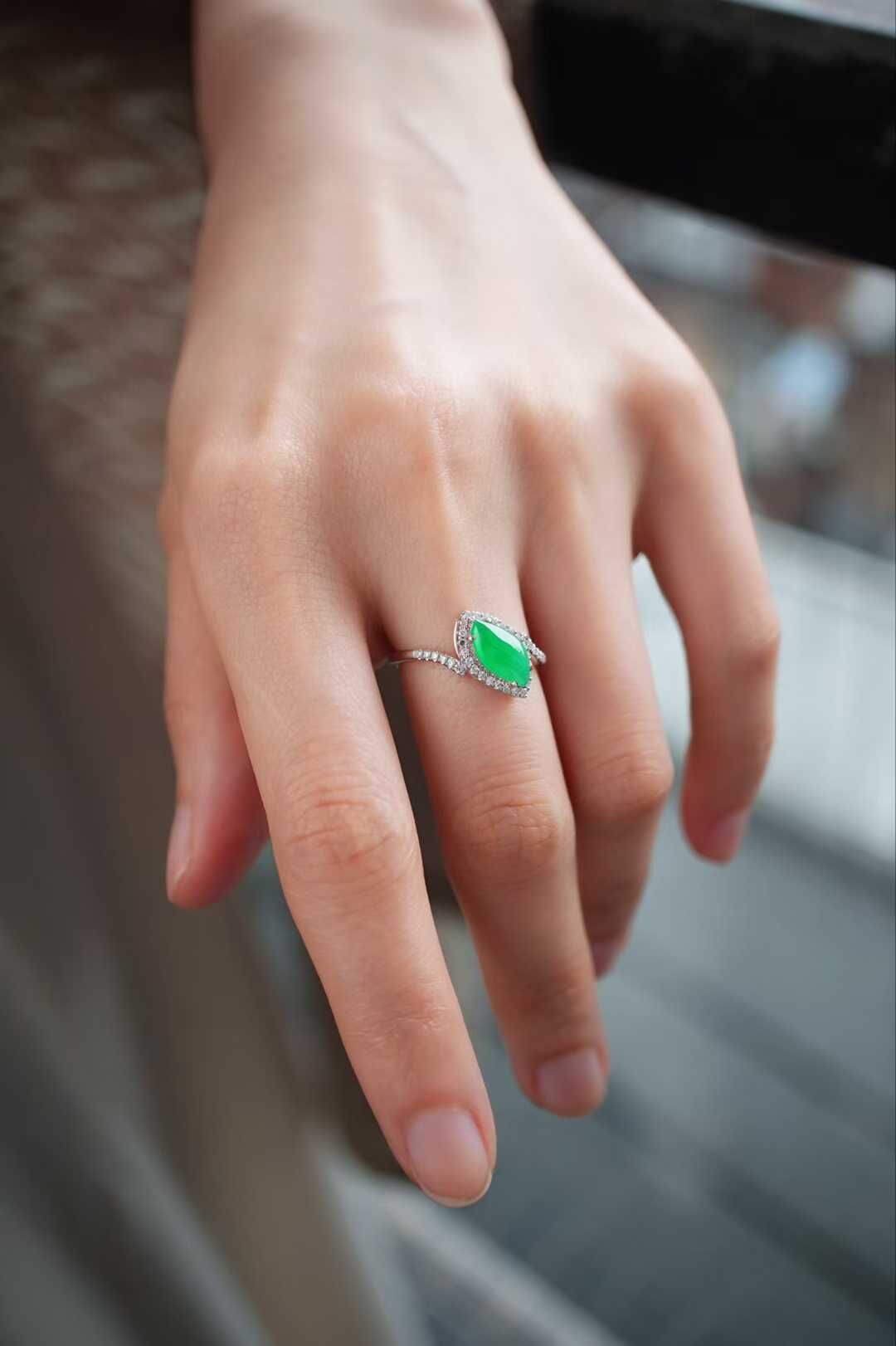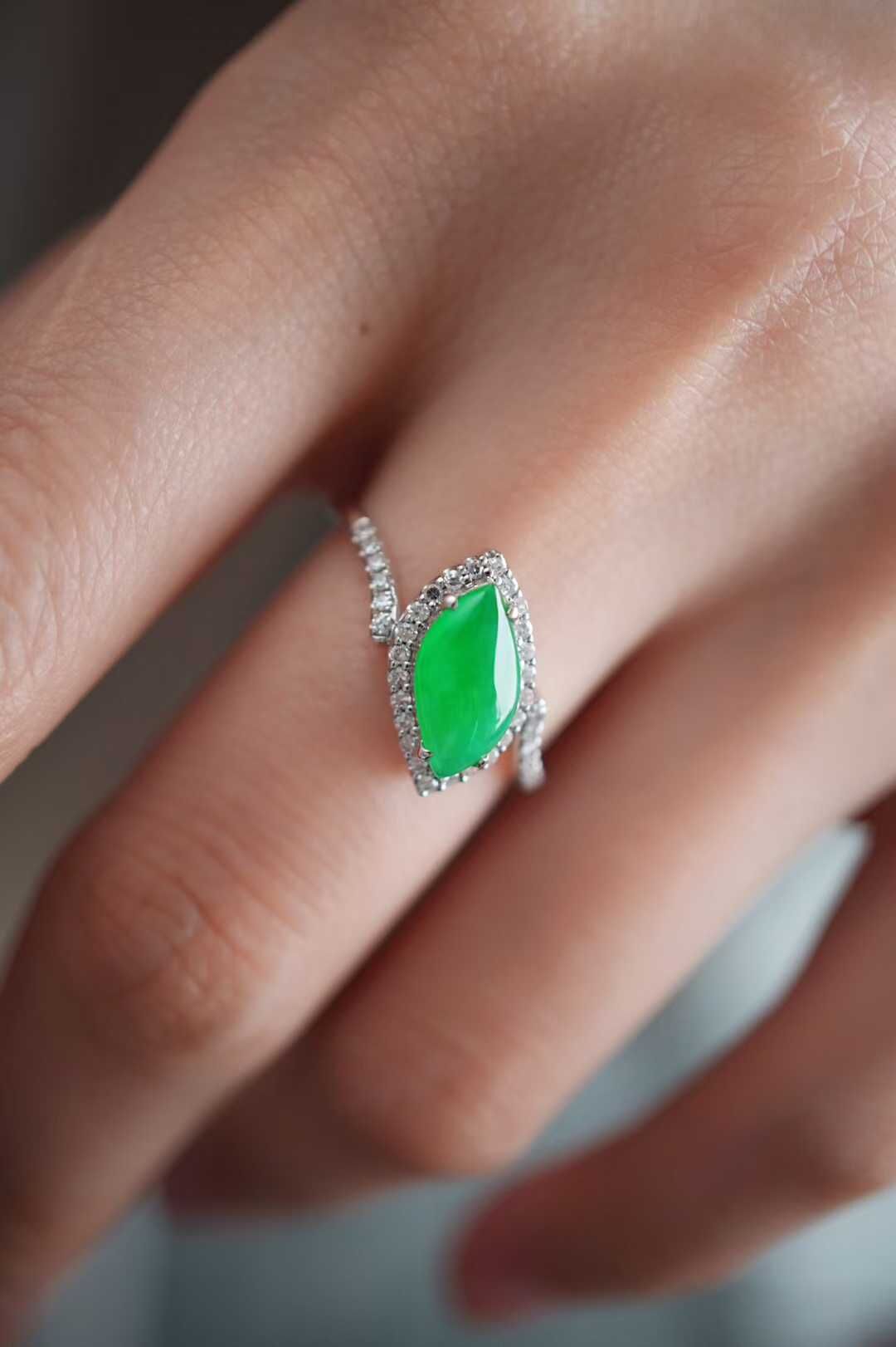 天然翡翠A玉,緬料老坑種冰陽綠,品質很好,隨性自然的美,獨特氣質,18K金鑽石鑲嵌,孤品不可復制。